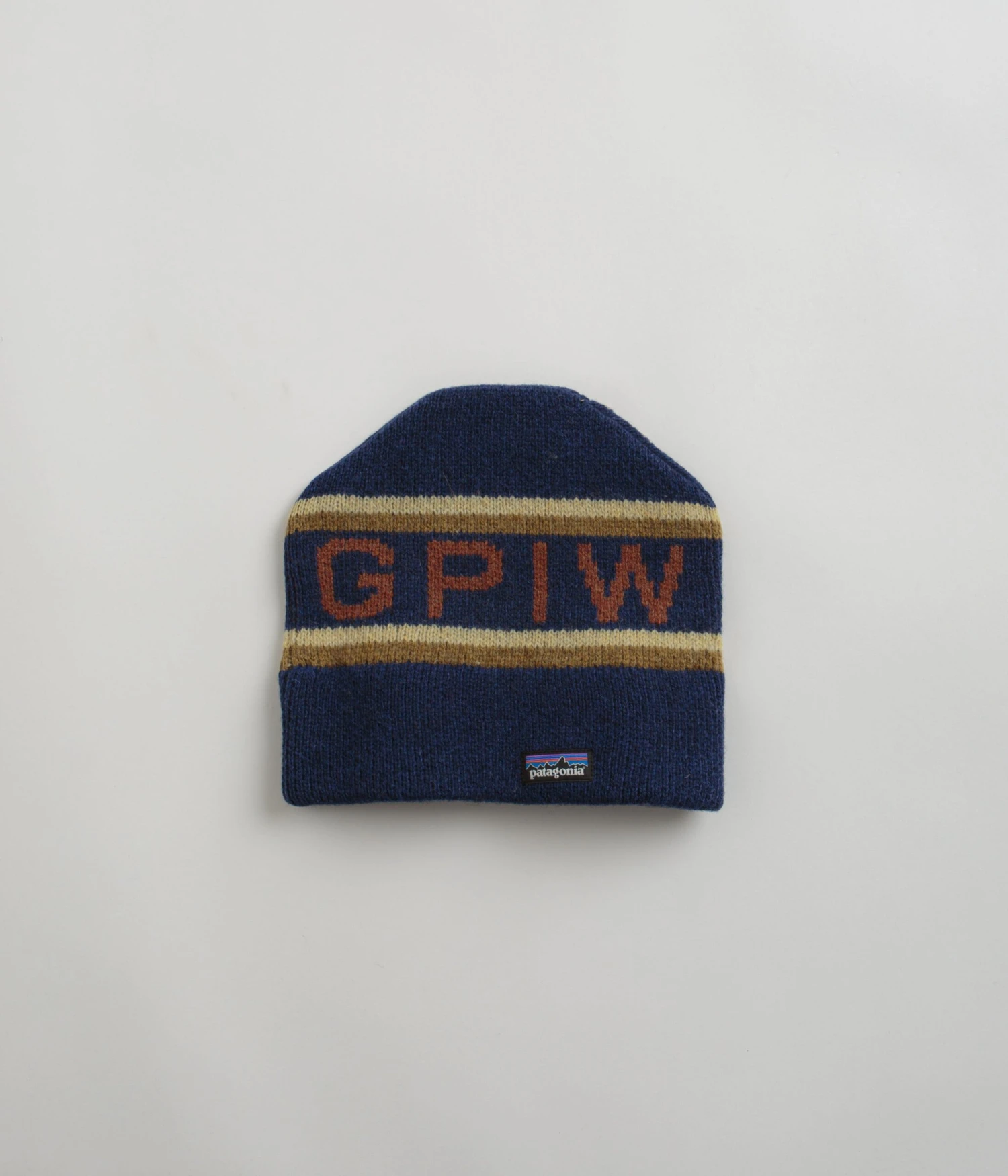 Patagonia Fun Hog Beanie in GPIW Knit: Stone Blue. Fair Trade Certifiedâ„¢ and single sized, this cuffless Patagonia beanie is made from recycled fabric with jacquard knit artwork. Finished in a shade of navy with GPIW artwork and woven P-6 flag label branding.