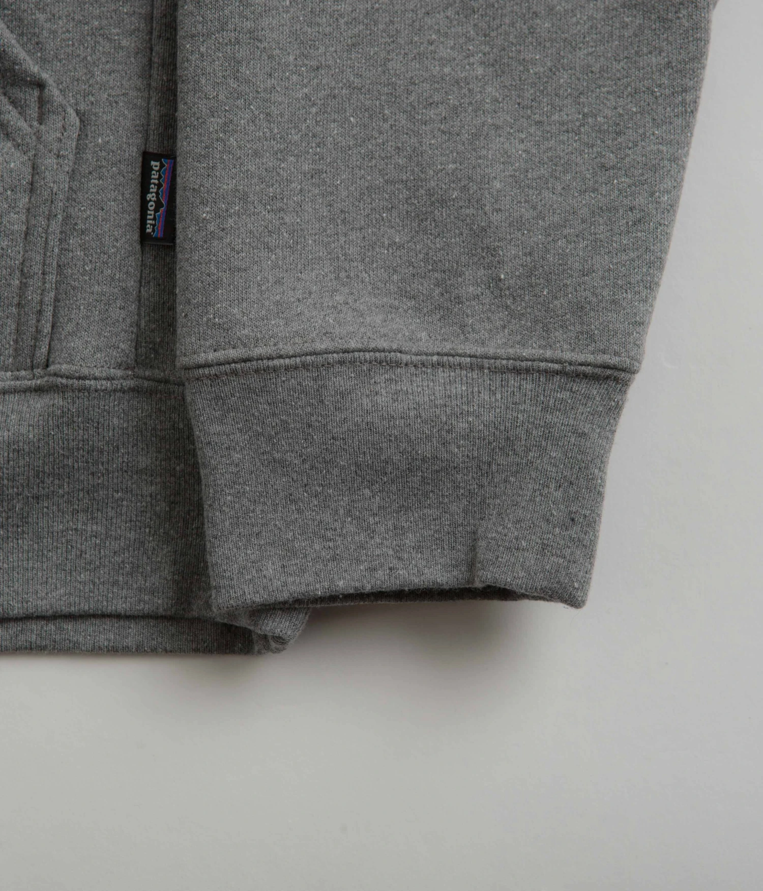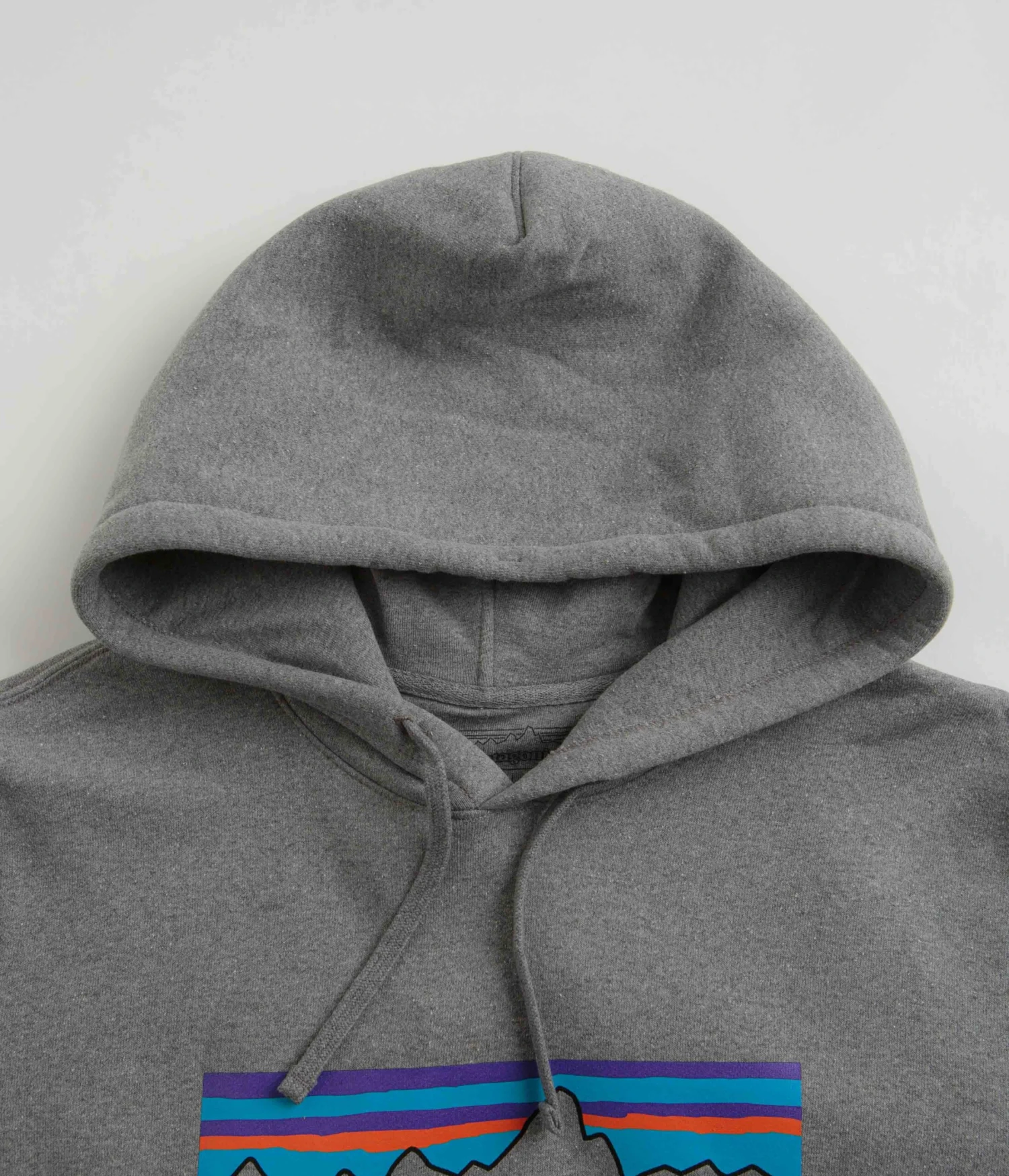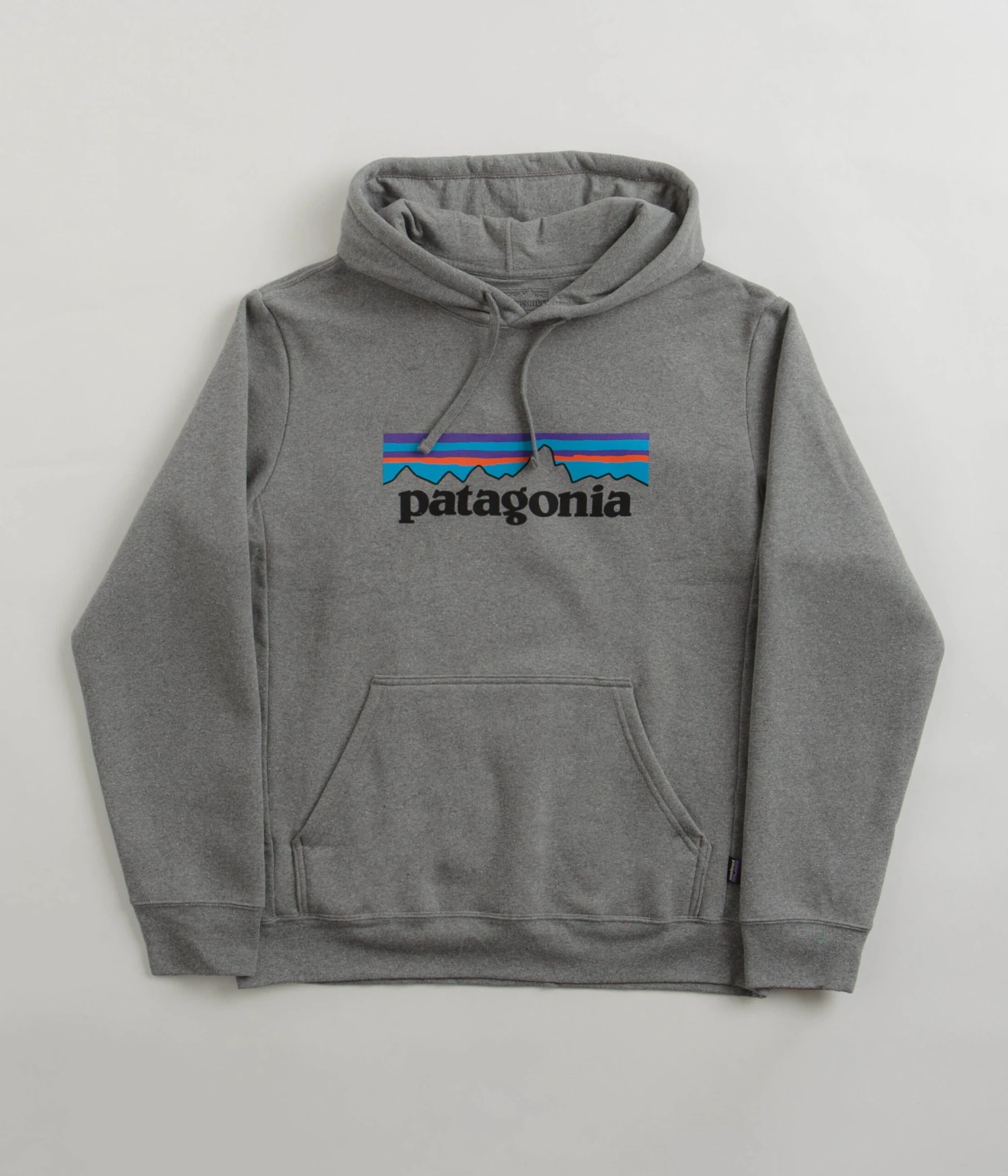 Patagonia P-6 Logo Uprisal Hoodie in Gravel Heather. Crafted from a heavyweight blend of 47.5% recycled cotton, 47.5% post consumer recycled polyester and 5% spandex fleece, this heather grey Patagonia hoodie is designed to provide ample insulative warmth when paired with any everyday setting. Tailored to a regular fitting and Fair Trade Certified sewn, this long sleeve layer features cuffed sleeves, a thick rib elasticated hemline and a spacious deep set hooded neckline that’s easily adjusted by its tonal drawcord fastenings beneath. Above the waist, a practical dual entry kangaroo pocket provides the wearer with ample stash space to suit, whilst the bold black ‘Patagonia’ branding across the upper chest is paired with a PVC and phthalate-free print of the brand’s iconic P-6 logo.
