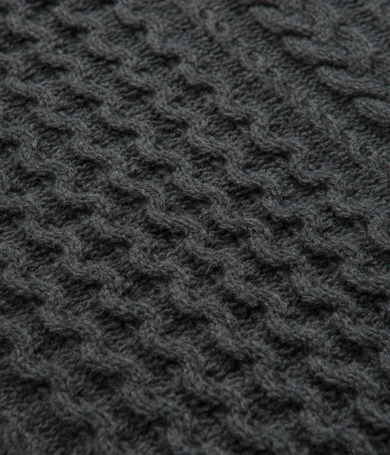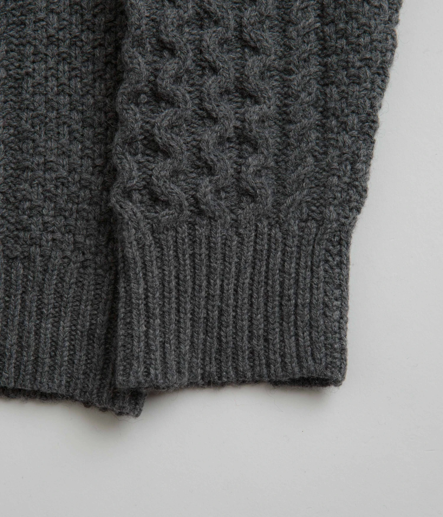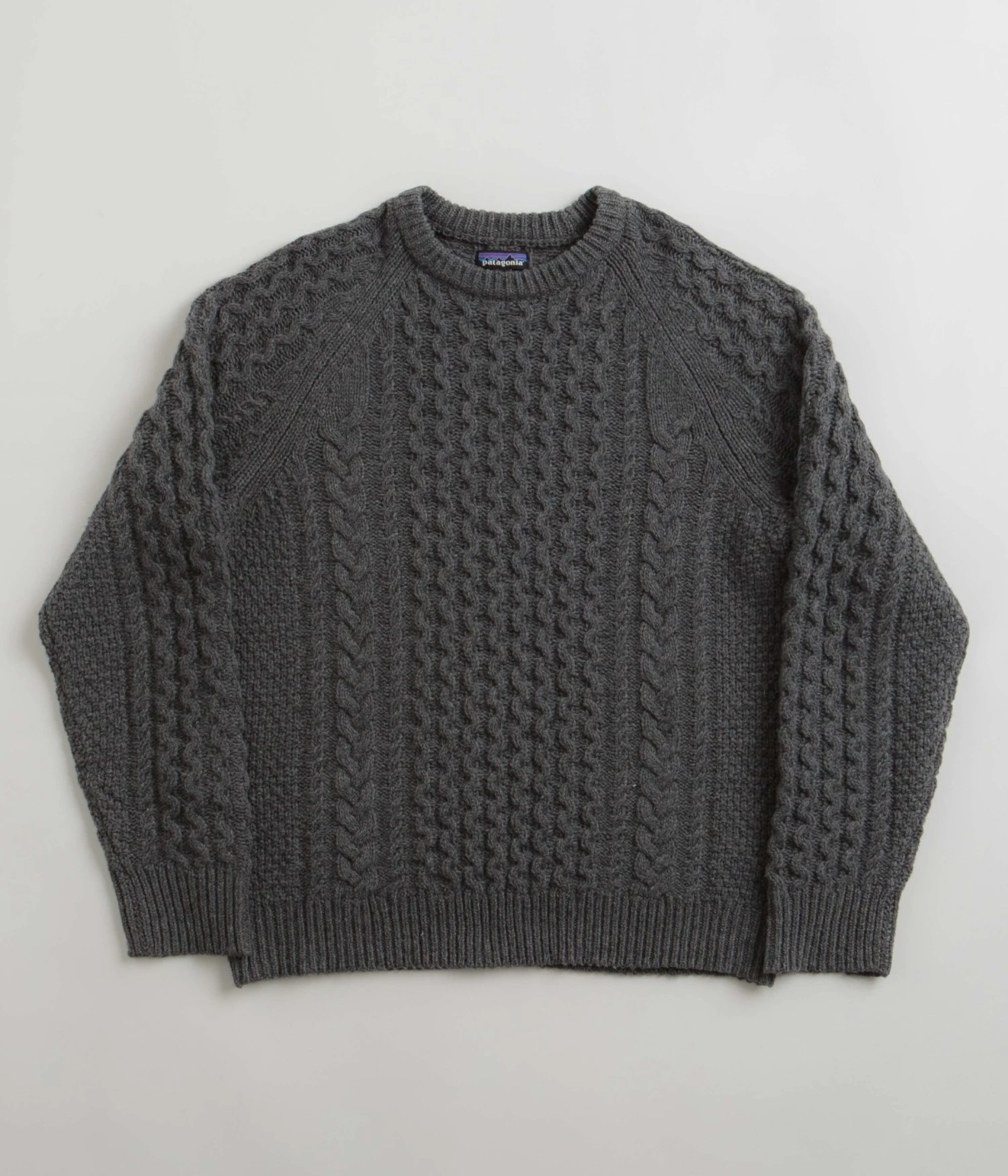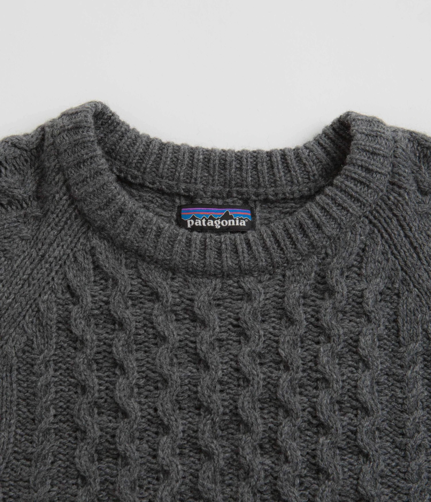 Patagonia Recycled Cable Knit Crewneck Sweatshirt in Hex Grey. Tailored to a unisex fitting, this Fair Trade Certifiedâ„¢ sweatshirt is made from a recycled fabric blend with a 3-gauge fisherman knit. Featuring 1×1 tubular rib knit trims and raglan sleeves, this grey Patagonia sweater is finished with a hand-linked construction with tonal stitched seams.
