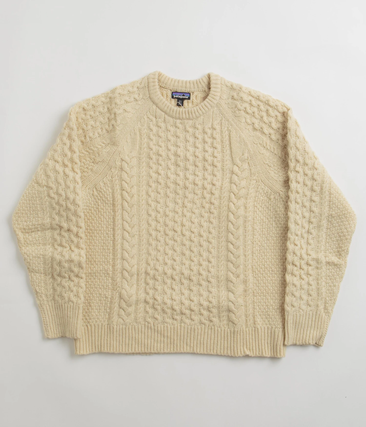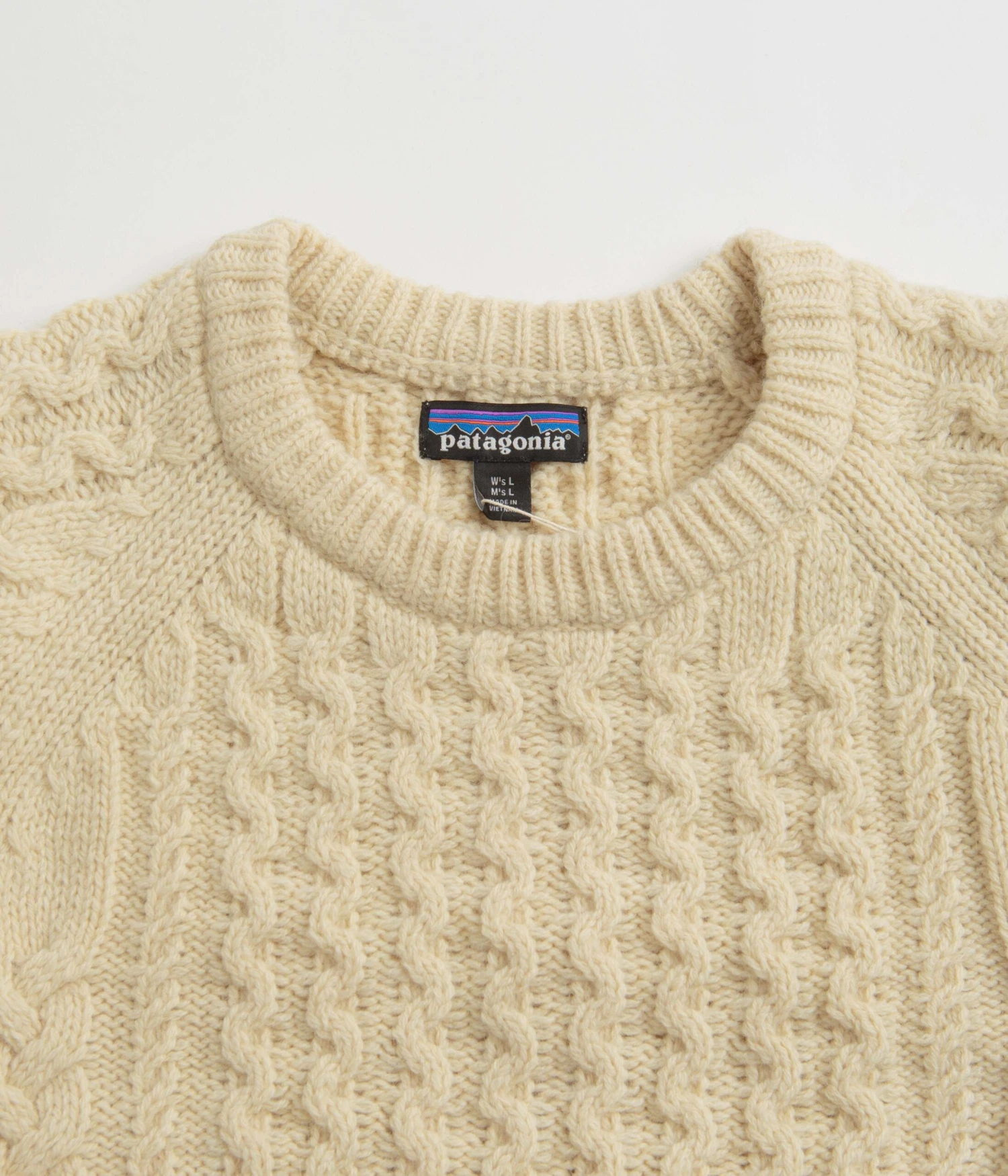 Patagonia Recycled Cable Knit Crewneck Sweatshirt in Natural. Vintage inspired and Fair Trade Certifiedâ„¢, this unisex fitting Patagonia sweatshirt is made from a recycled fabric blend. Featuring a 3-gauge fisherman knit with 1×1 tubular rib knit trims, this natural Patagonia sweater is finished with a ribbed crew collar, raglan sleeves and a hand-linked finish.