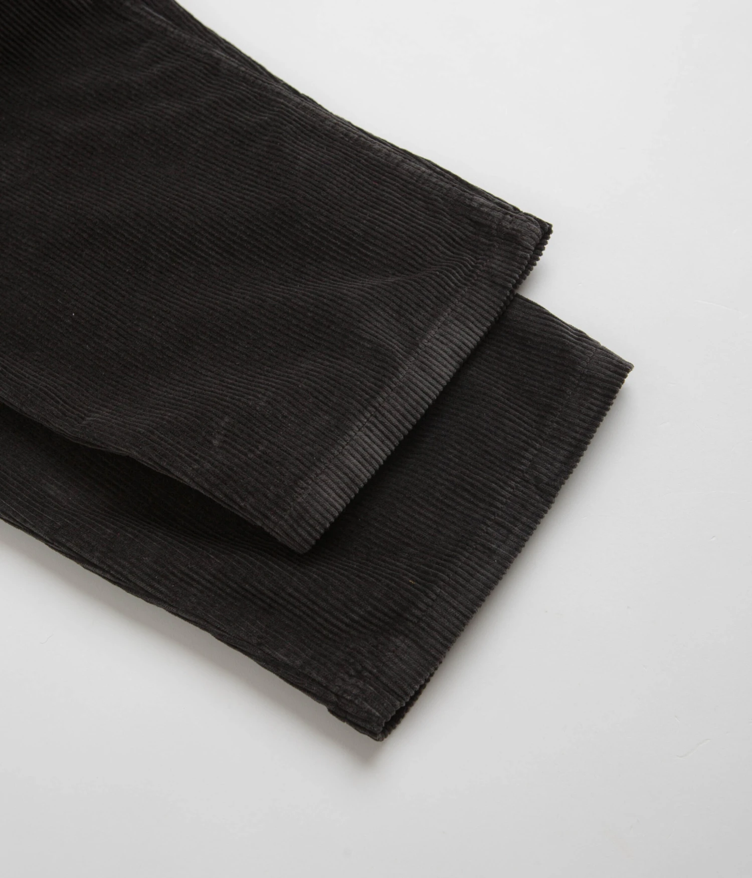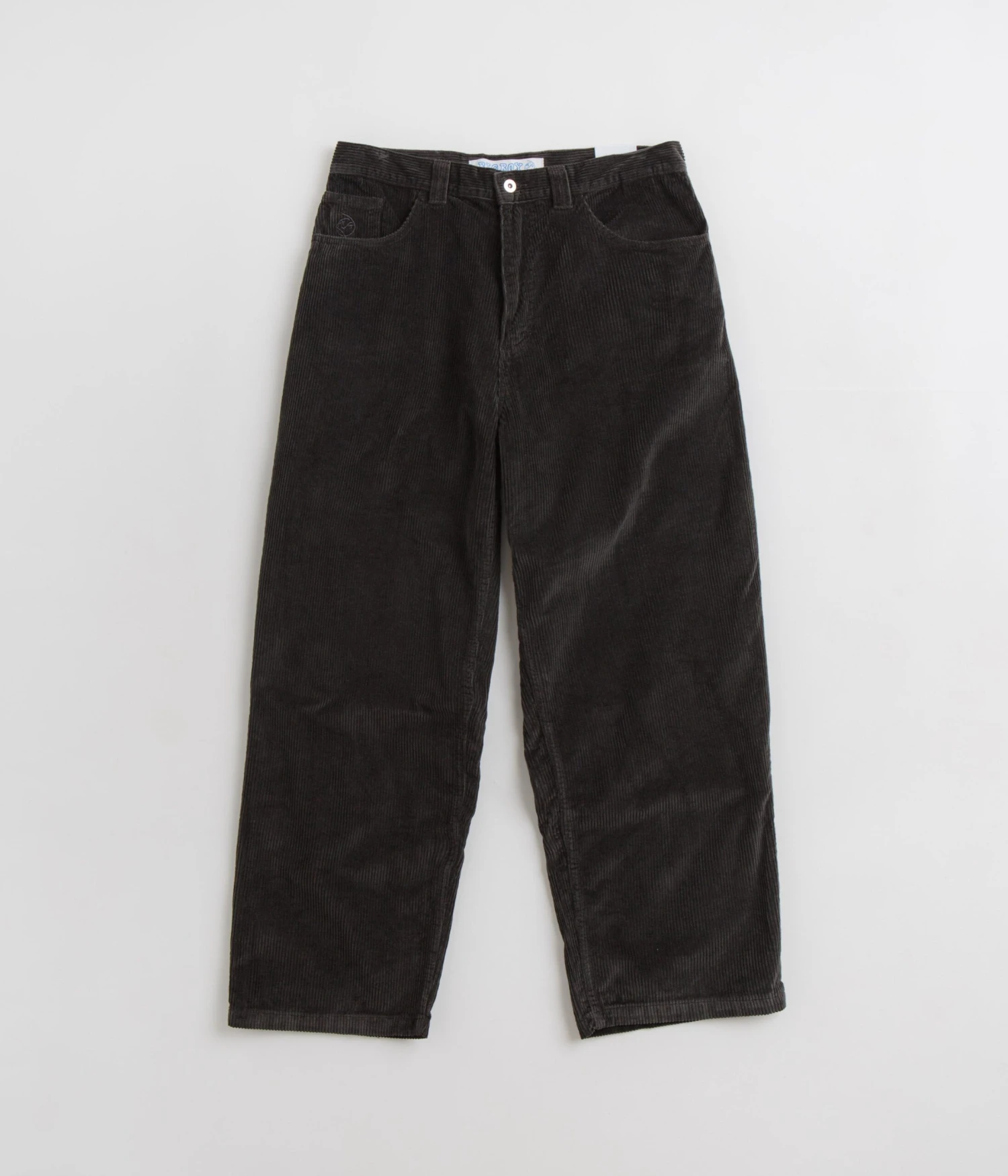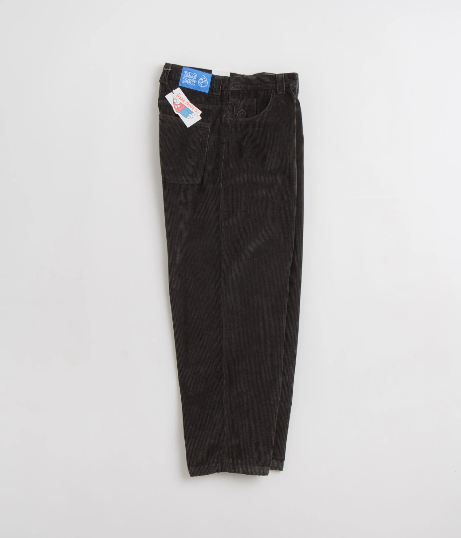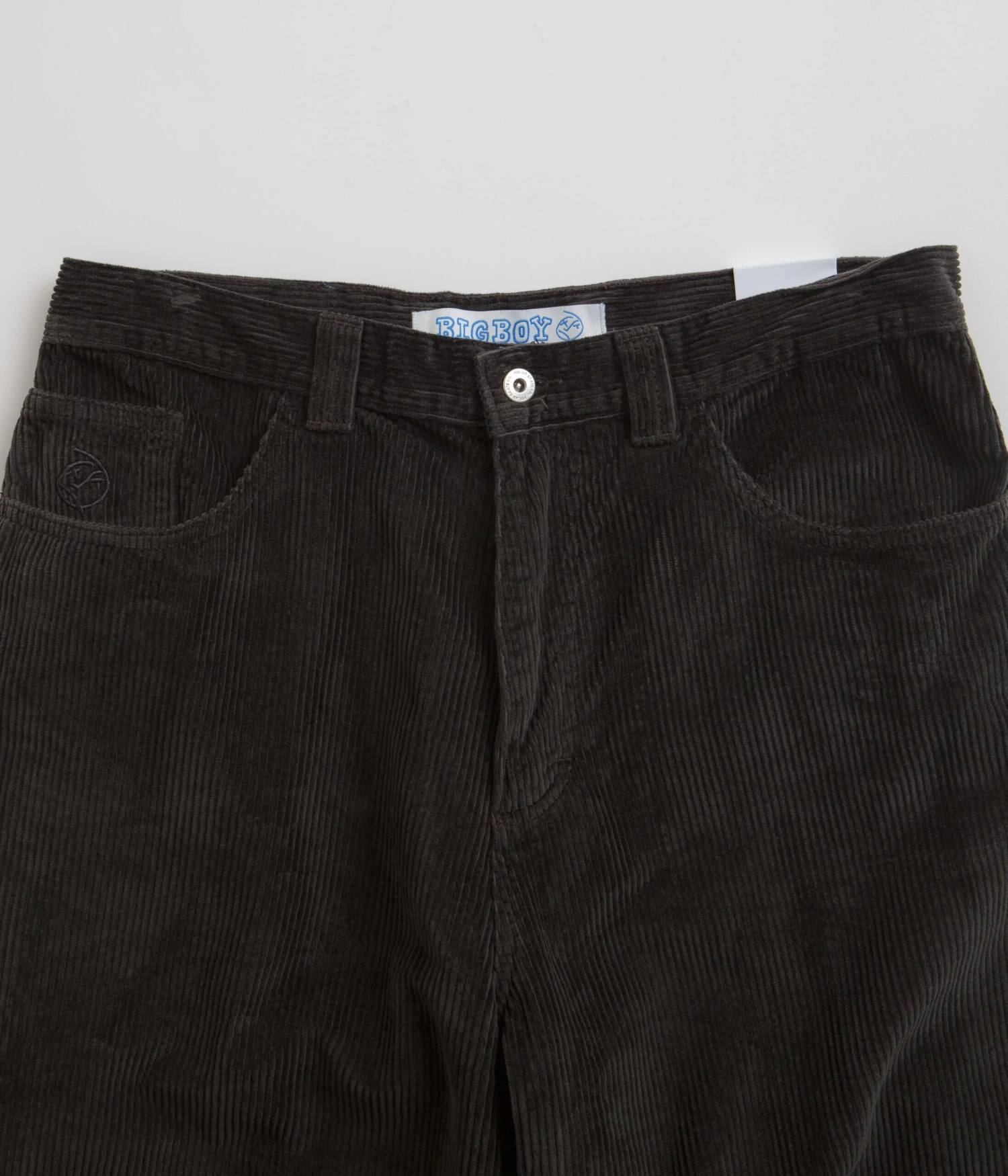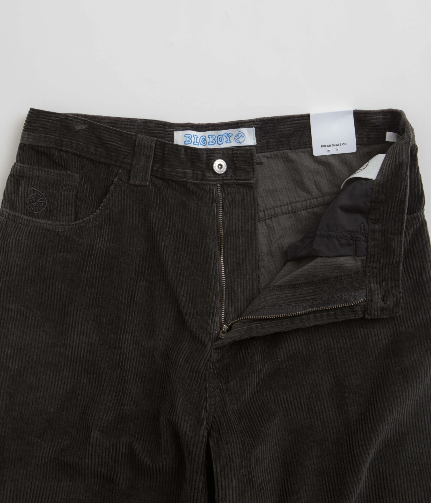 Polar Big Boy Cord Pants in Dirty Black. Tailored to a baggy fitting from 100% cotton, these 8-wale Polar pants are styled with a tapered leg and tonal stitched seams. Featuring a single button secured zipper fly and a classic belt loop waist, these black Polar pants are finished with four classic pockets, an embroidered coin pocket and a woven Big Boy rear belt patch.