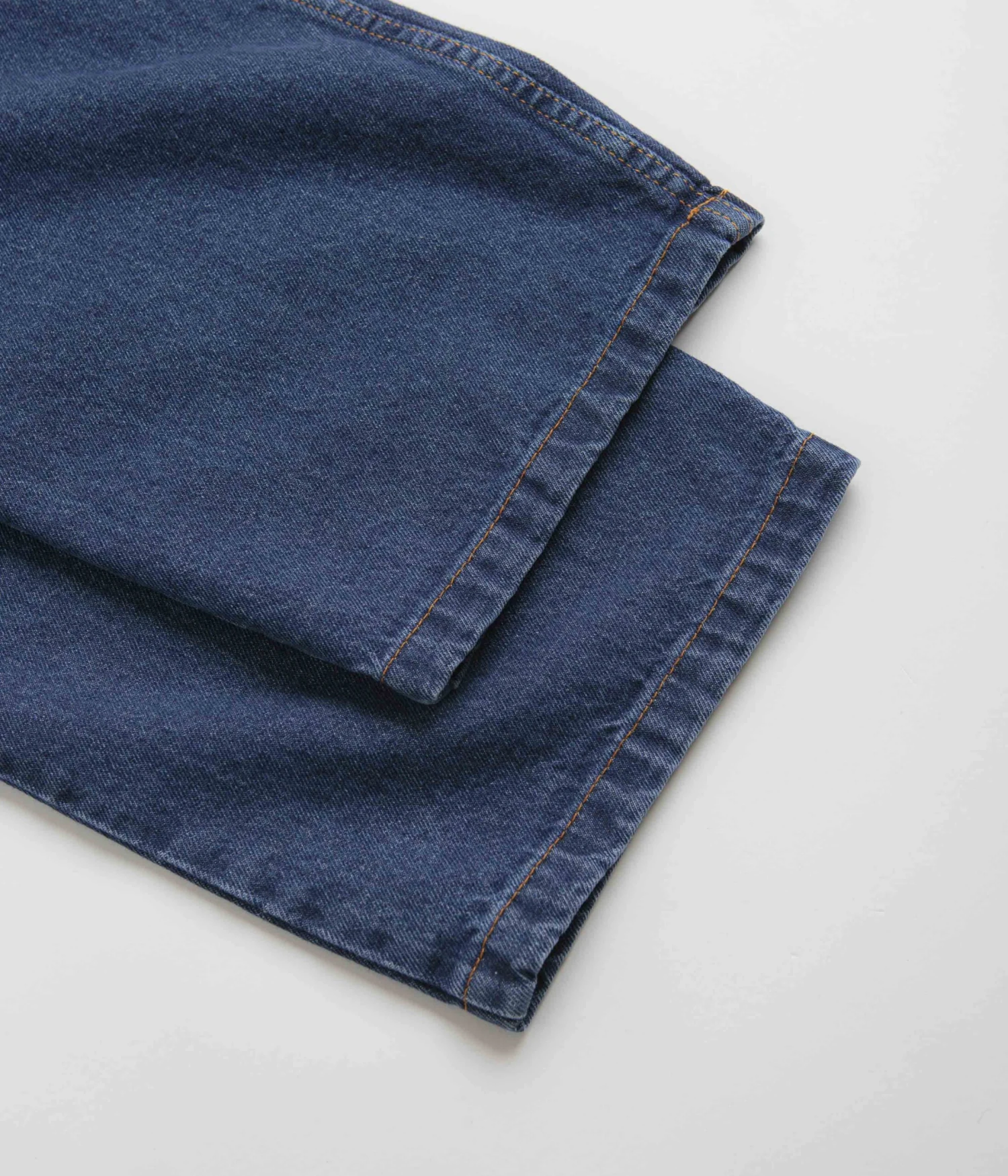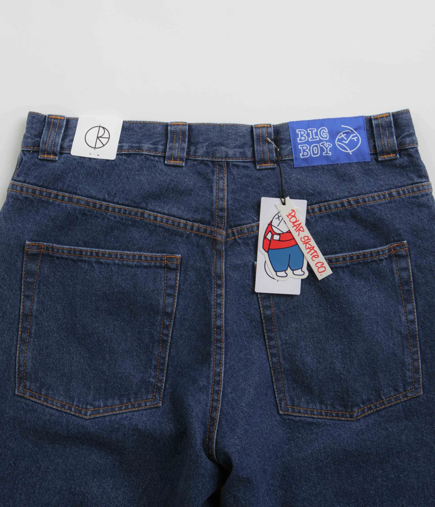 Polar Big Boy Jeans in Dark Blue. Styled with contrast stitching and a tapered cut, these Polar jeans are made from 100% cotton and are tailored to a baggy fitting. Featuring a classic belt loop waistband with a single button secured YKK zipper fly, these dark blue Polar jeans are finished with two front pockets, two rear pockets, an embroidered coin stash and with a woven Big Boy belt patch sewn across the rear.
