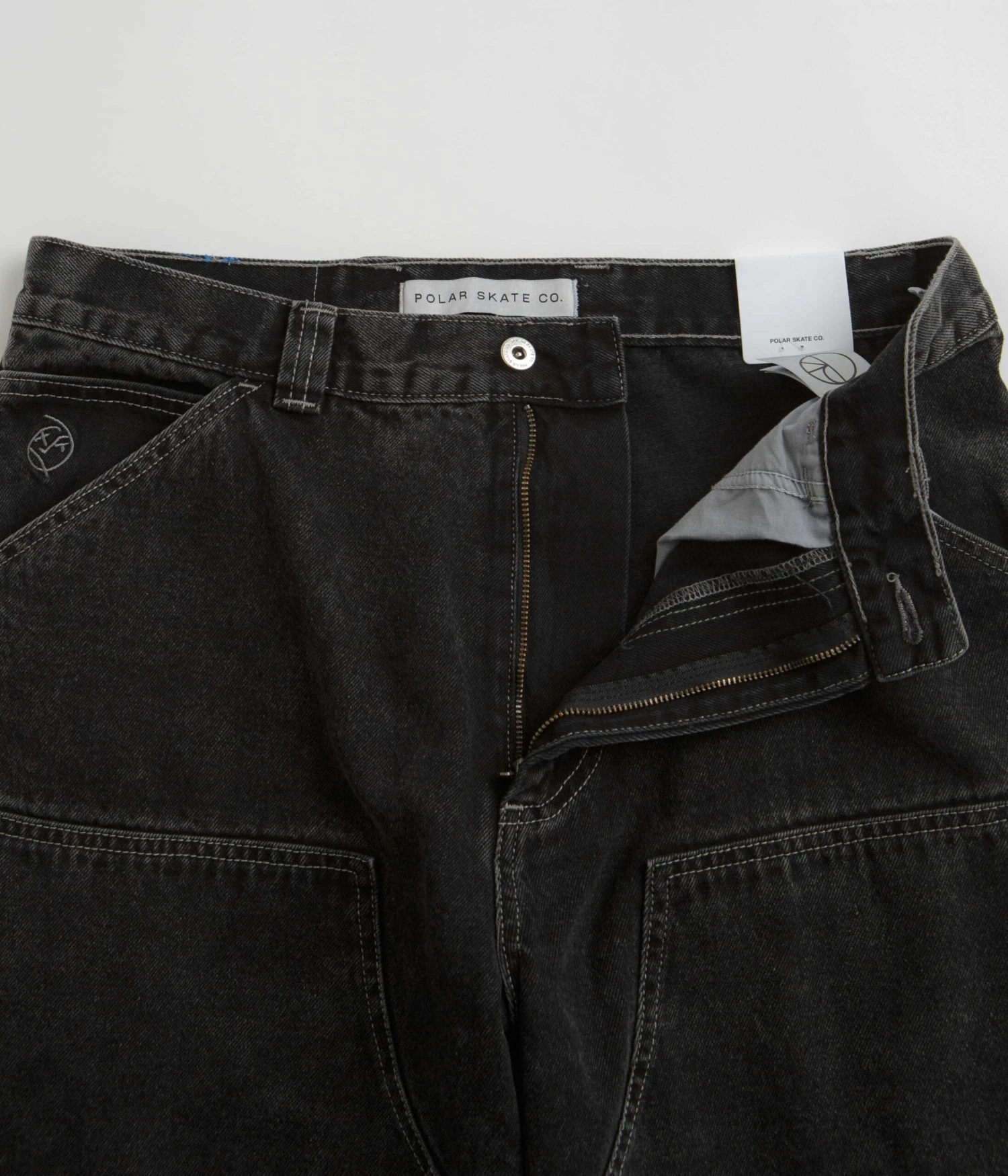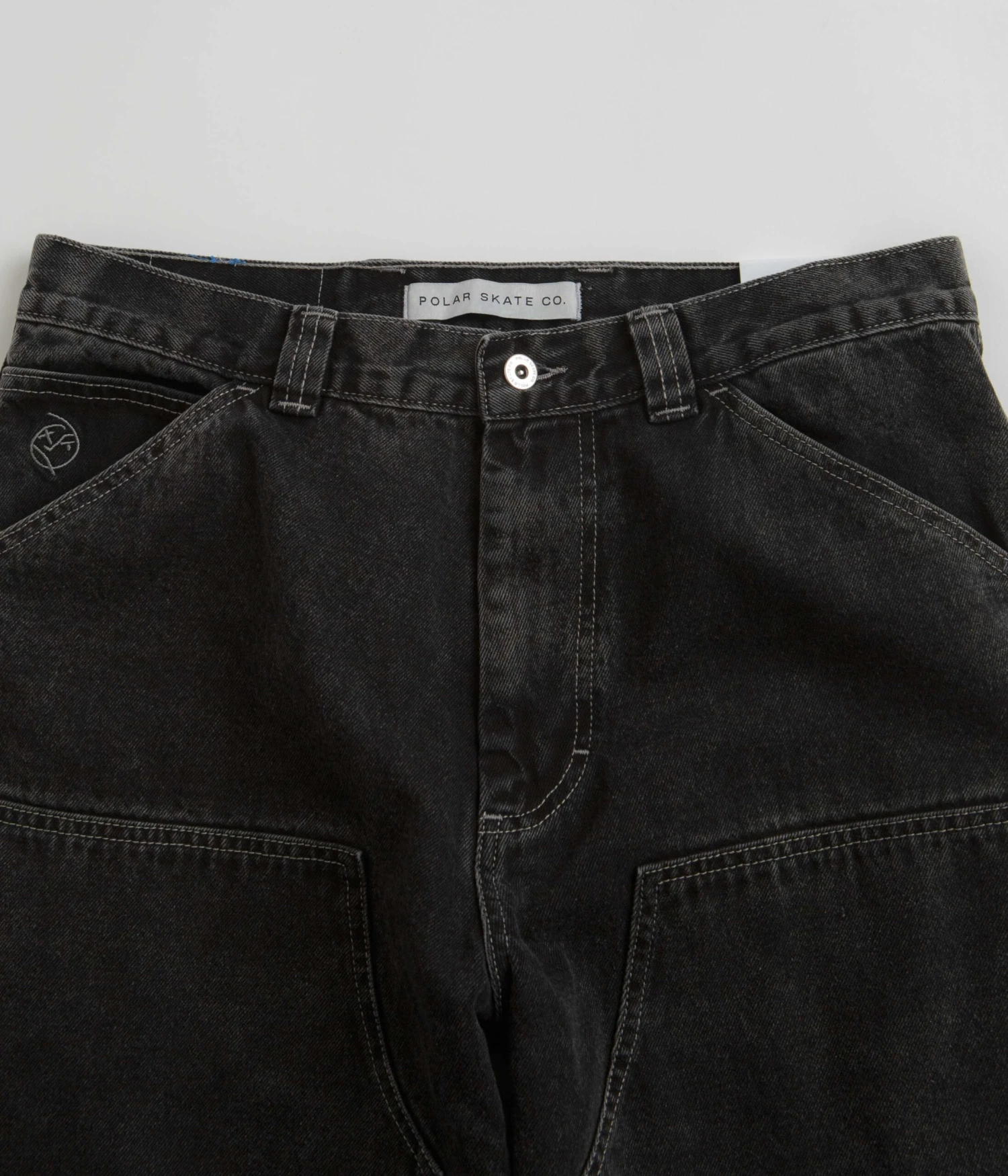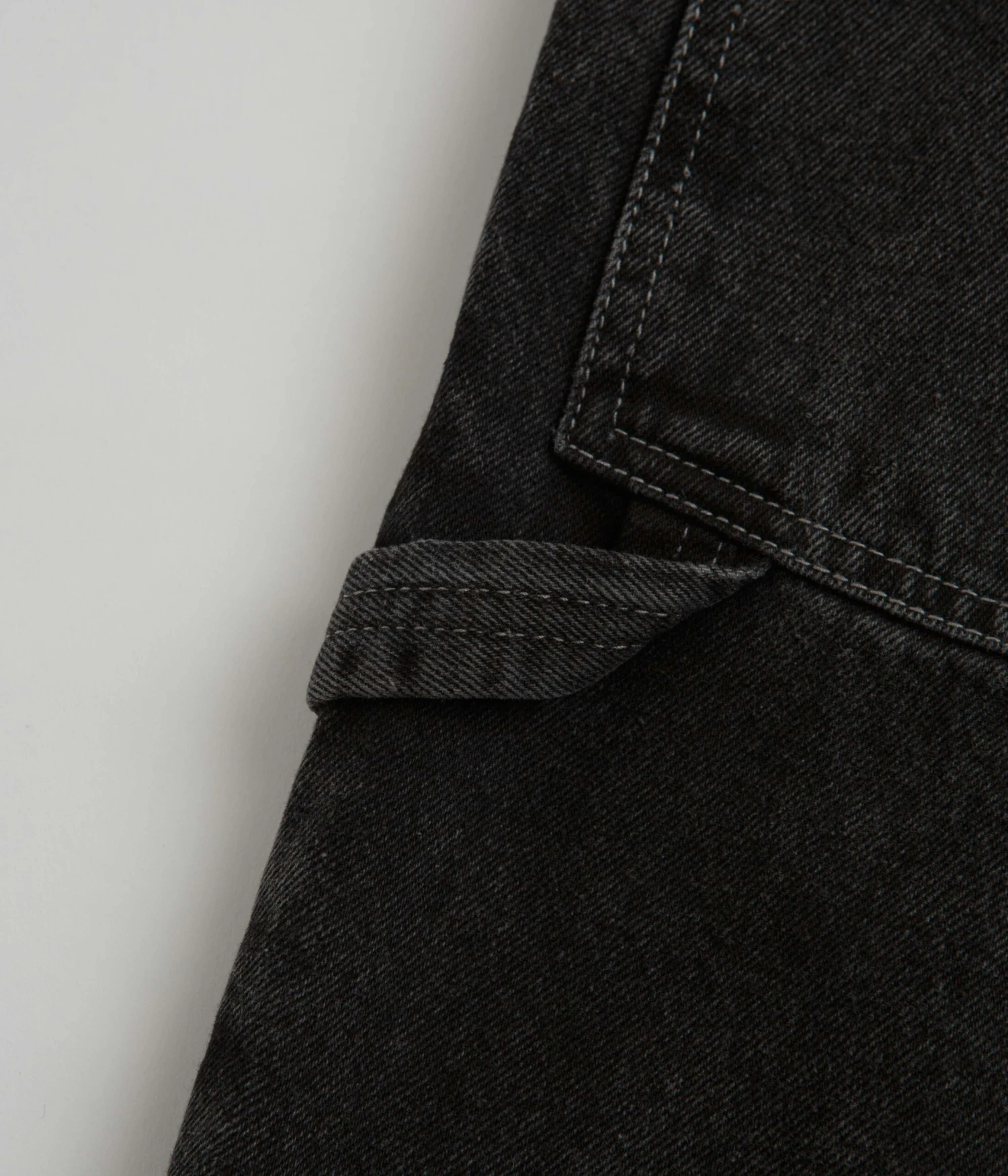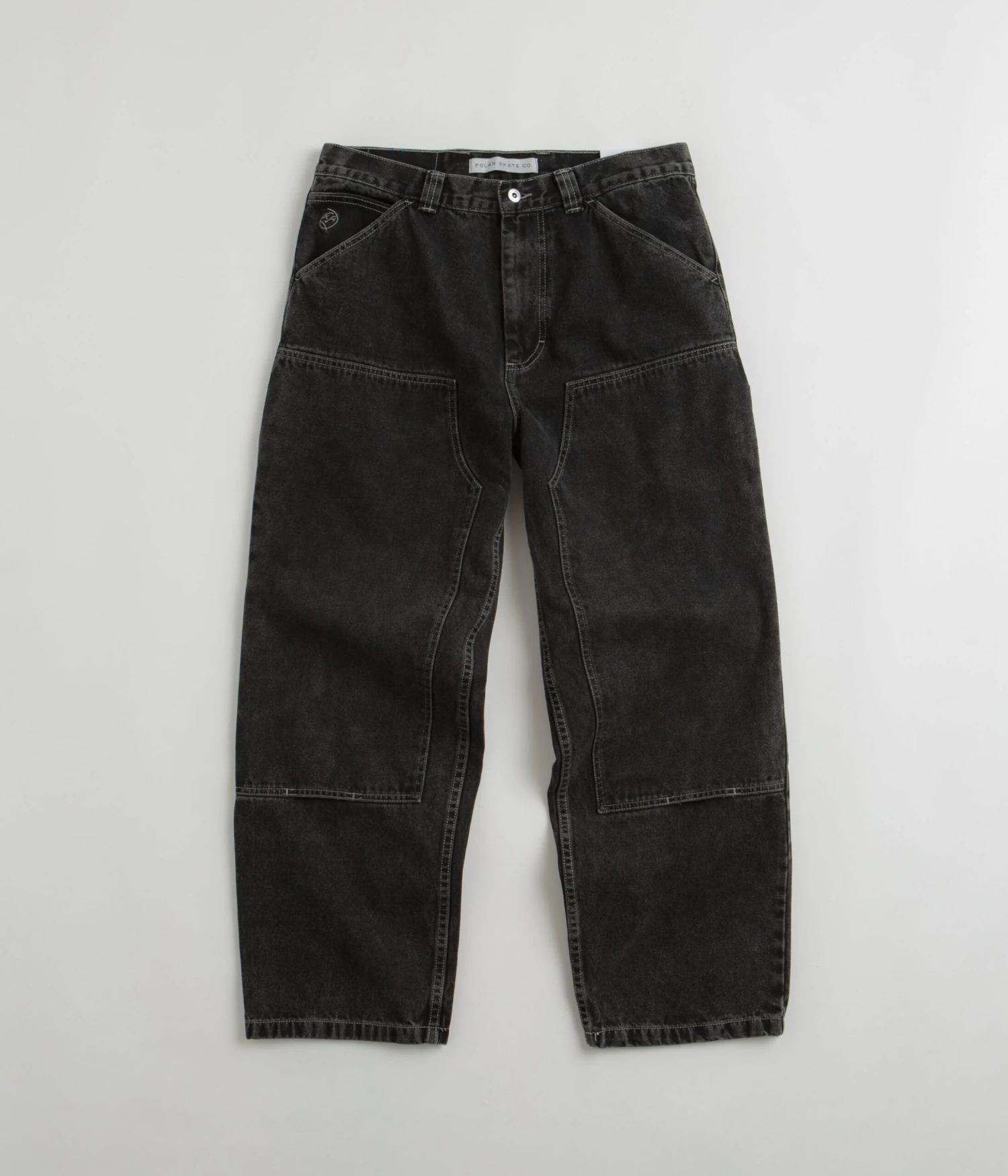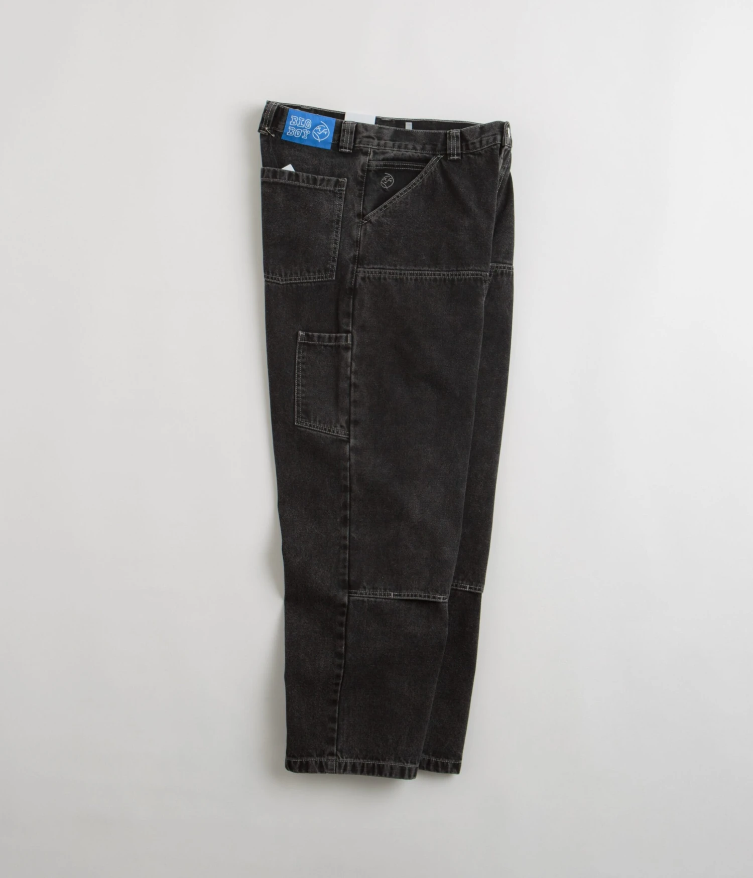 Polar Big Boy Work Pants in Silver Black. Utility inspired with reinforced double-layer knee panels, these baggy fitting Polar pants are made from 100% cotton denim. Featuring a single button secured zipper fly and a tapered leg, these grey black Polar Big Boy pants are finished with two front pockets, two rear pockets, an embroidered coin stash, a woven hammer loop and with an additional utility pocket.