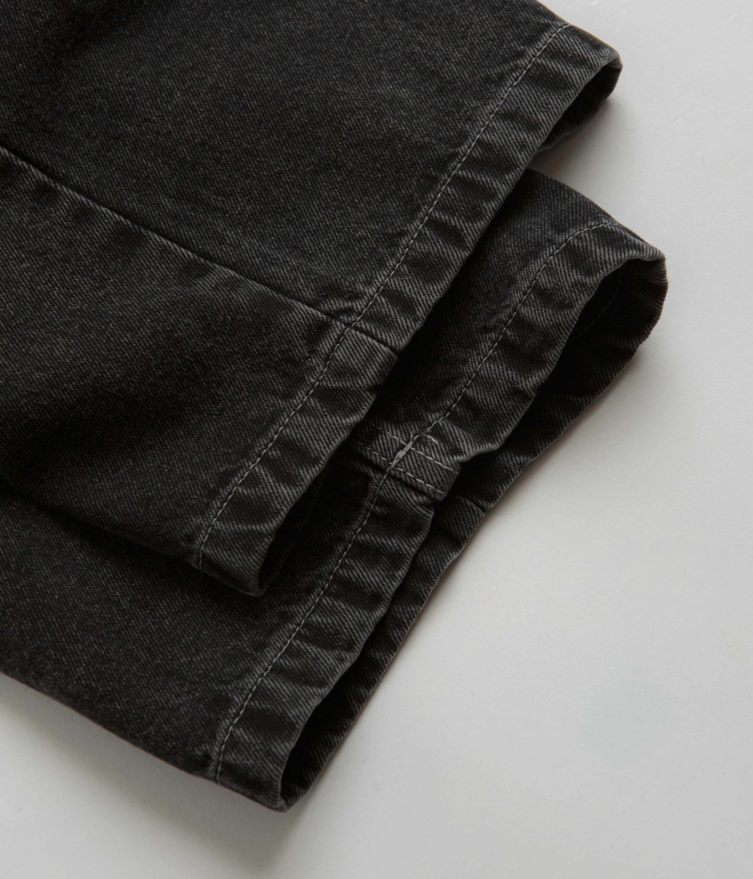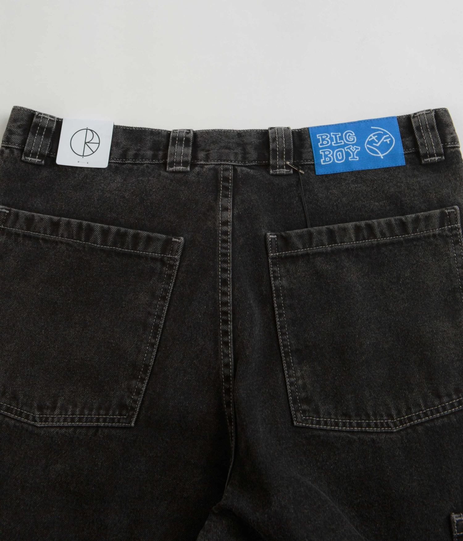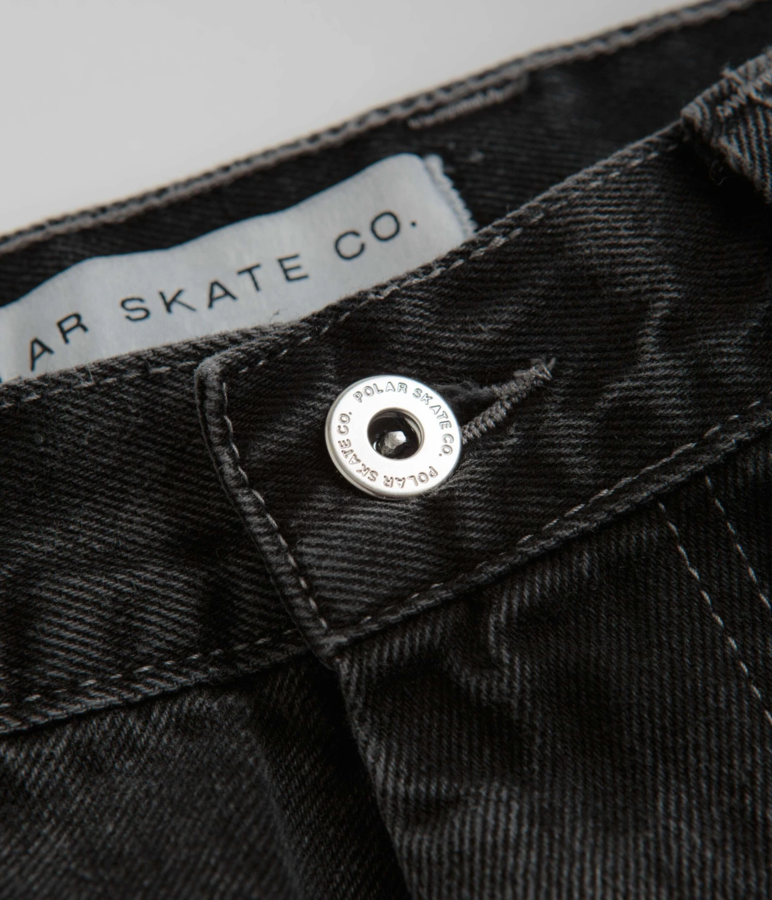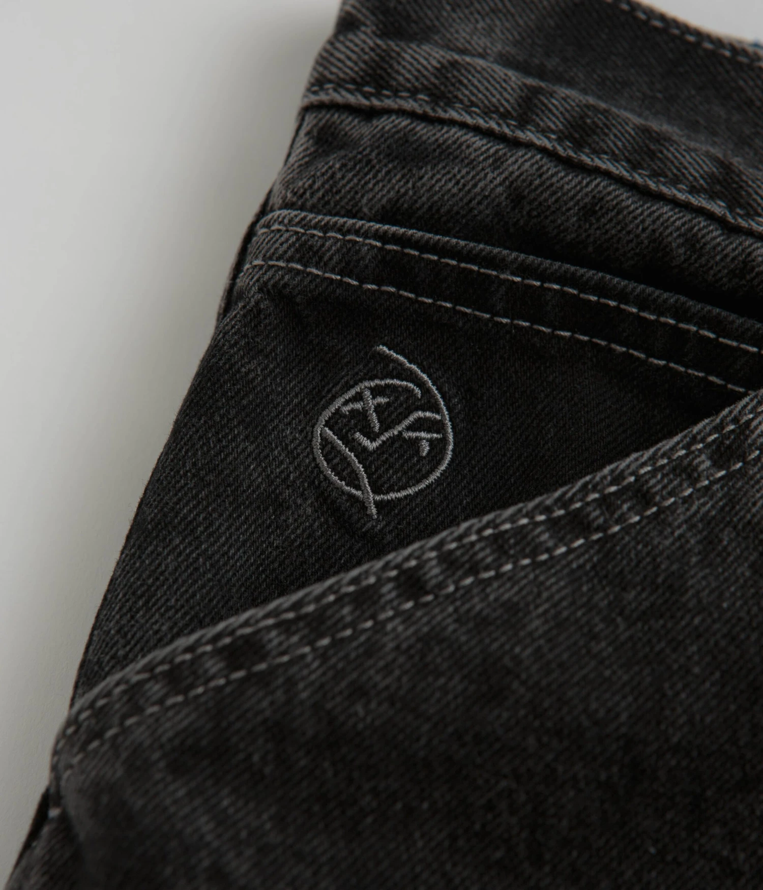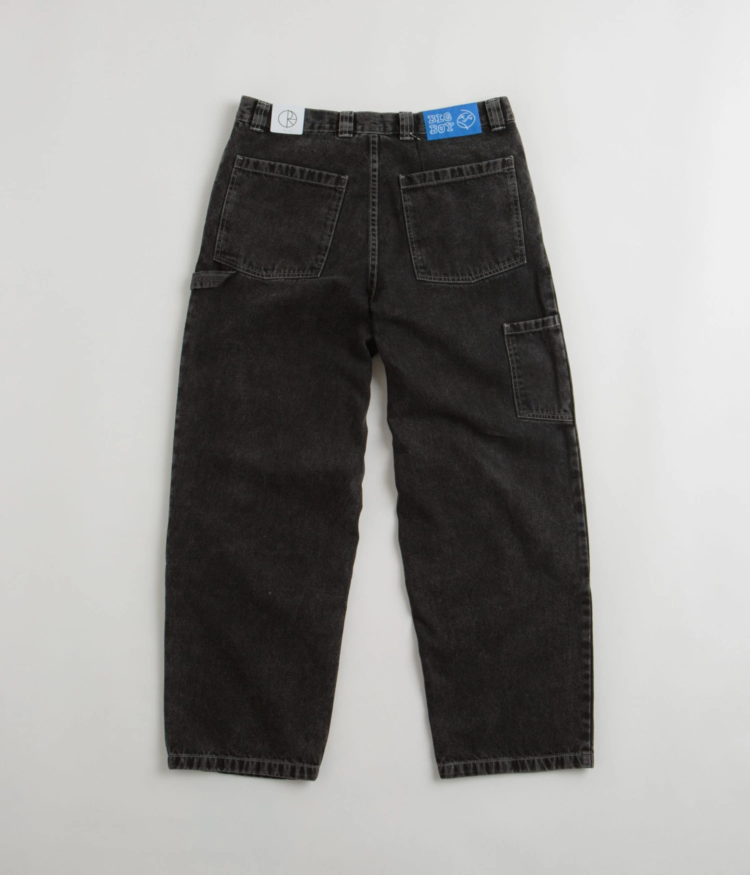 Polar Big Boy Work Pants in Silver Black. Utility inspired with reinforced double-layer knee panels, these baggy fitting Polar pants are made from 100% cotton denim. Featuring a single button secured zipper fly and a tapered leg, these grey black Polar Big Boy pants are finished with two front pockets, two rear pockets, an embroidered coin stash, a woven hammer loop and with an additional utility pocket.