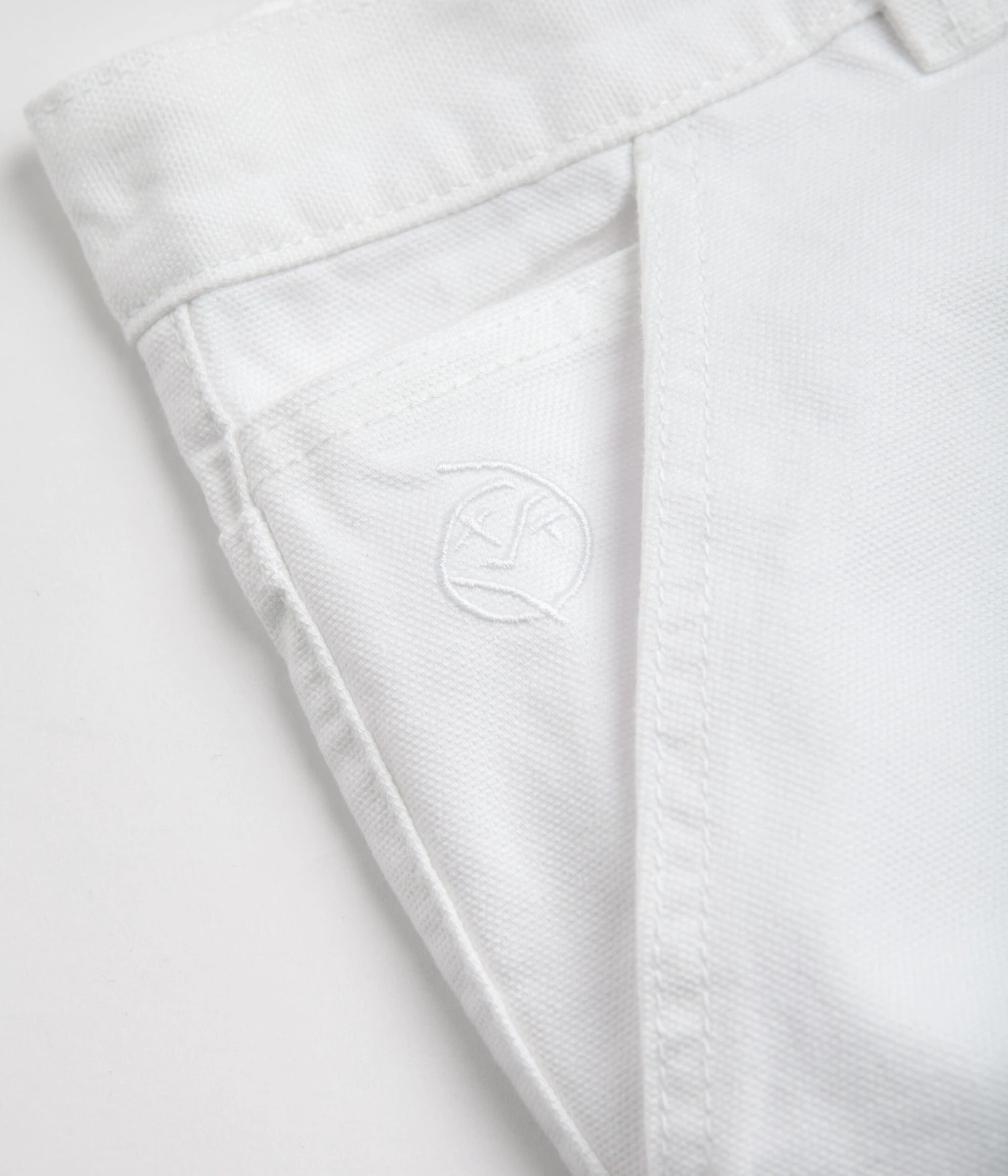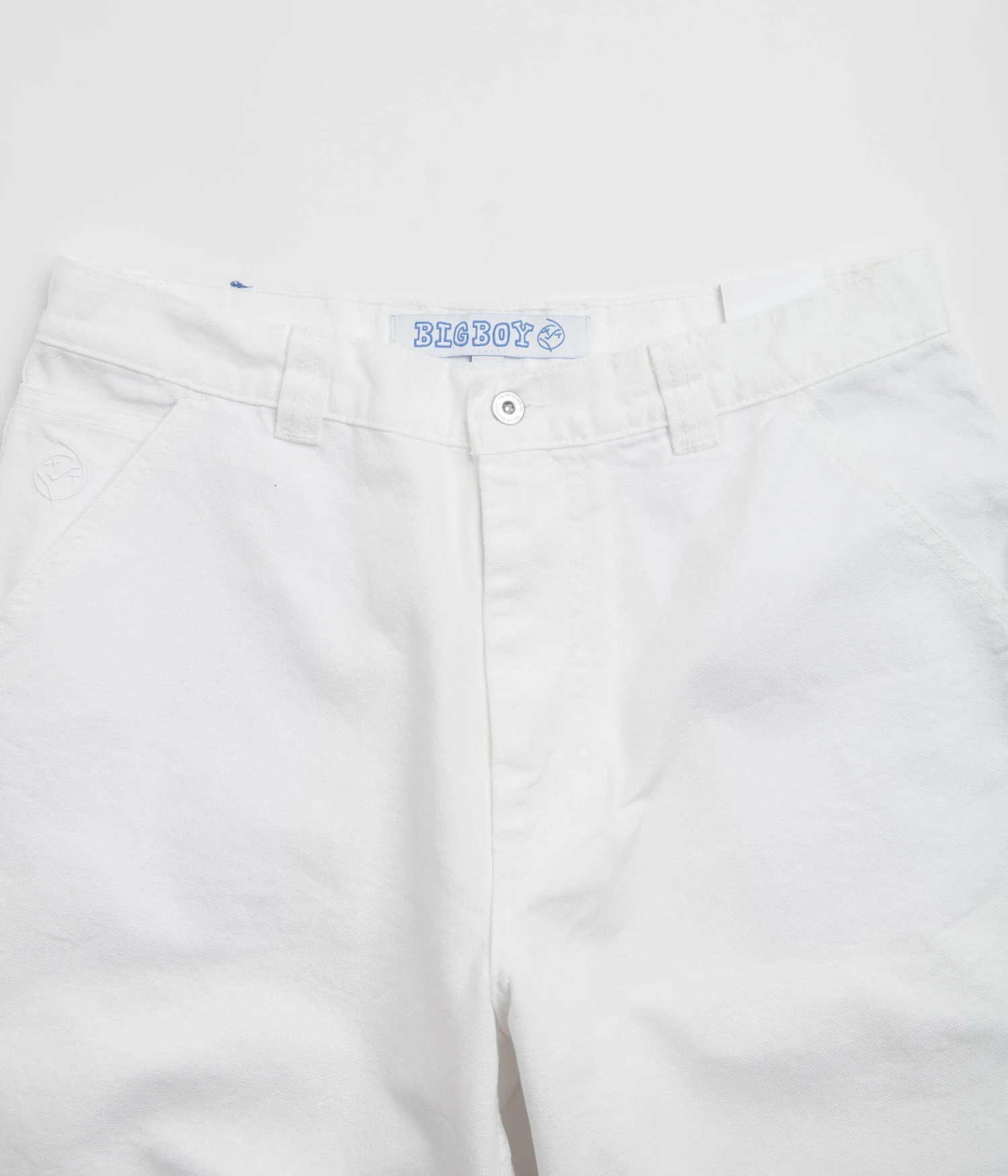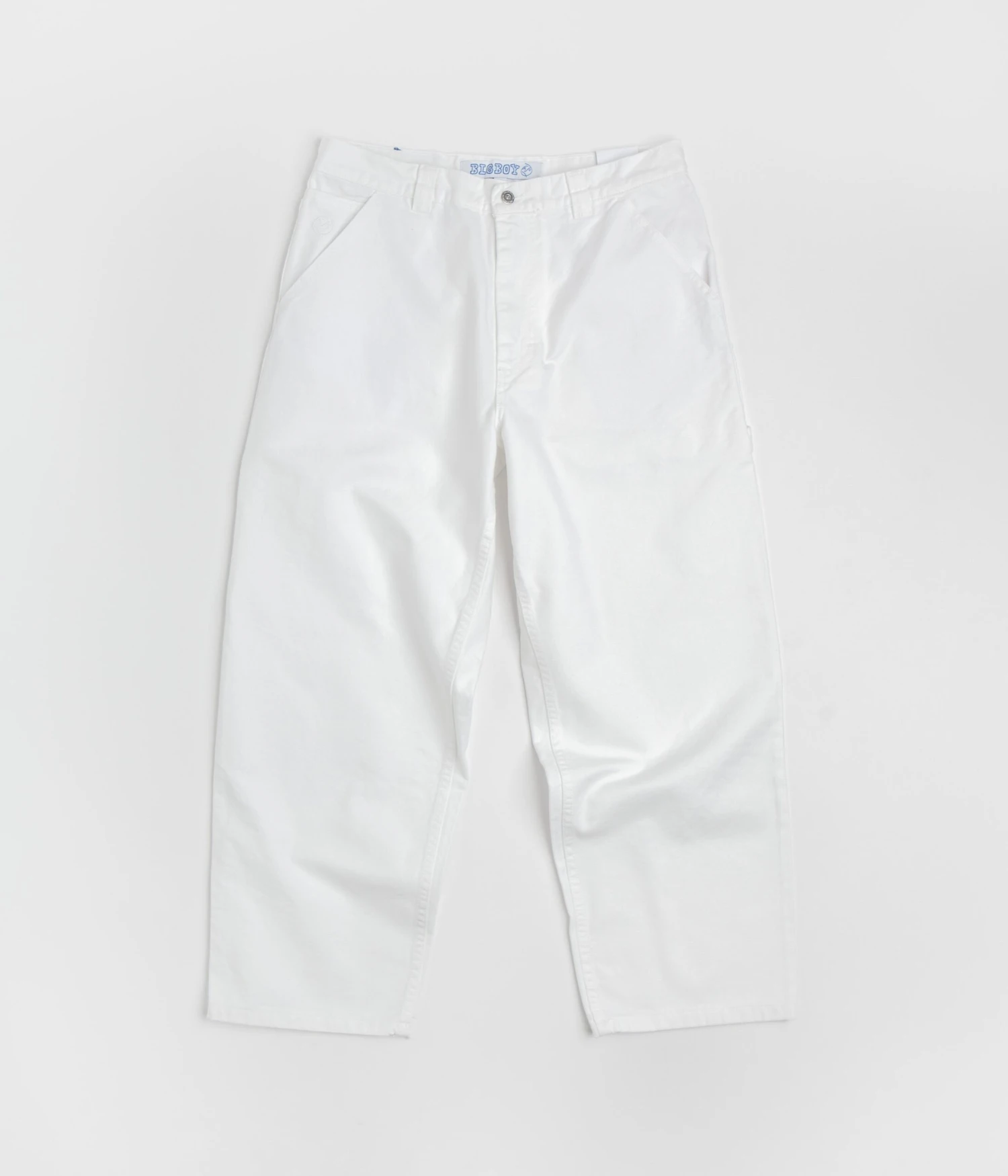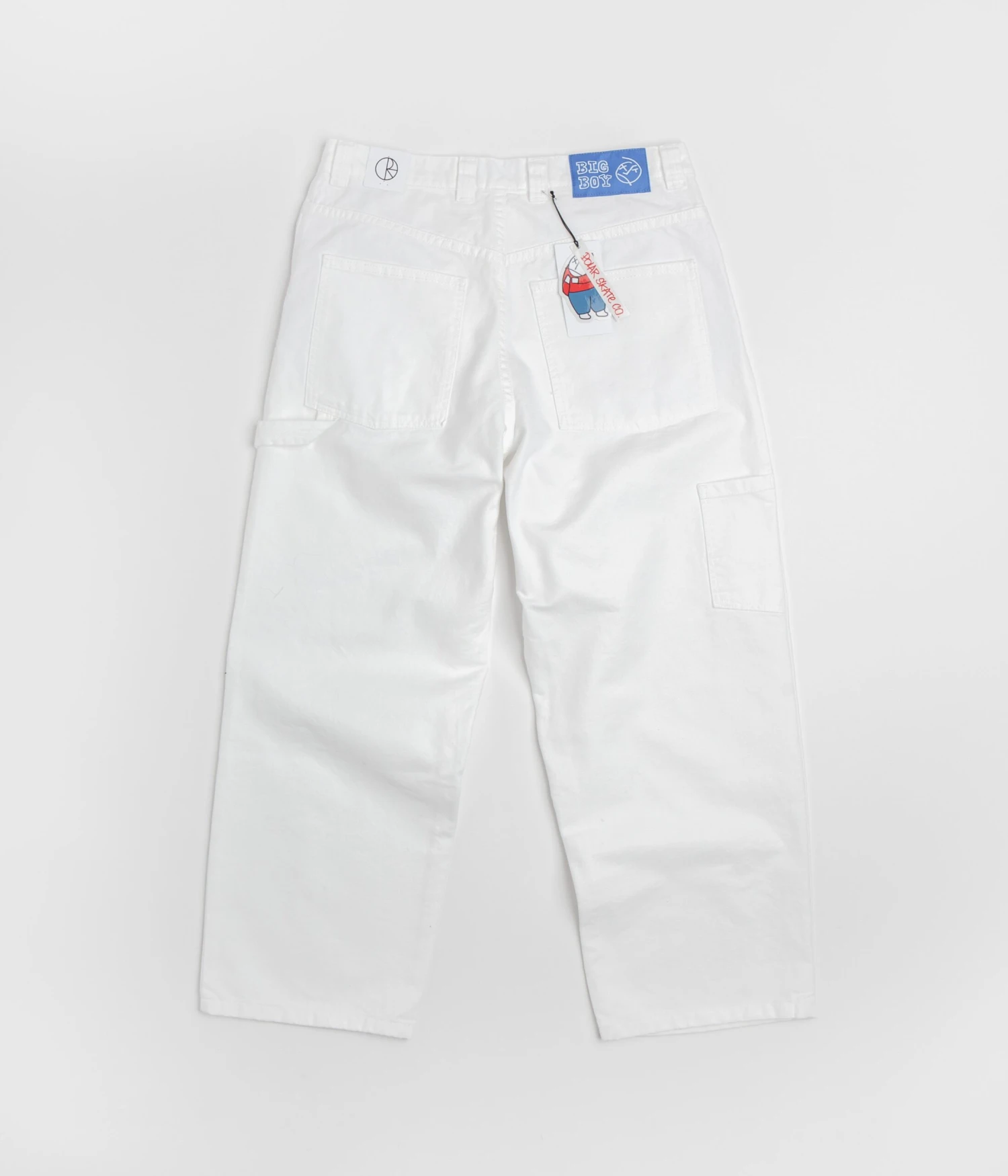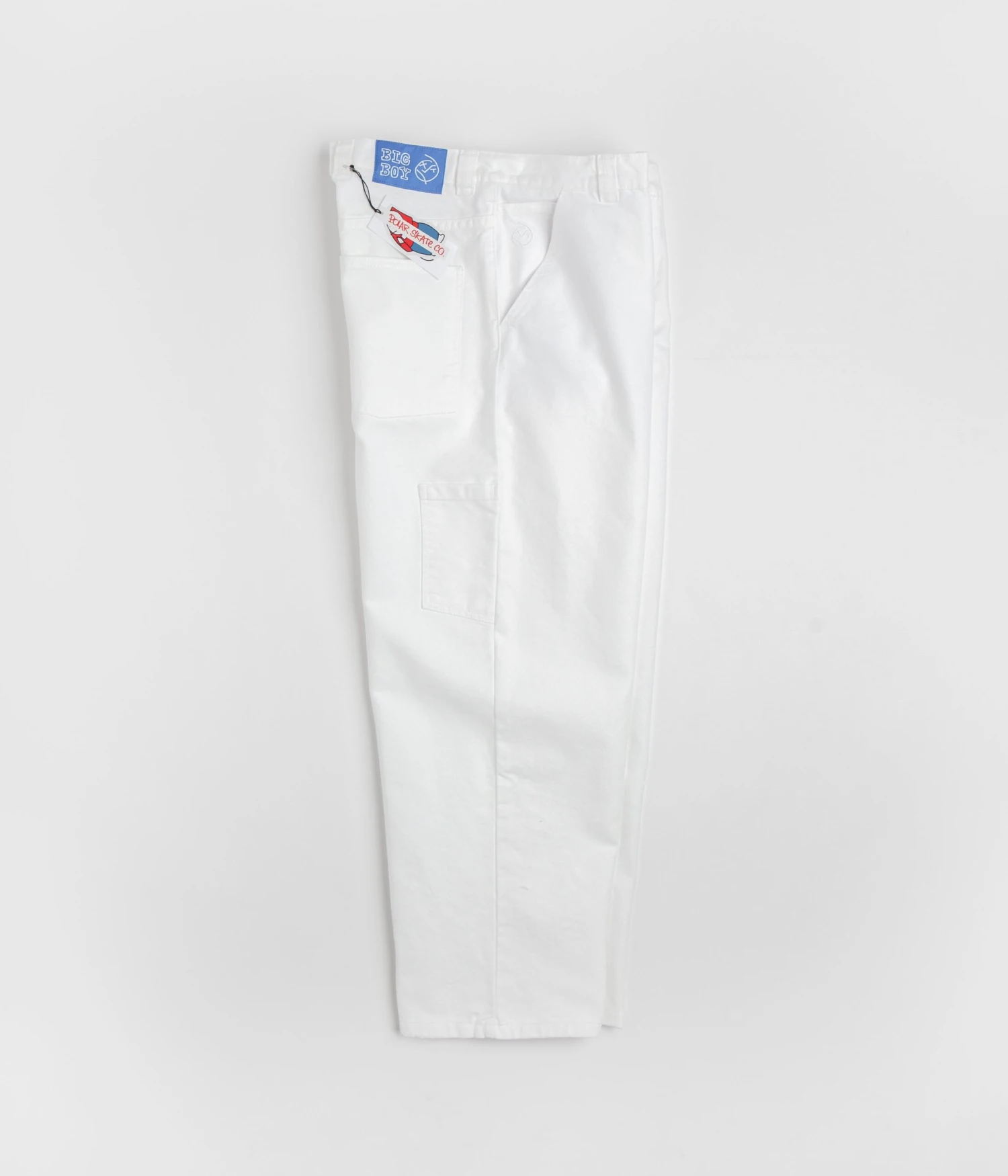 Polar Big Boy Work Pants in White. Workwear inspired and made from 100% cotton canvas, these Polar pants are tailored to a baggy fitting with a tapered leg cut. Featuring a belt loop waistband, a YKK zipper fly, a woven hammer loop and an additional utility pocket, these white Polar work pants are finished with four classic pockets, an embroidered coin stash and with a woven Big Boy belt patch.