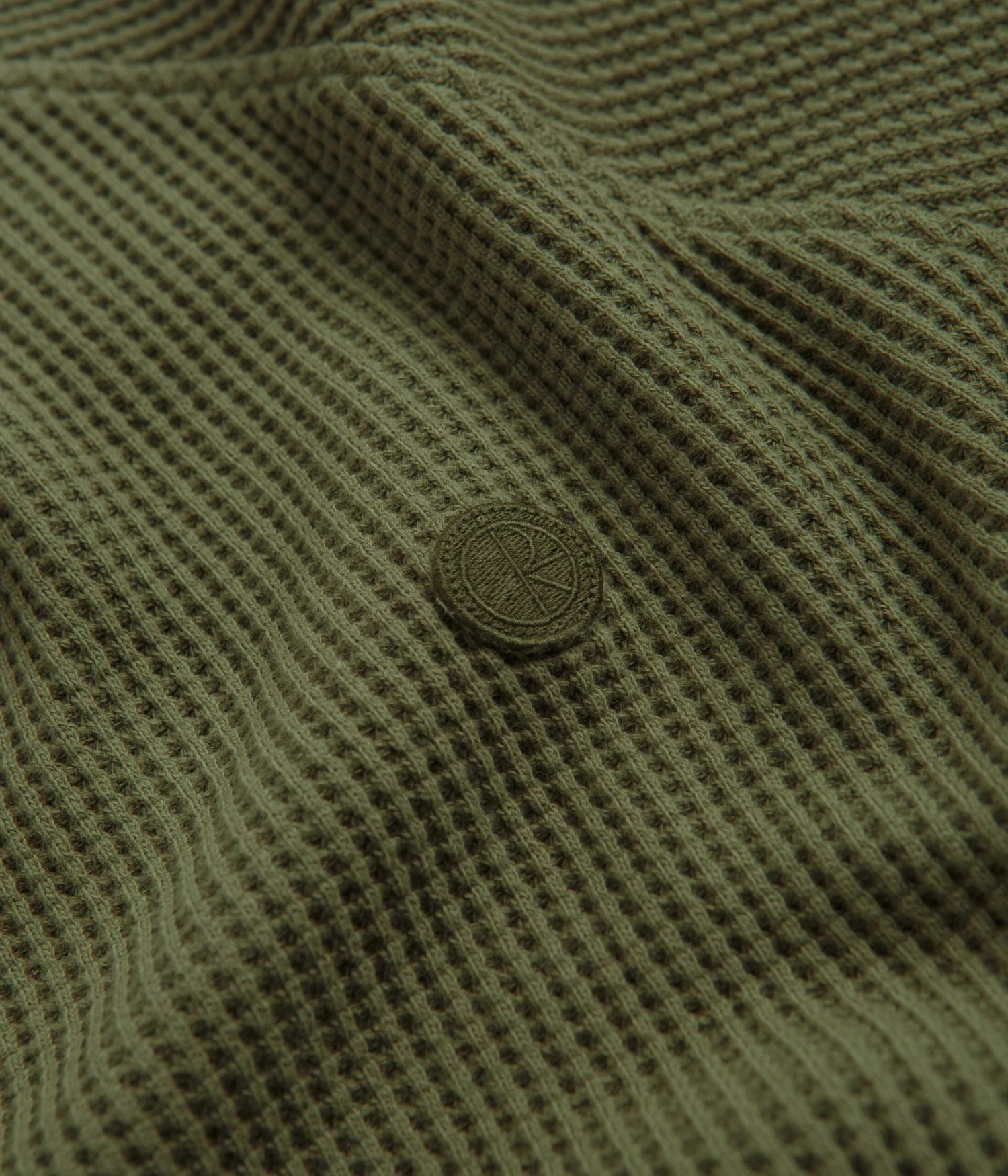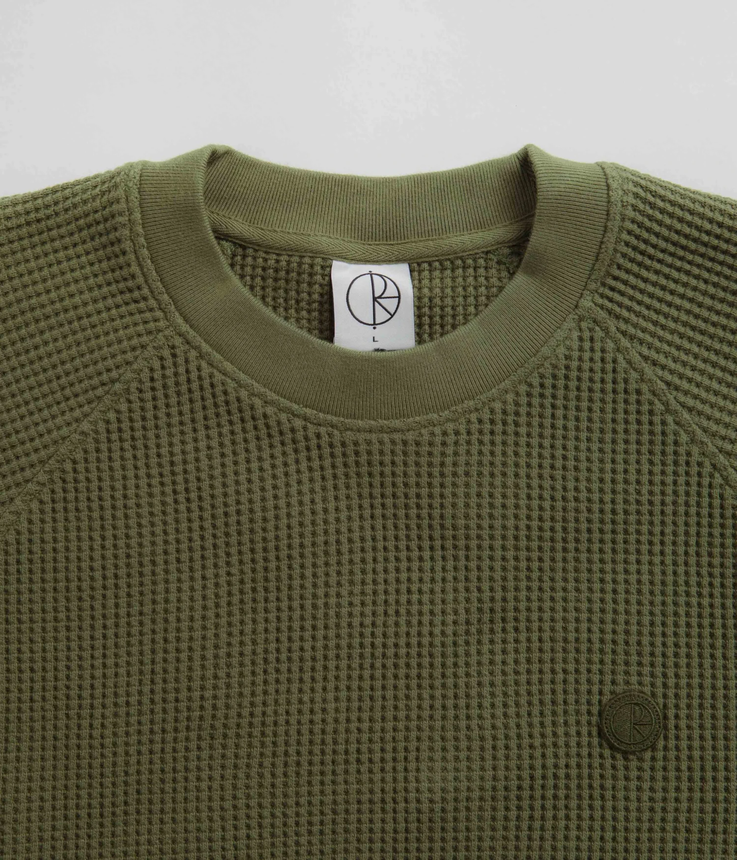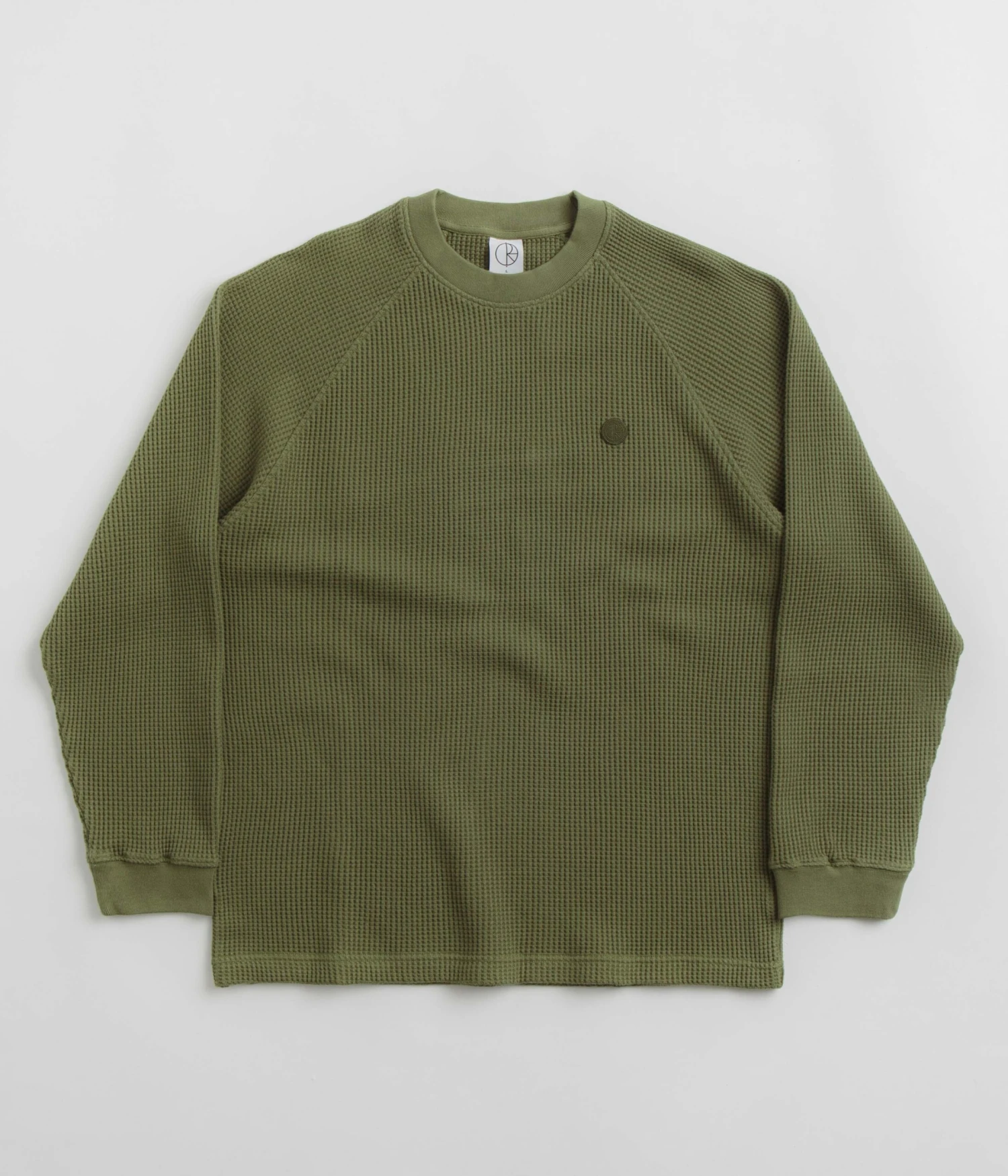 Polar Dan Long Sleeve T-Shirt in Army Green. Part of the brand’s latest release, this regular fitting Polar t-shirt is made from 100% cotton. A waffle jersey design with a garment dyed construction, a rib knit crew collar and raglan sleeves, this army green Polar t-shirt is finished with ribbed cuffs and with an embroidered patch logo.