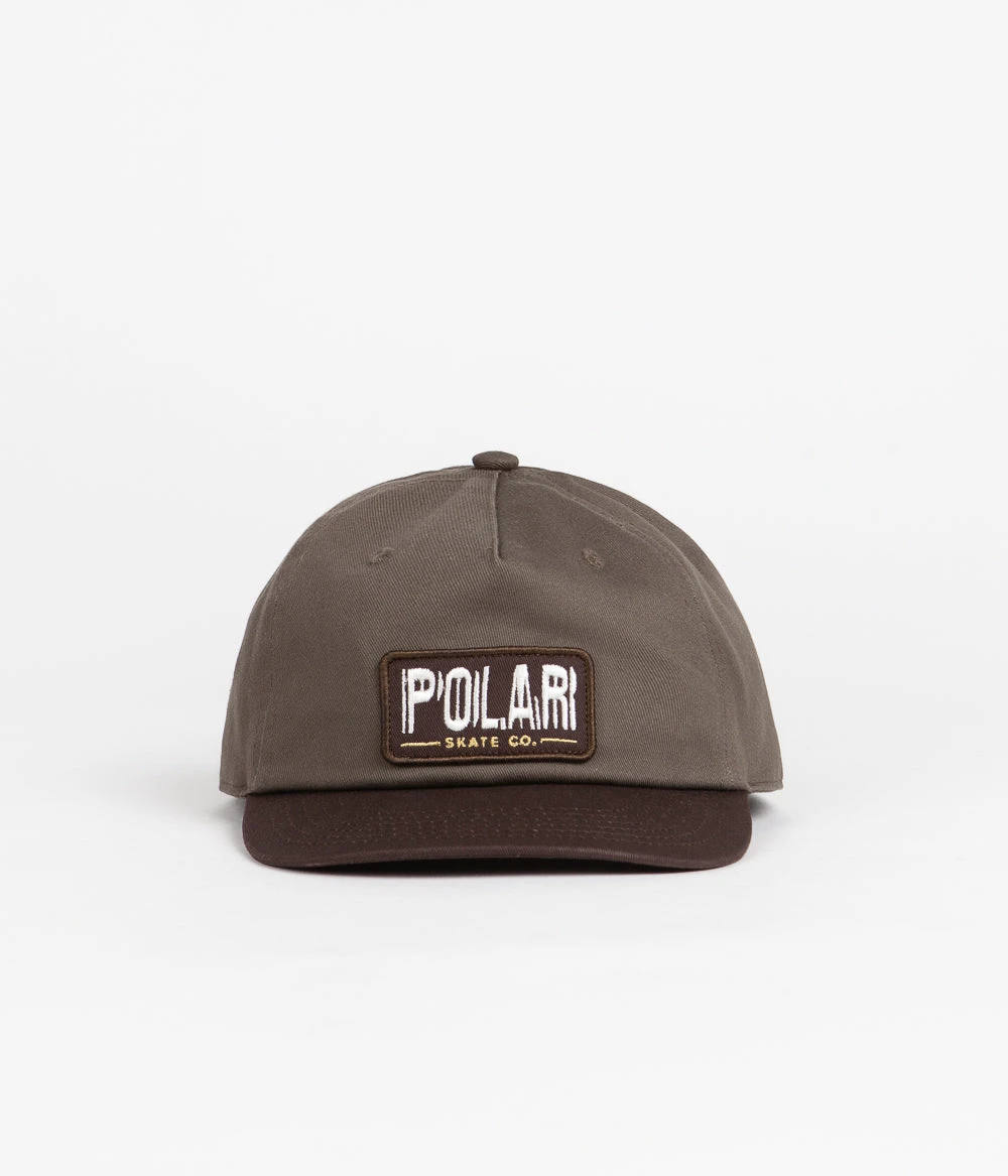 Polar Earthquake Patch Cap in Brown. Single sized and mesh lined, this structured five panel Polar cap is made from 100% cotton twill. Featuring a colour block pre-bent peak, an adjustable snapback fastening and embroidered airflow eyelets, this brown Polar cap is finished with an embroidered ‘Polar Skate Co.’ brand patch sewn across the crown.