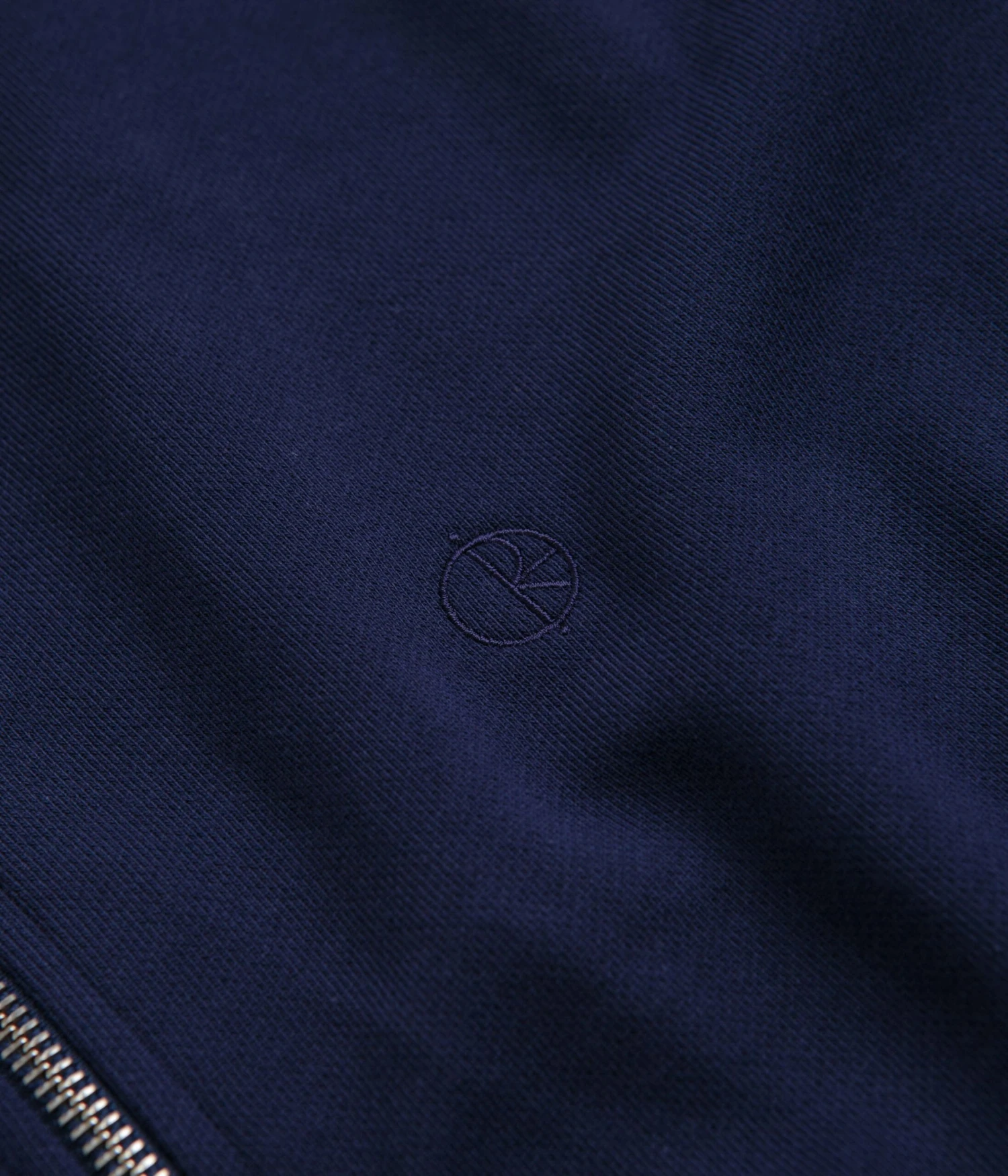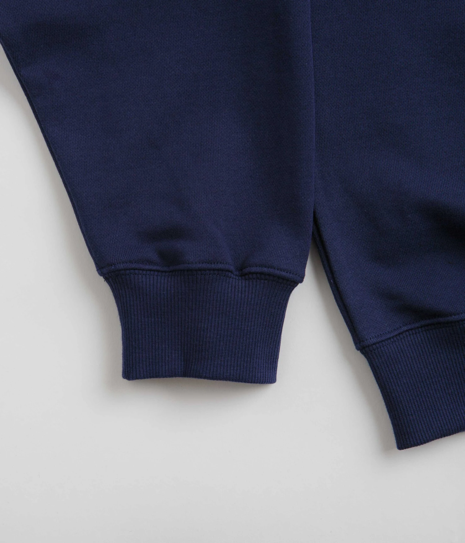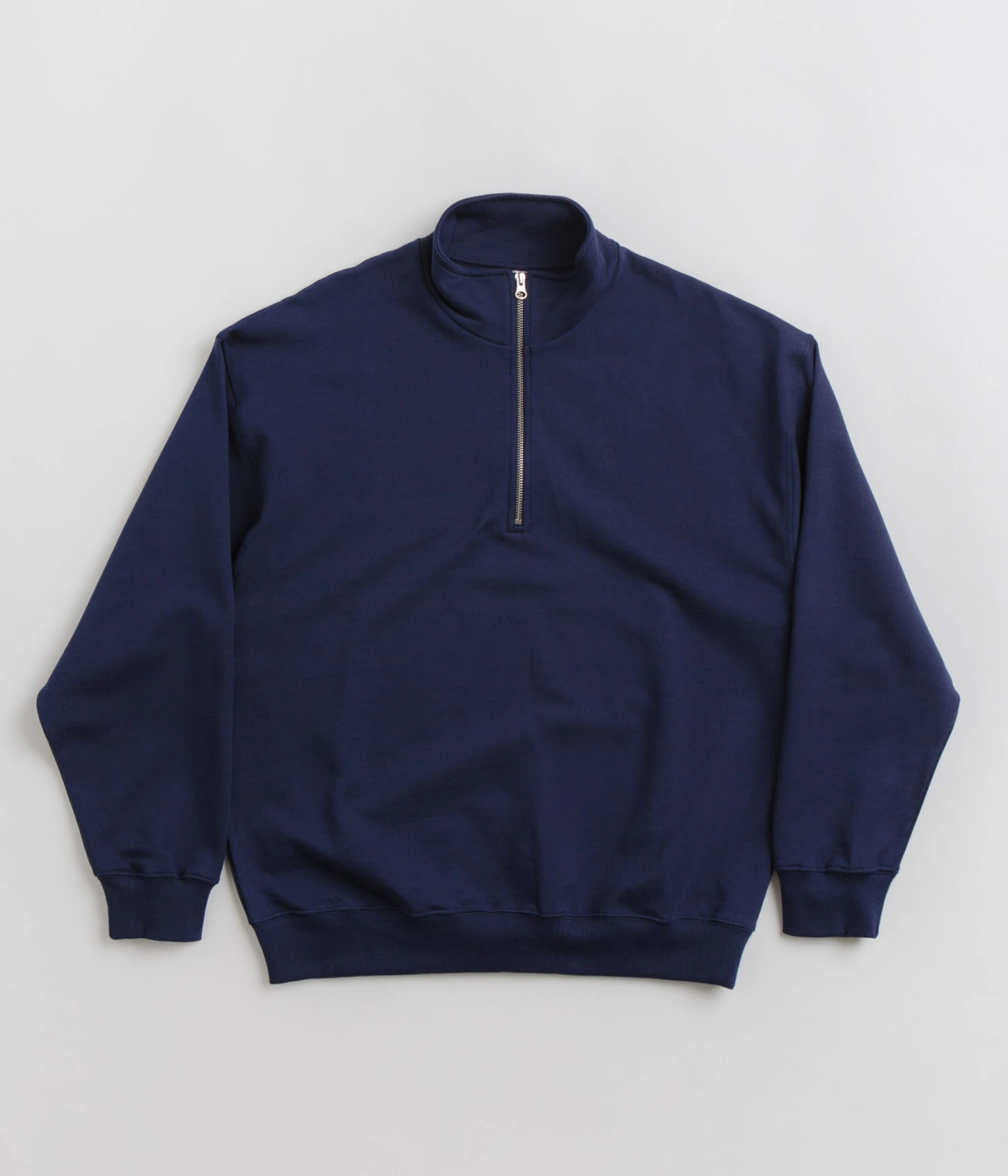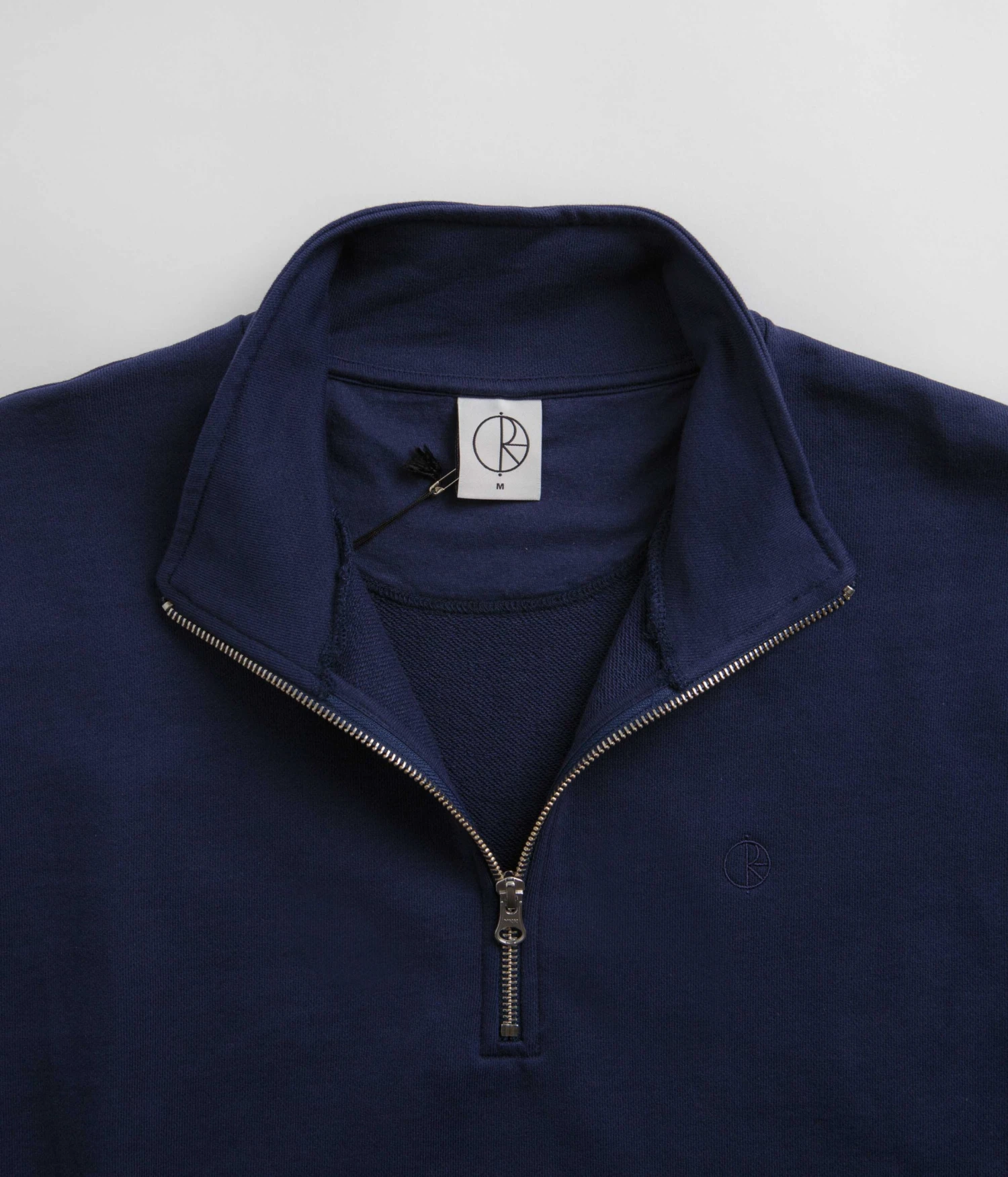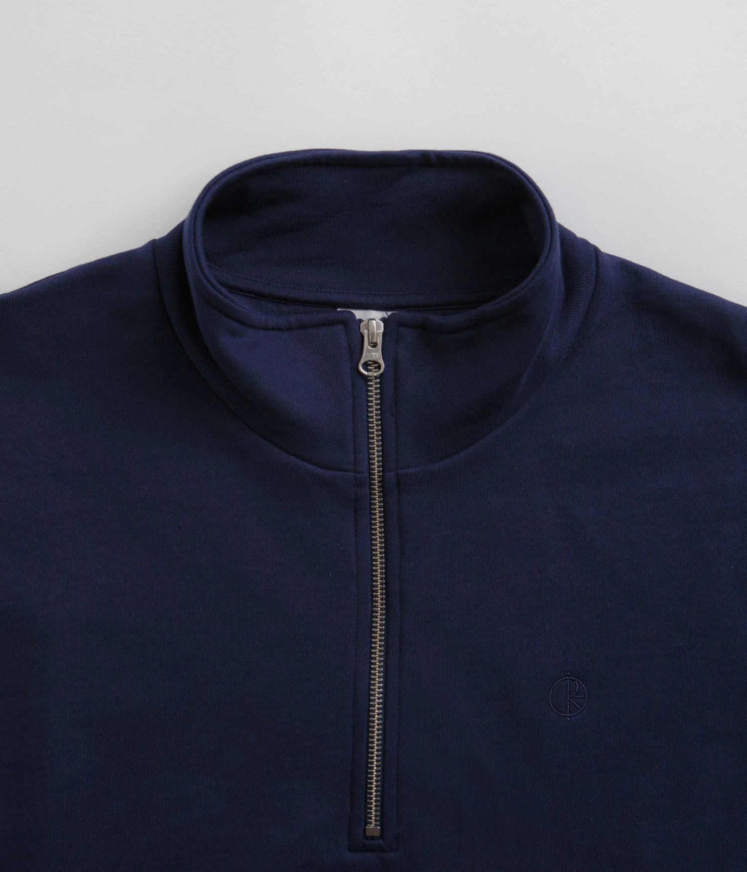 Polar Frank Half Zip Sweatshirt in Dark Blue. Styled with a half-length zipper fastening, this Polar sweatshirt is made from 100% cotton with an unbrushed lining. Featuring dropped shoulders, bat sleeves and ribbed cuffs, this dark blue Polar sweater is finished with tonal logo embroidery.