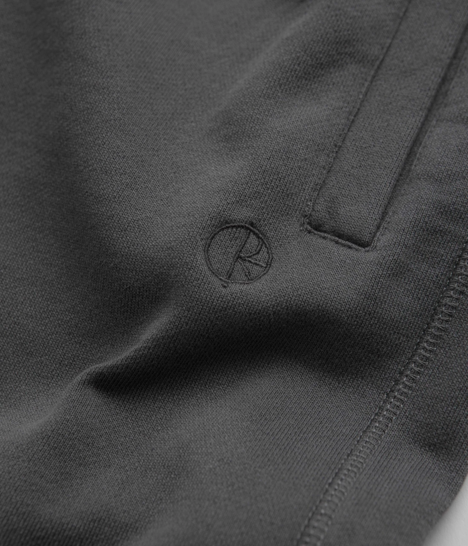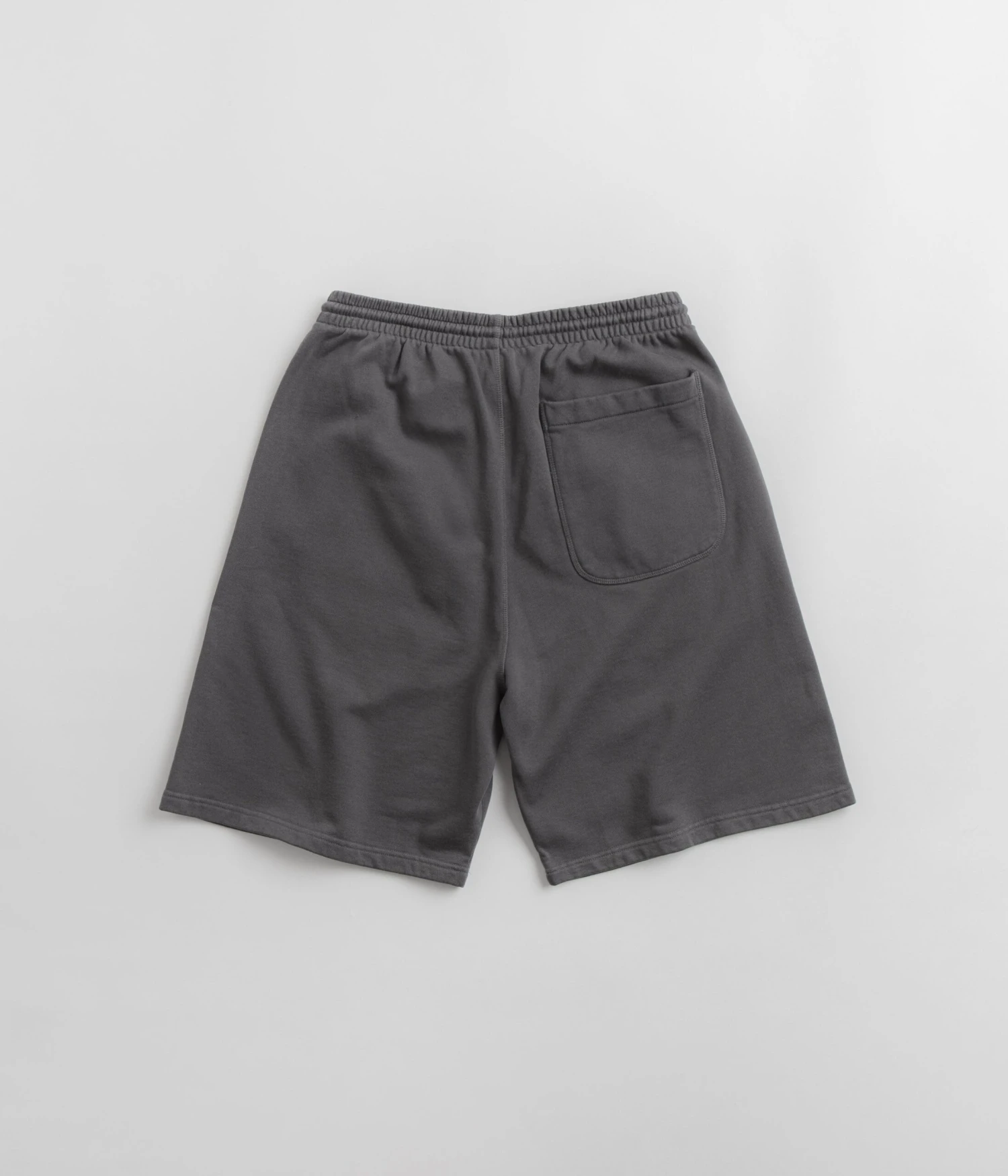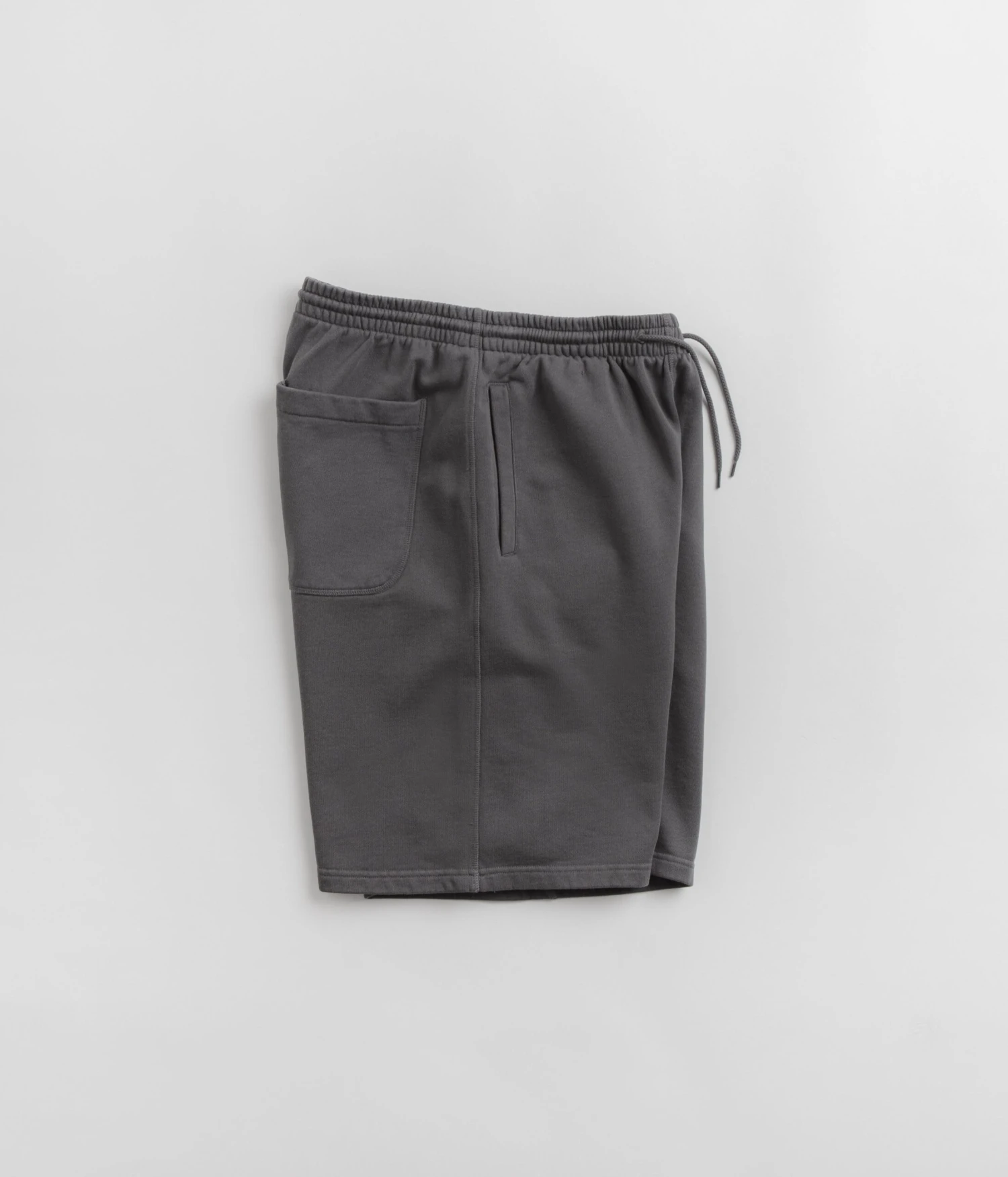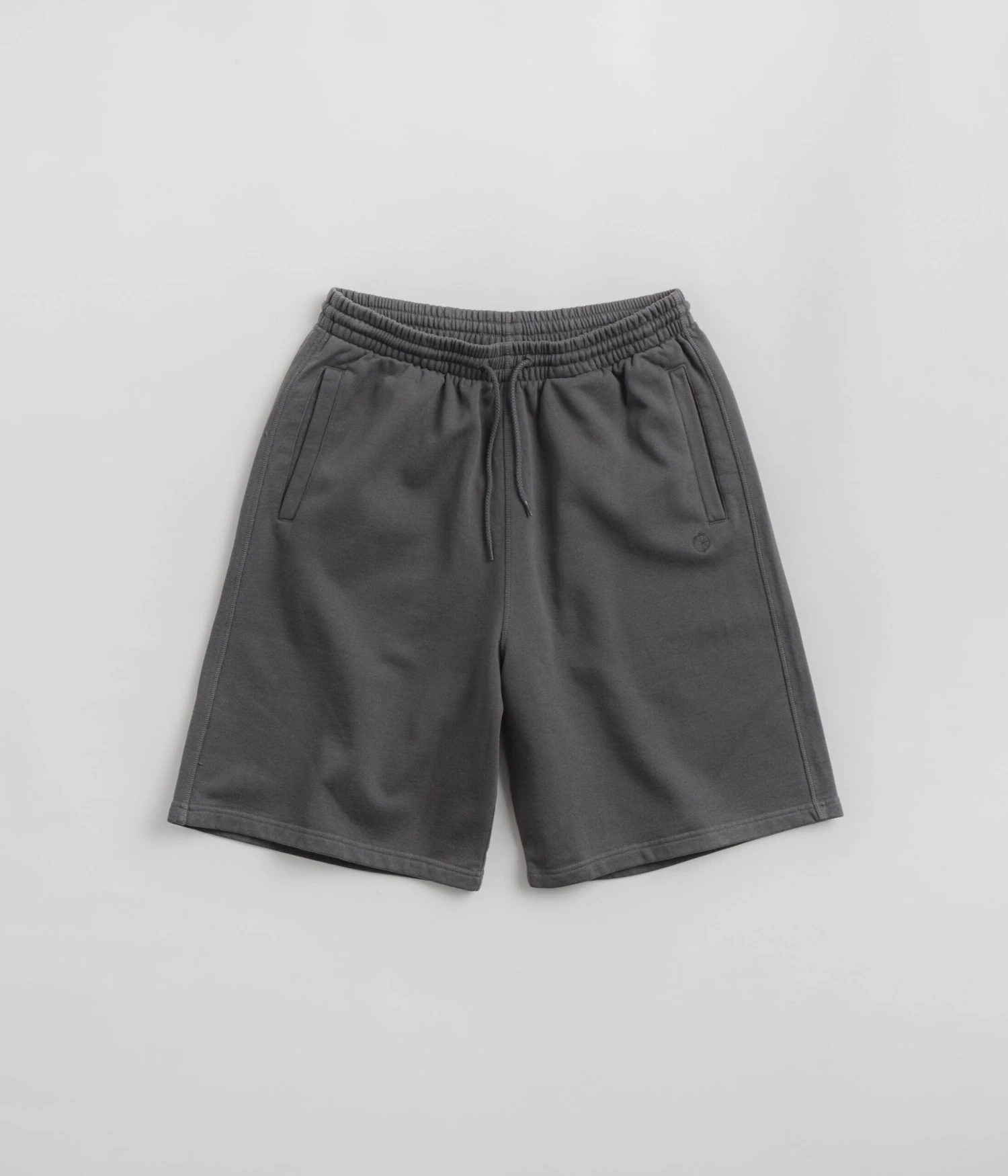 Polar Frank Sweat Shorts in Graphite. Loose fitting with a brushed lining, these Polar sweat shorts are made from 100% cotton. Stone-washed with a drawstring elasticated waist, these grey Polar shorts are finished with two side pockets, a single rear pocket and with tonal logo embroidery.