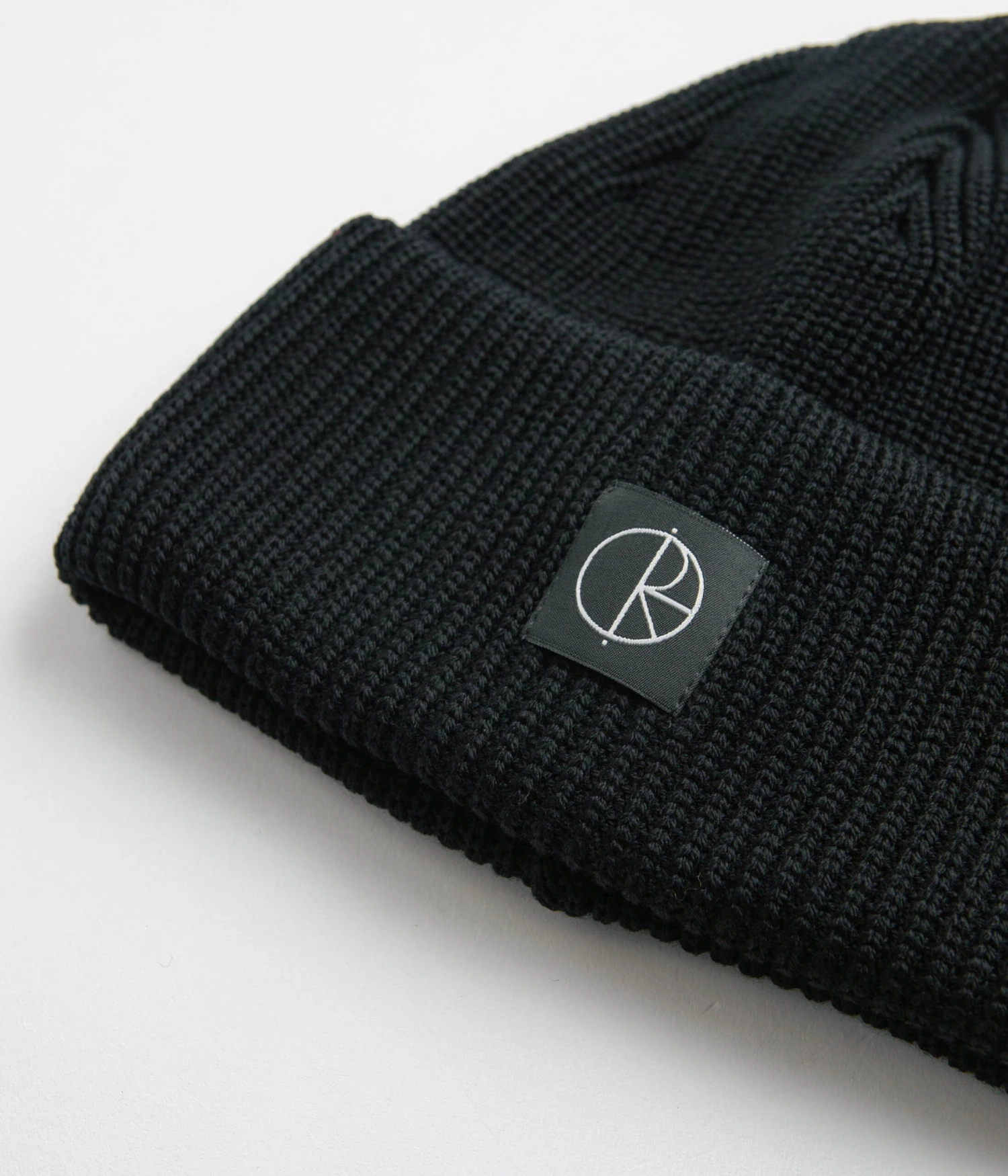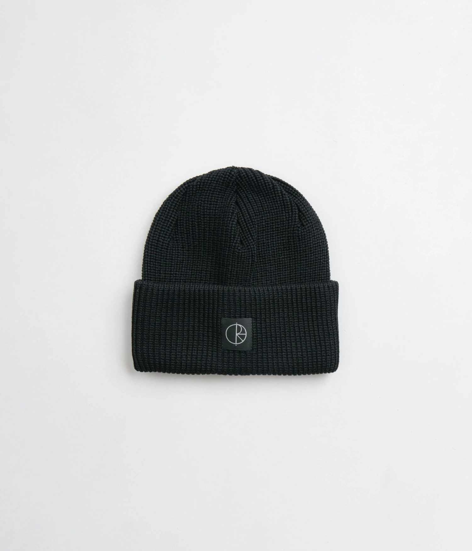 Polar Merino Beanie in Black. Single sized and made from 100% merino wool, this rib knit Polar beanie is designed with a stretchy fabric face and an adjustable turn-up cuff. Finished in a shade of black with an embroidered brand patch sewn across the front.