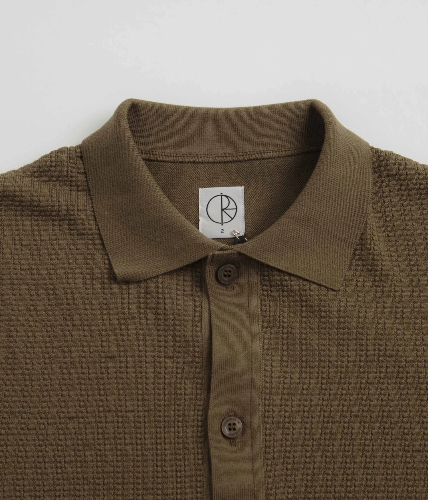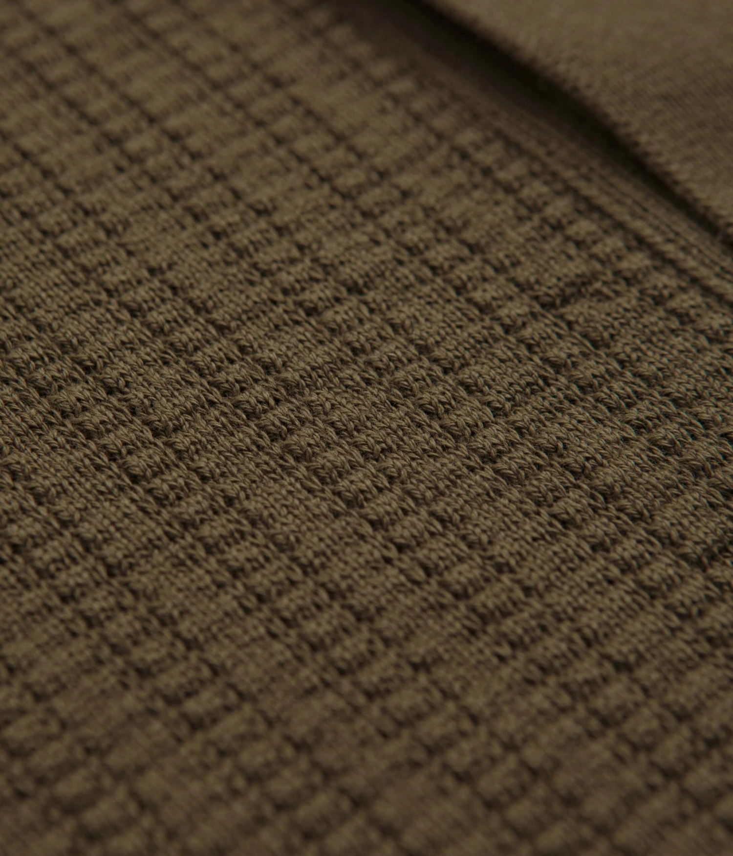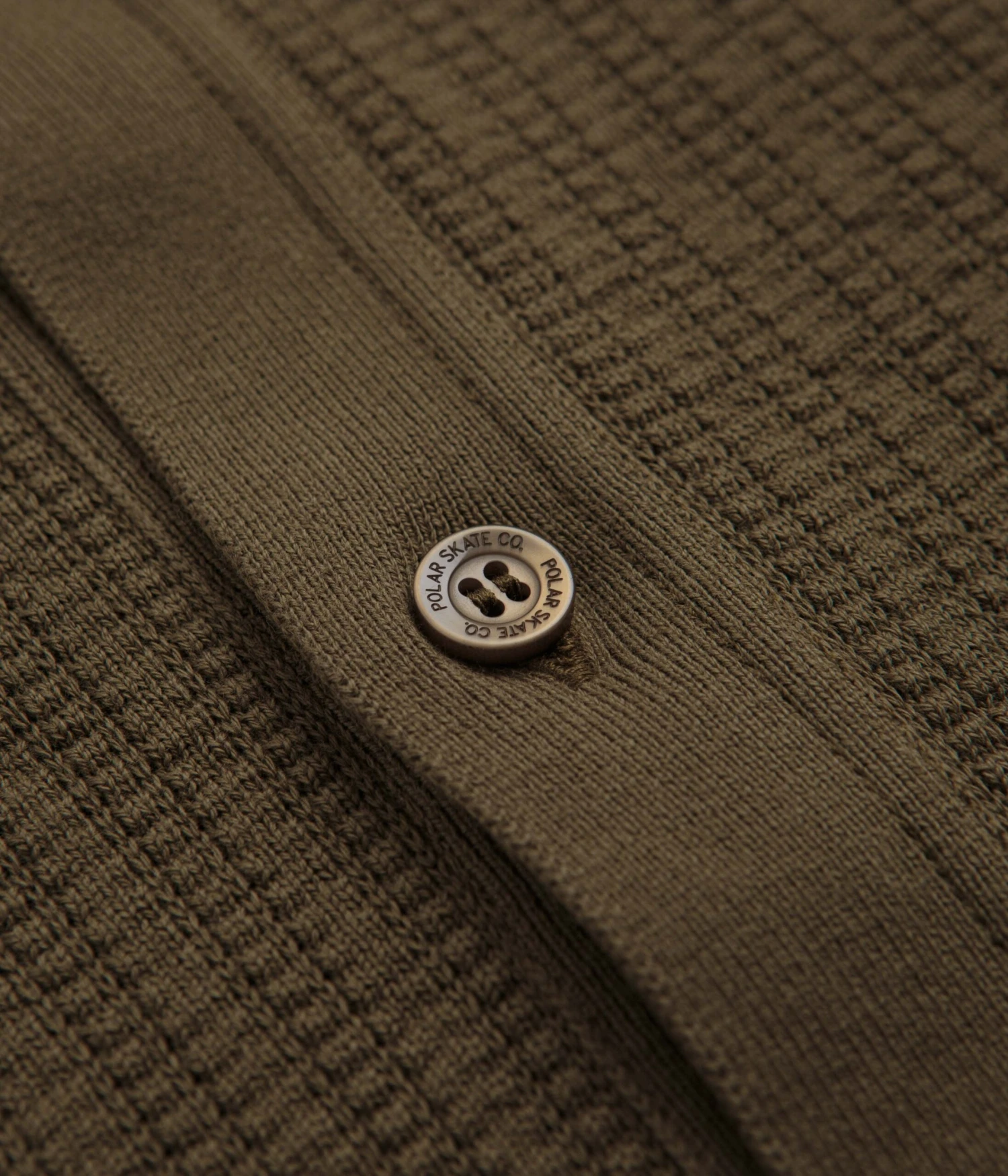 Polar Miles Cardigan in Beech. Made from 100% cotton, this cropped Polar cardigan is designed with a structured jersey knit construction. Featuring faux pearl buttons, a stand collar and a full length button fastening, this khaki green Polar cardigan is finished with a retro-style fitting, ribbed cuffs and a woven elastic hem.