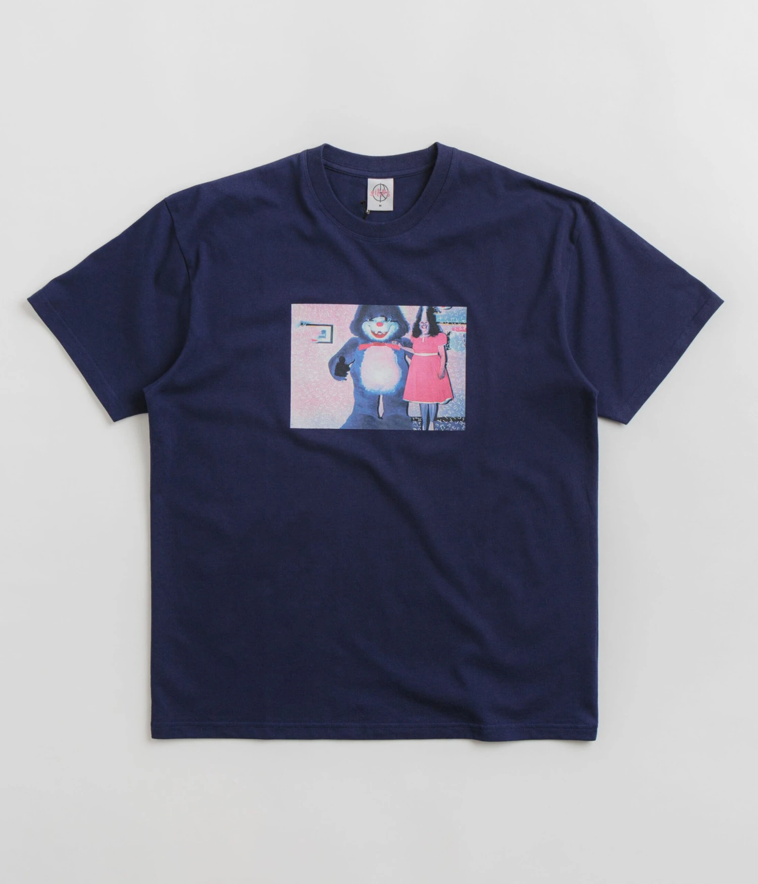 Polar Pink Dress T-Shirt in Dark Blue. Featuring custom artwork by Sirus F. Gahan, this Polar t-shirt is made from 100% cotton. Featuring a rib knit collar and a straight cut hem, this dark blue Polar t-shirt is finished with screen printed centre chest artwork.