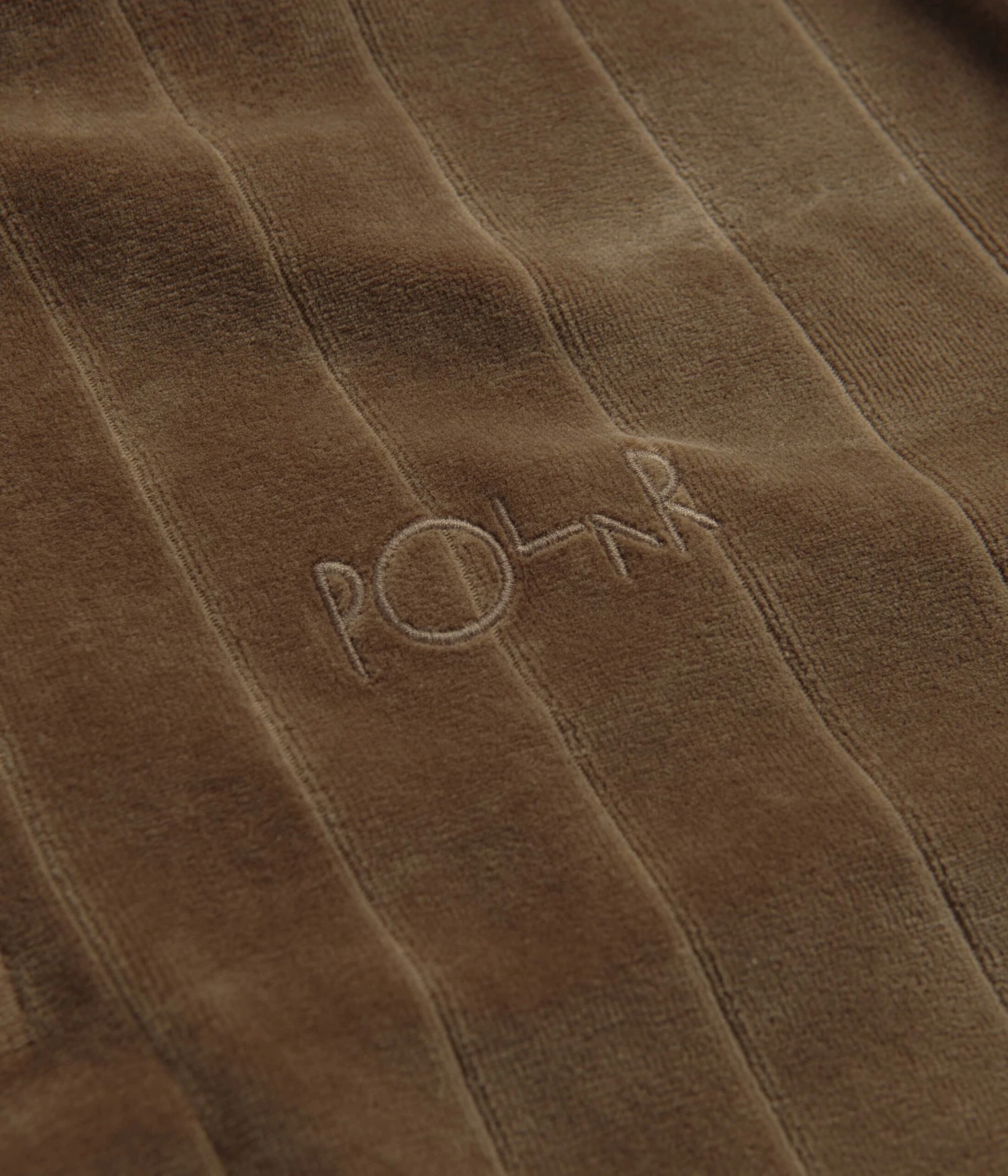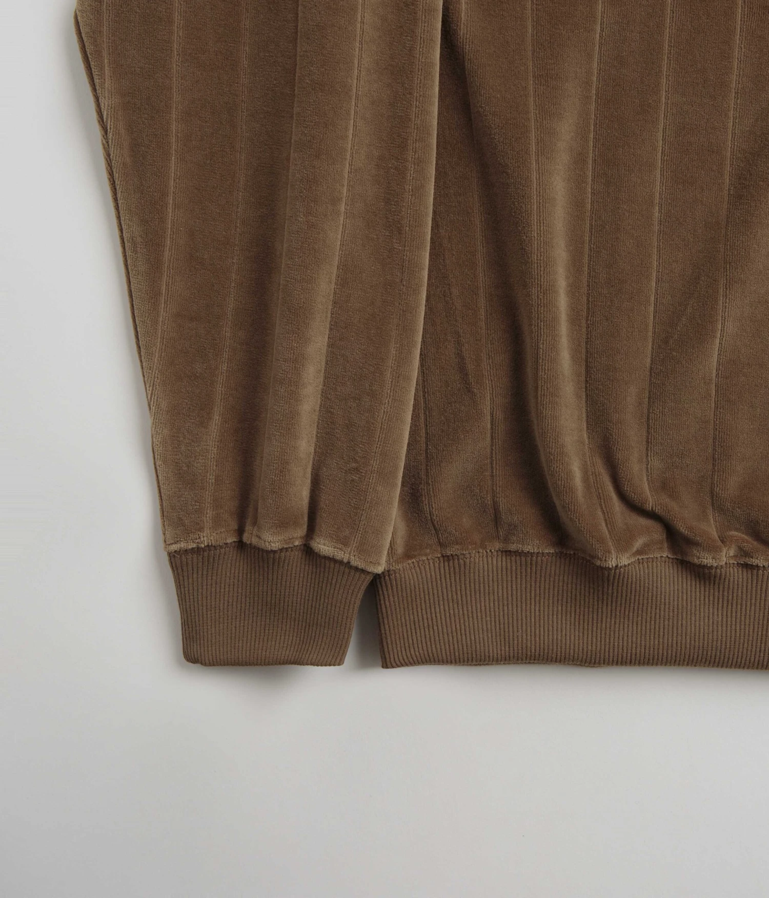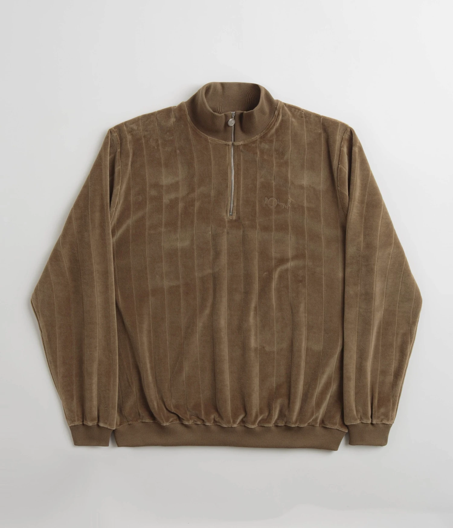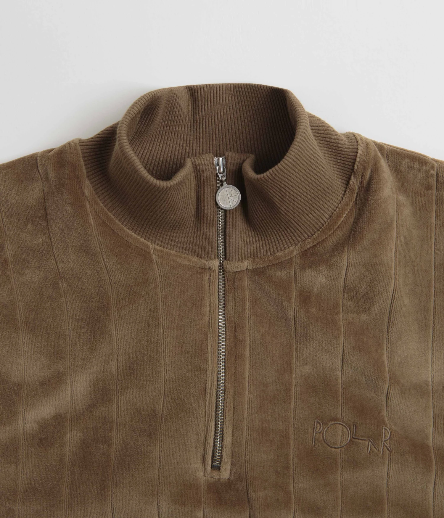 Polar Stripe Velour Zip Neck Sweatshirt in Beech. Made from a velour fabric blend, this regular fitting Polar sweatshirt is designed with a quarter-length YKK zipper. Featuring dropped shoulders, ribbed cuffs and a woven elastic hem, this khaki brown Polar sweater is finished with a custom zip puller and with an embroidered left chest logo.