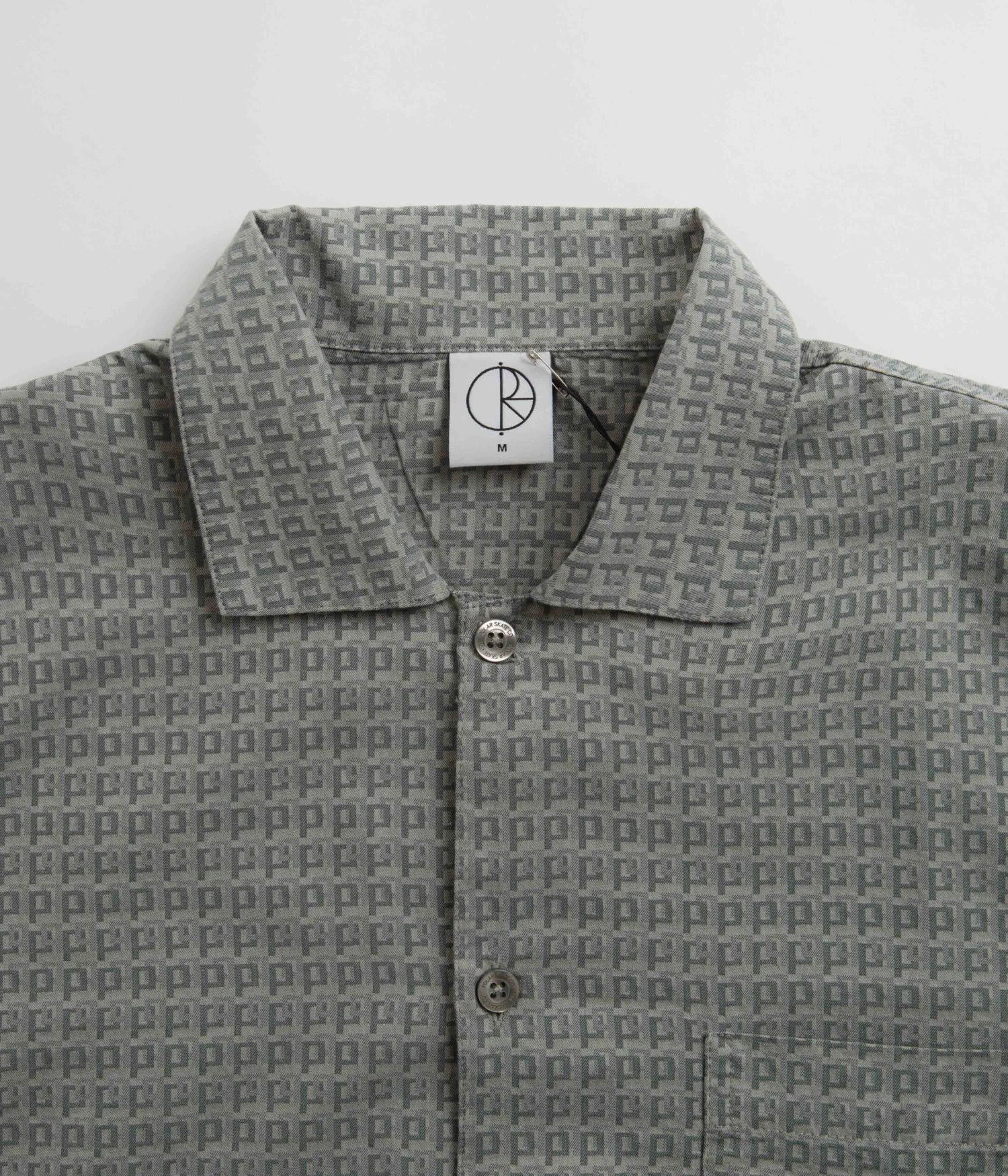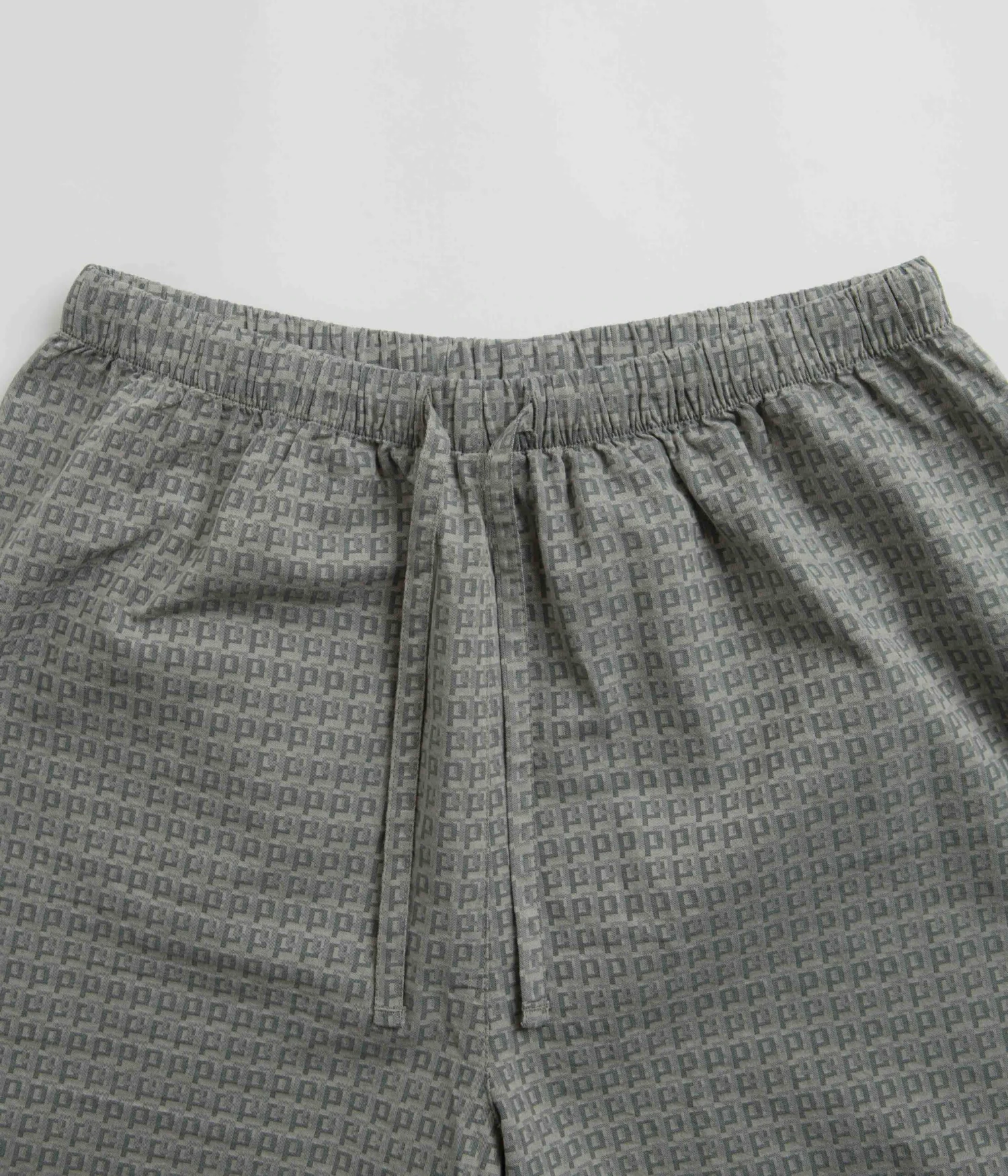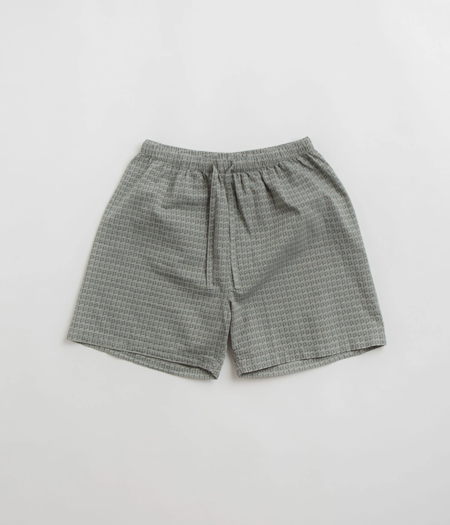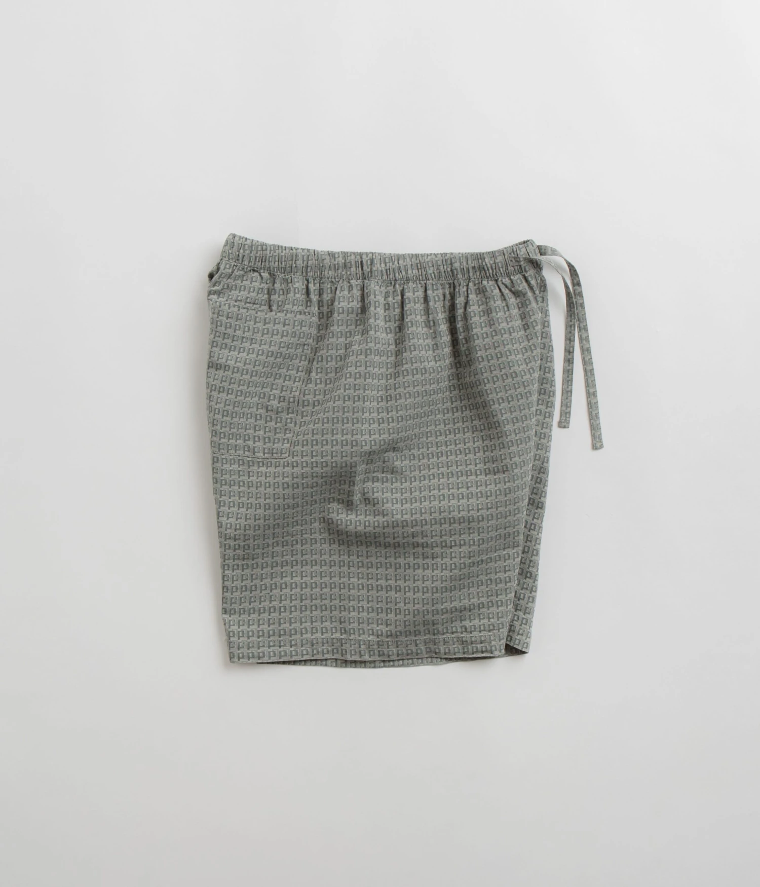 Polar Summer Pyjamas in Grey Green. A two-piece set, these Polar pyjamas are made from 100% cotton jacquard fabric with custom artwork by PSC. The short sleeve shirt is designed with a full length button fastening, faux pearl hardware, a single chest pocket and embroidered logo branding. The pyjama shorts are styled with a woven elastic waist with an adjustable drawstring tie.