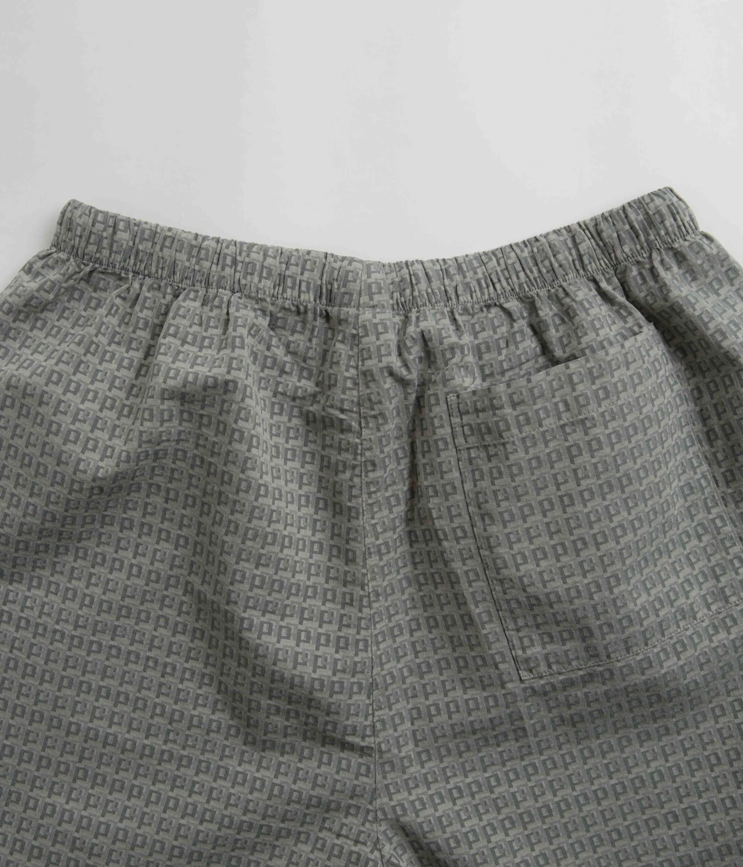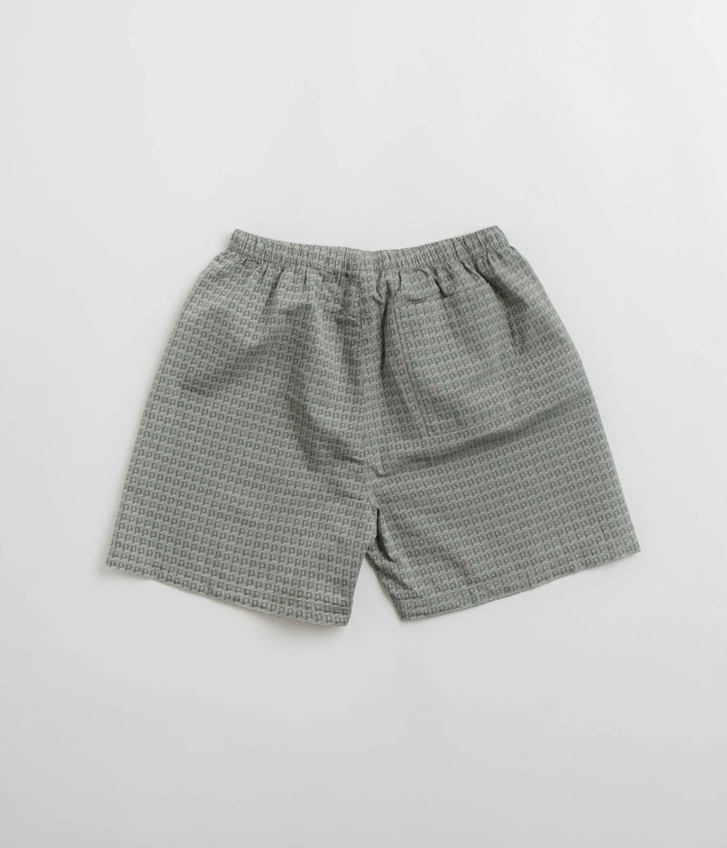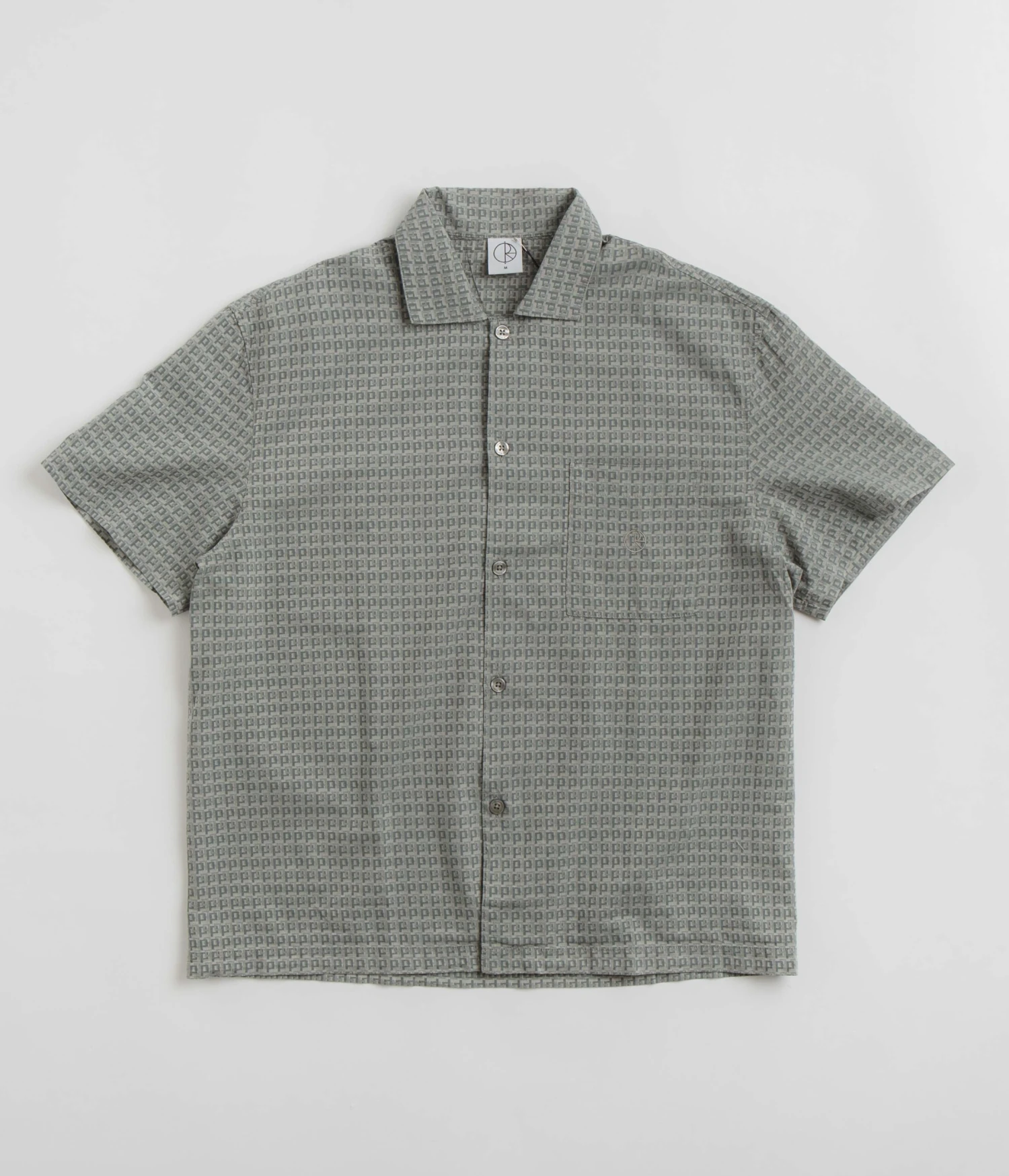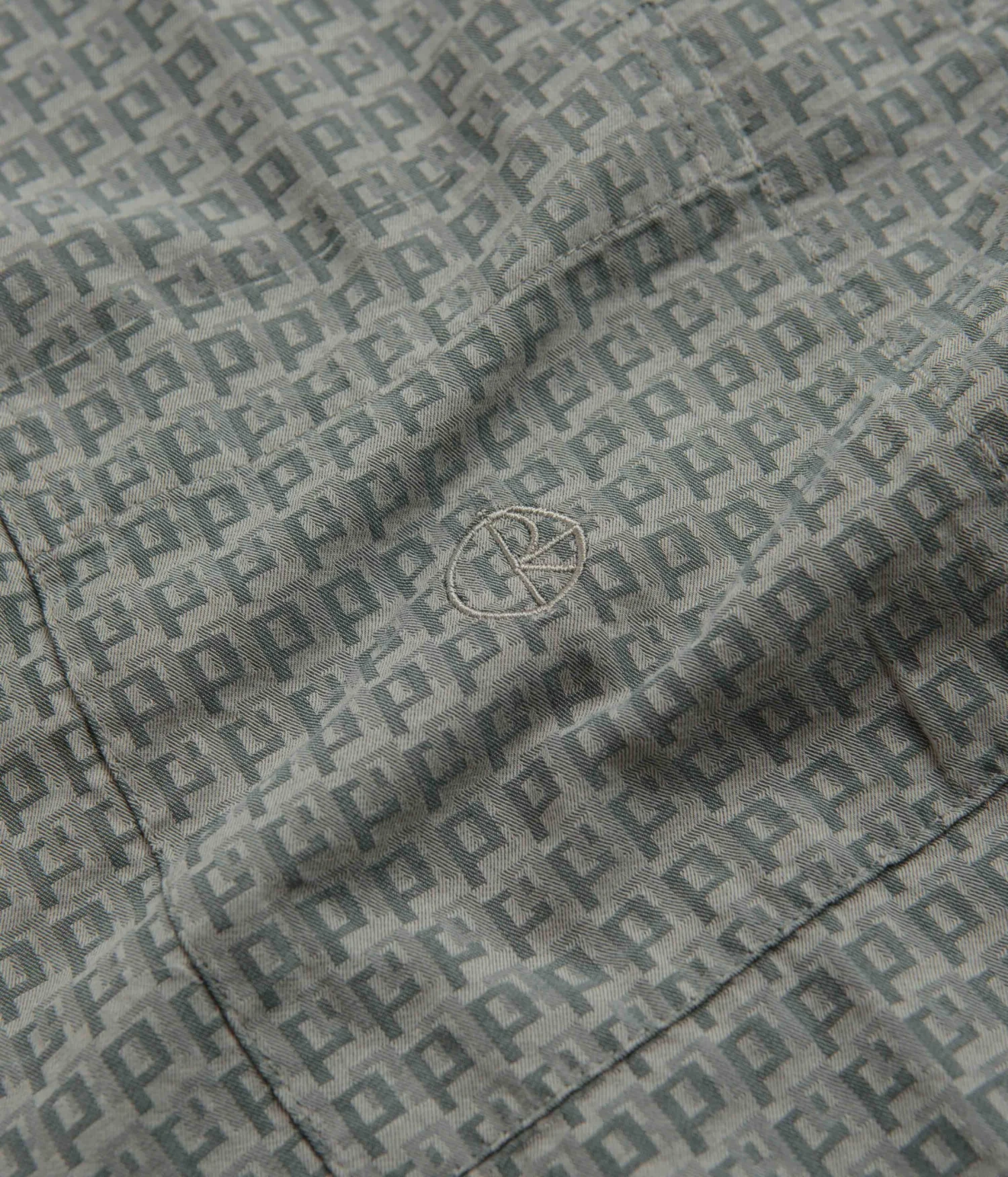 Polar Summer Pyjamas in Grey Green. A two-piece set, these Polar pyjamas are made from 100% cotton jacquard fabric with custom artwork by PSC. The short sleeve shirt is designed with a full length button fastening, faux pearl hardware, a single chest pocket and embroidered logo branding. The pyjama shorts are styled with a woven elastic waist with an adjustable drawstring tie.