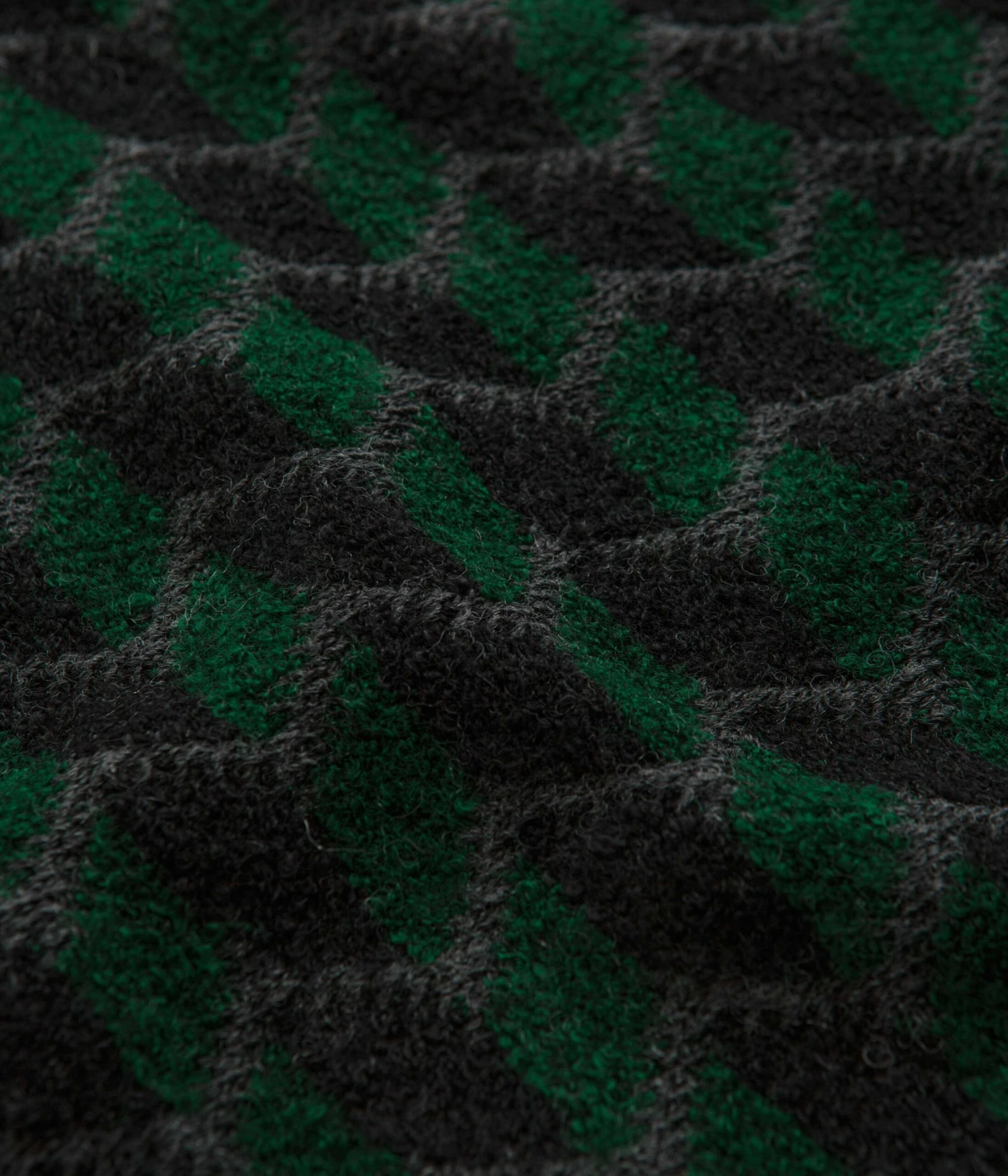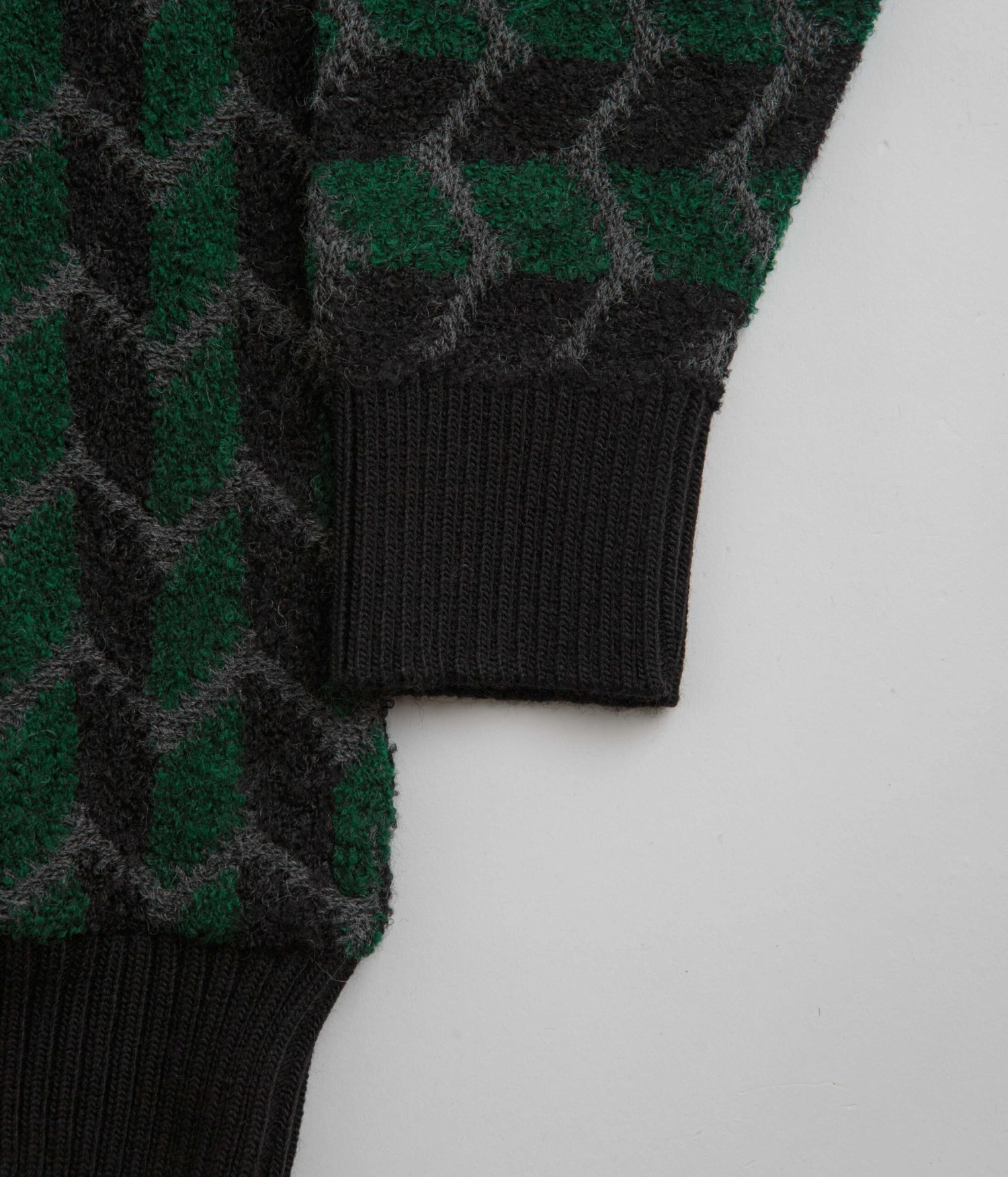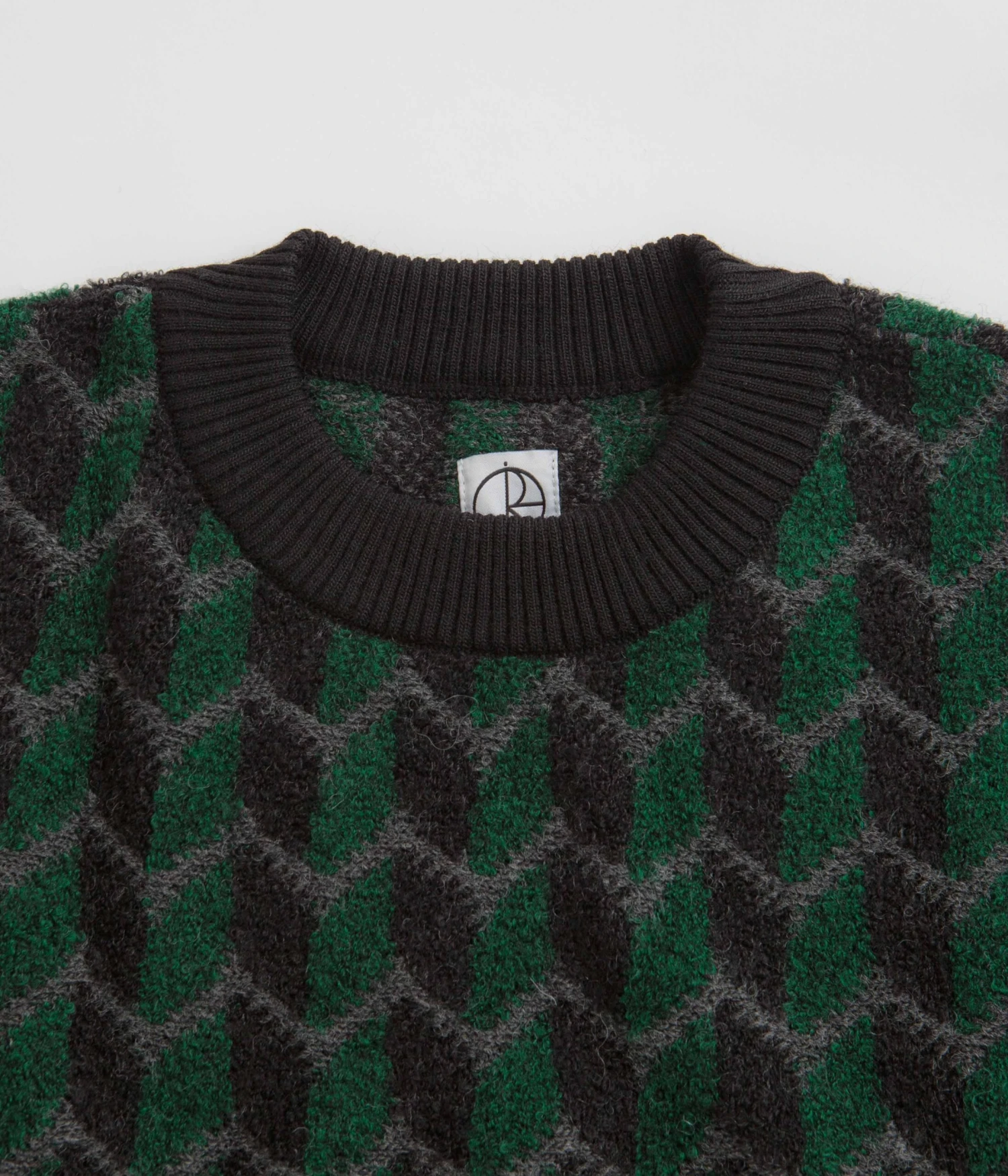 Polar Zig Zag Knit Sweatshirt in Black and Dark Teal. Vintage inspired and tailored to a boxy fitting, this Polar sweatshirt is made from an acrylic blend. Featuring an all-over jacquard knit, a ribbed collar, dropped shoulders and woven elastic cuffs, this black and green Polar sweater is finished with an all-over zig zag pattern and embroidered left chest branding.