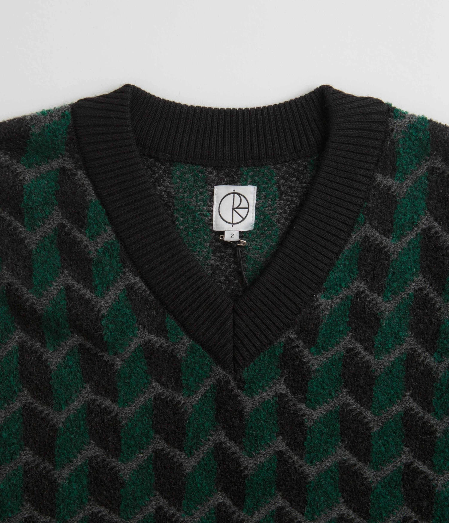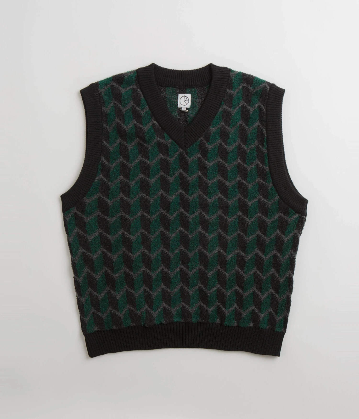 Polar Zig Zag Knit Vest in Black and Dark Teal. Tailored to a boxy fitting from an acrylic blend, this Polar vest is vintage inspired with a ribbed V-neck collar and elasticated cuffs. Sleeveless with a ribbed hem, this black and green Polar vest is finished with an all-over zig zag knitted pattern and with embroidered left chest branding.