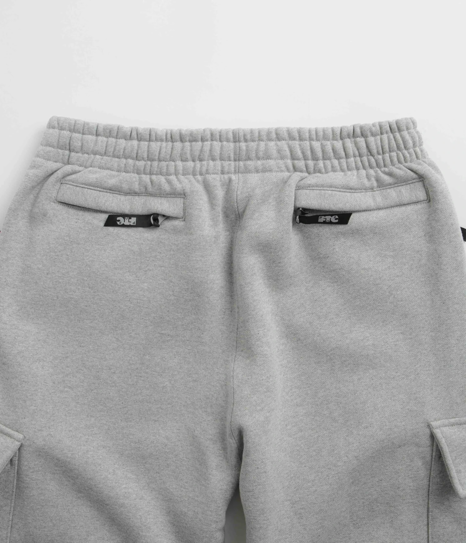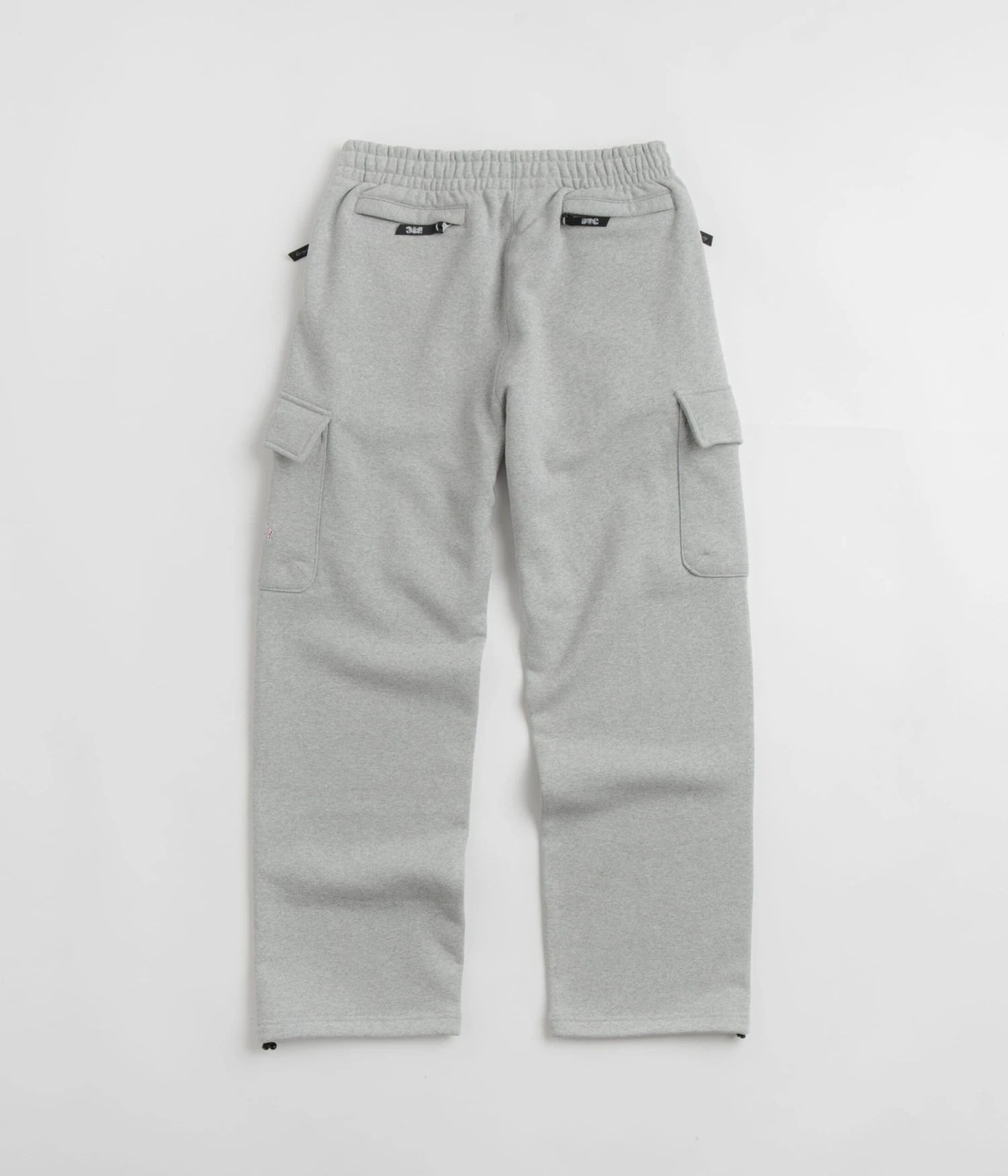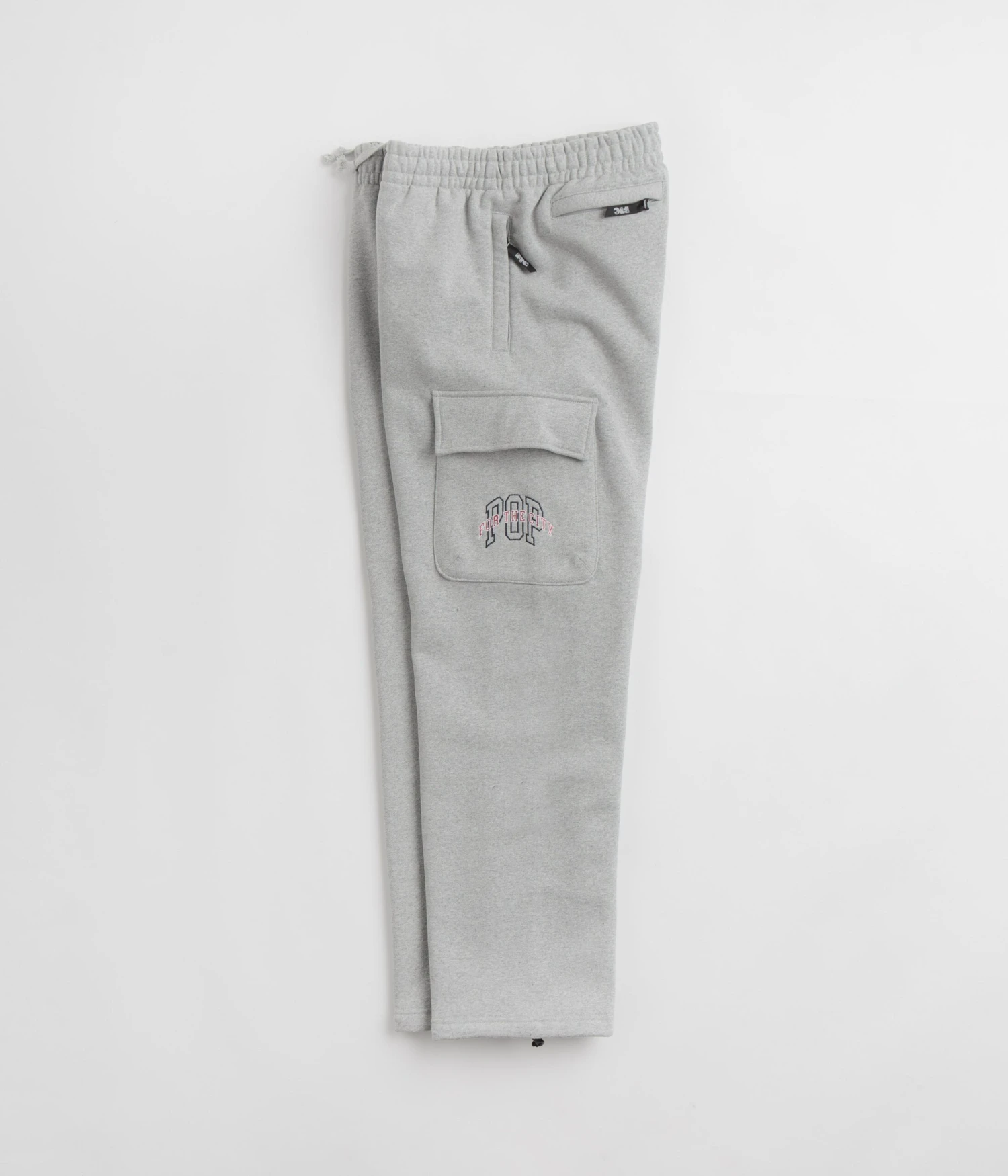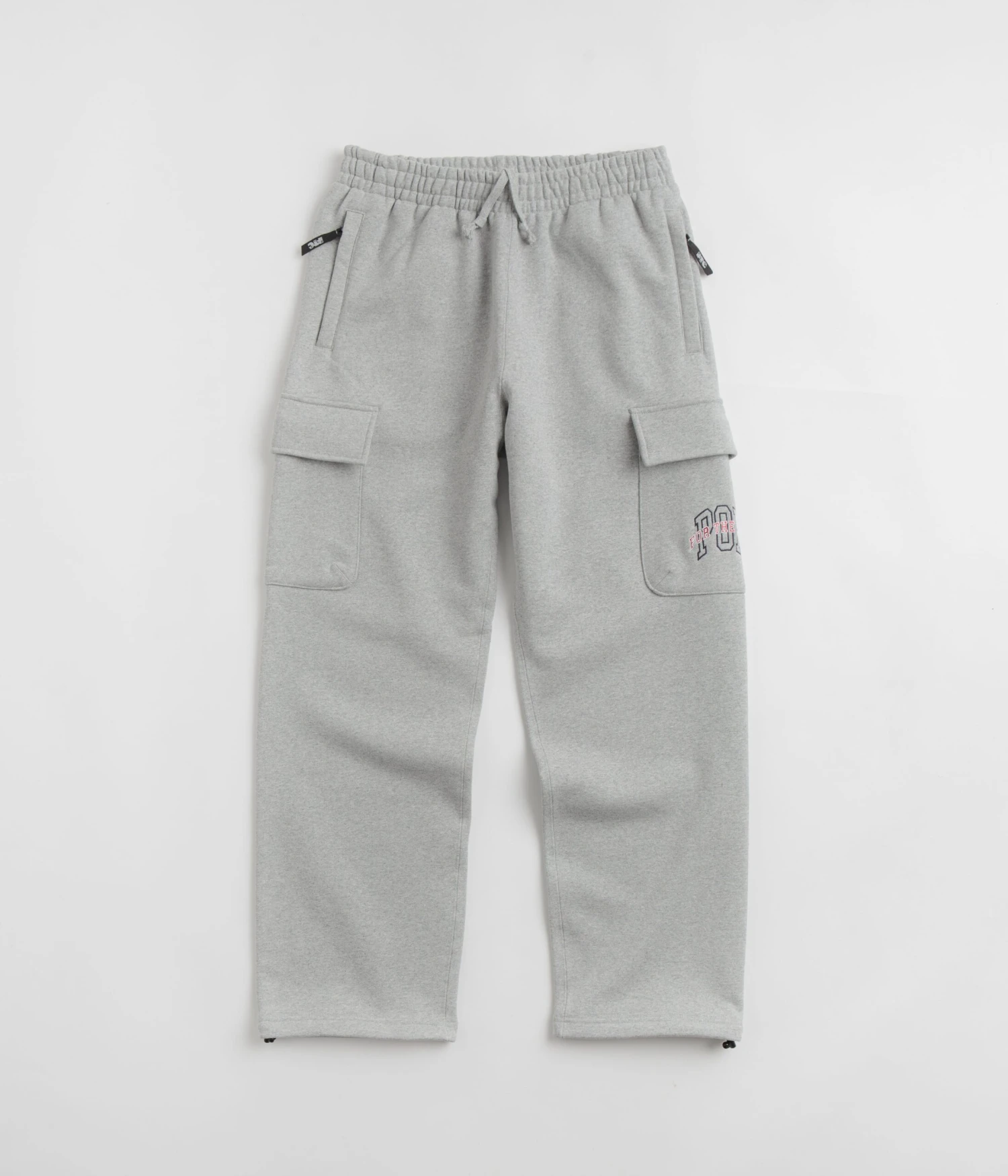 Pop Trading Company x FTC Cargo Sweatpants in Heather Grey. Relaxed fitting and part of the brand’s latest collaboration with FTC, these Pop Trading Company sweatpants are made from 100% heavyweight cotton. Featuring an elasticated drawstring waistband and toggle-cord adjustable cuffs, these grey Pop Trading Company sweatpants are finished with two zippered front pockets, two zippered rear pockets, cargo pockets, co-designed zip pulls and with embroidered logo branding.
