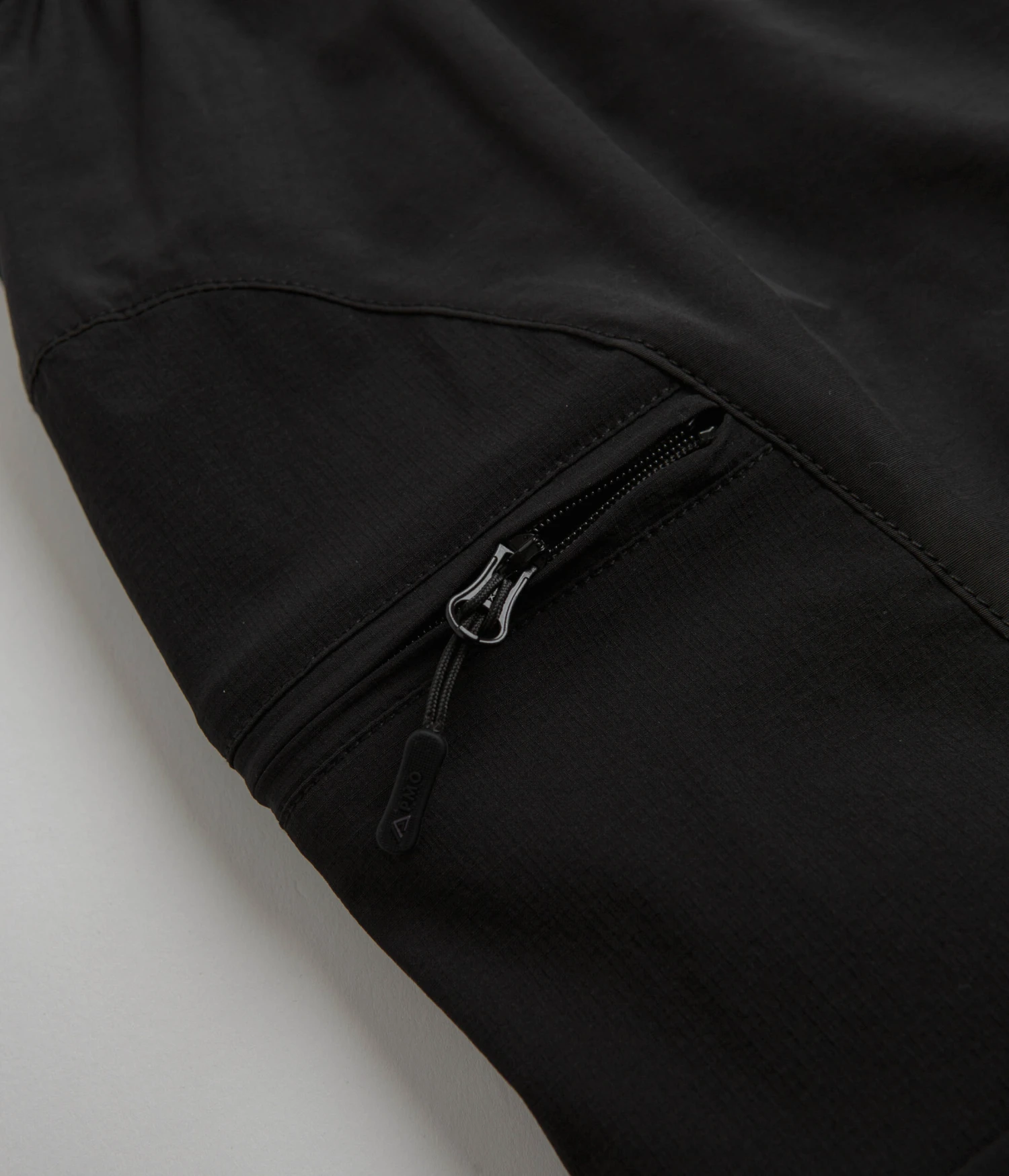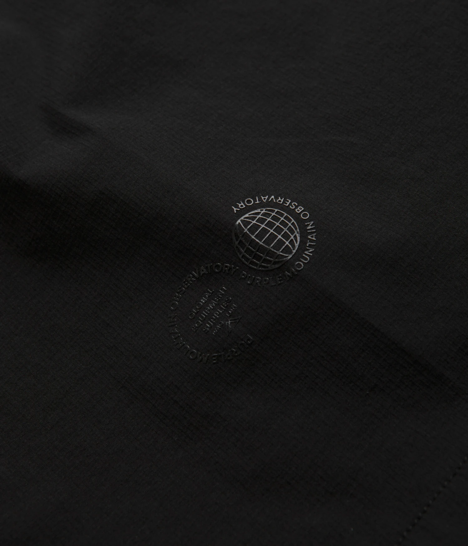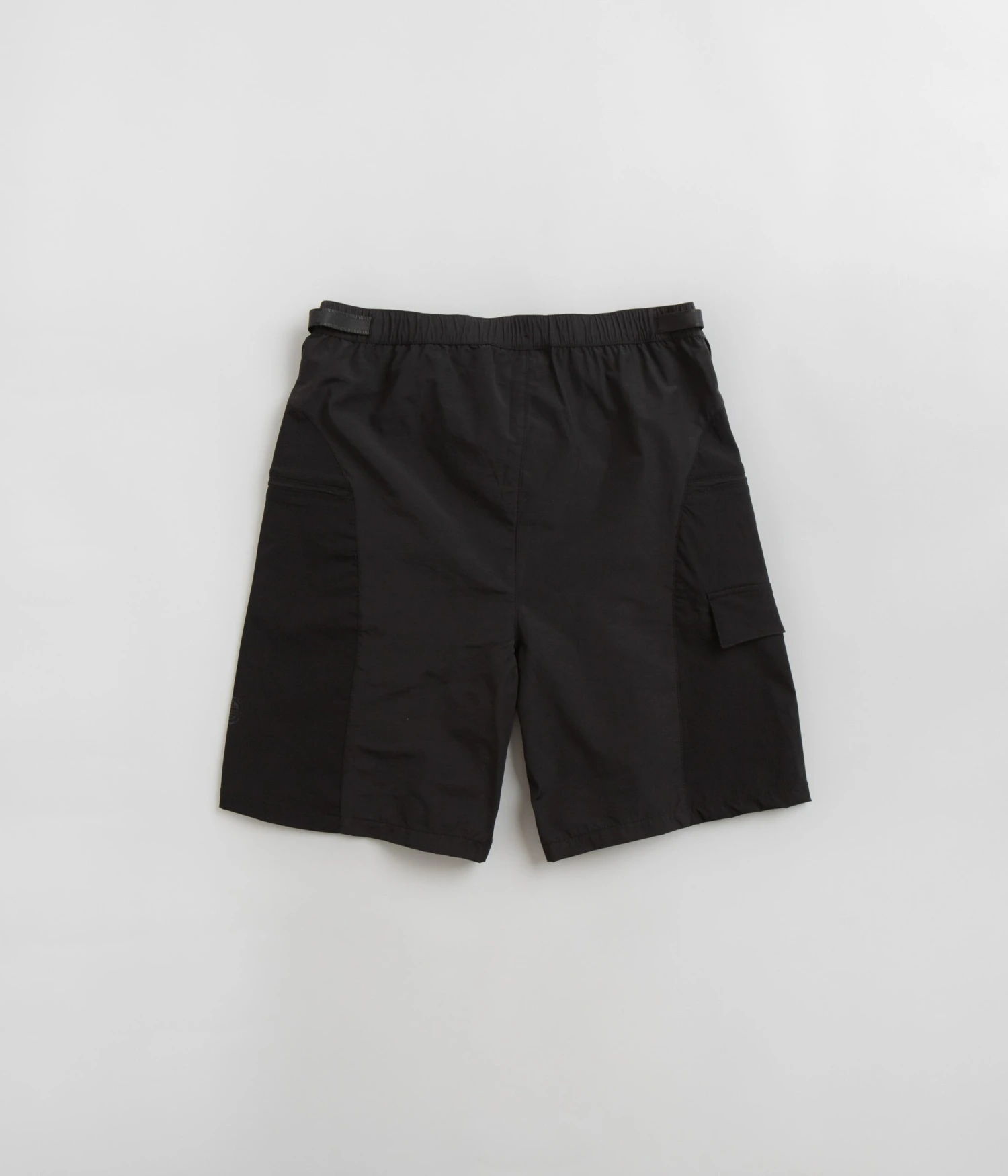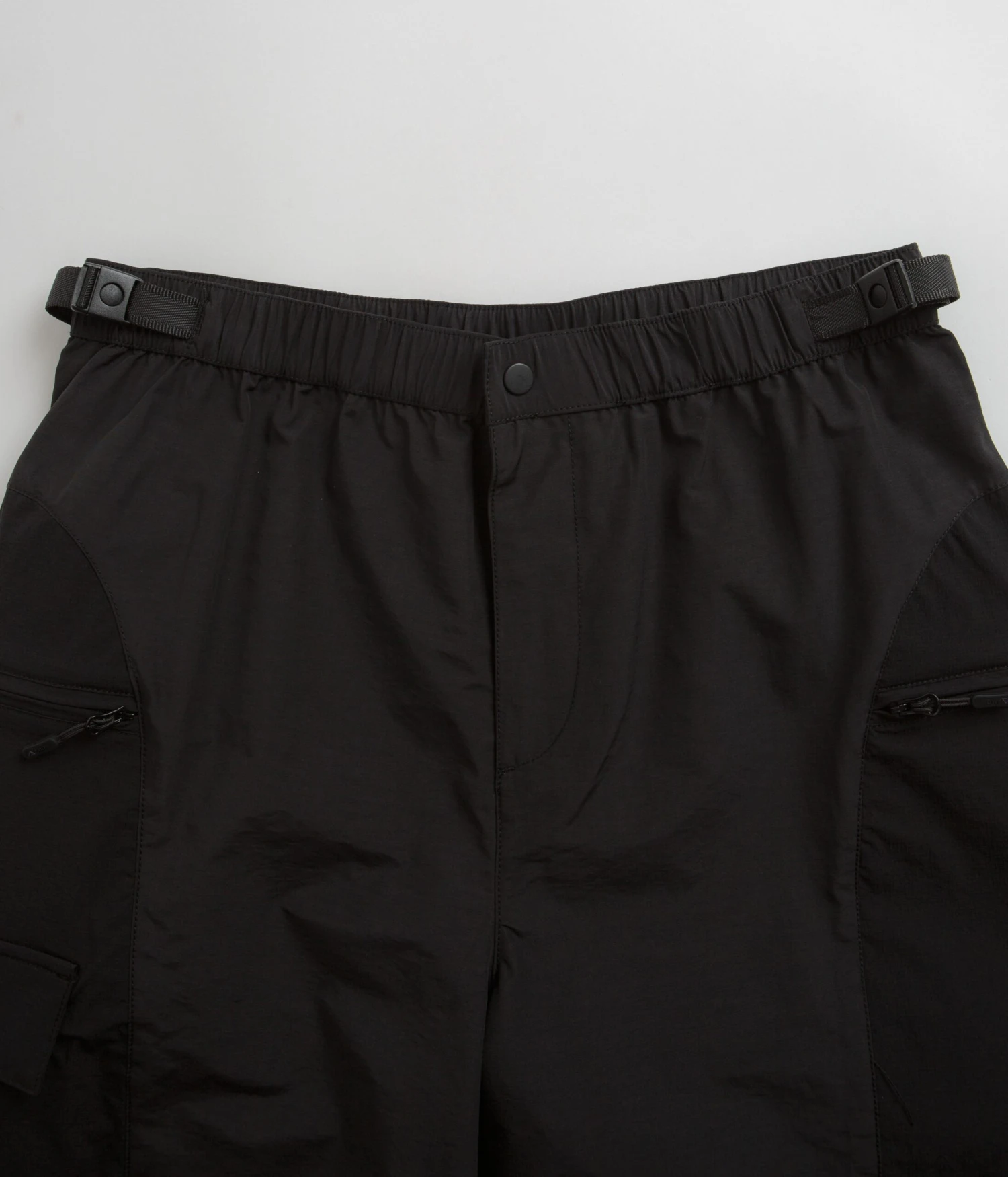 Purple Mountain Observatory Expedition Shorts in Black. Utility inspired and tailored to a regular fitting, these Purple Mountain Observatory shorts are made from a water-repellent nylon elastane blend. Featuring an adjustable waist, a single button secured zipper fly and two zippered side pockets, these black Purple Mountain Observatory shorts are finished with an additional utility pocket and printed logo branding.