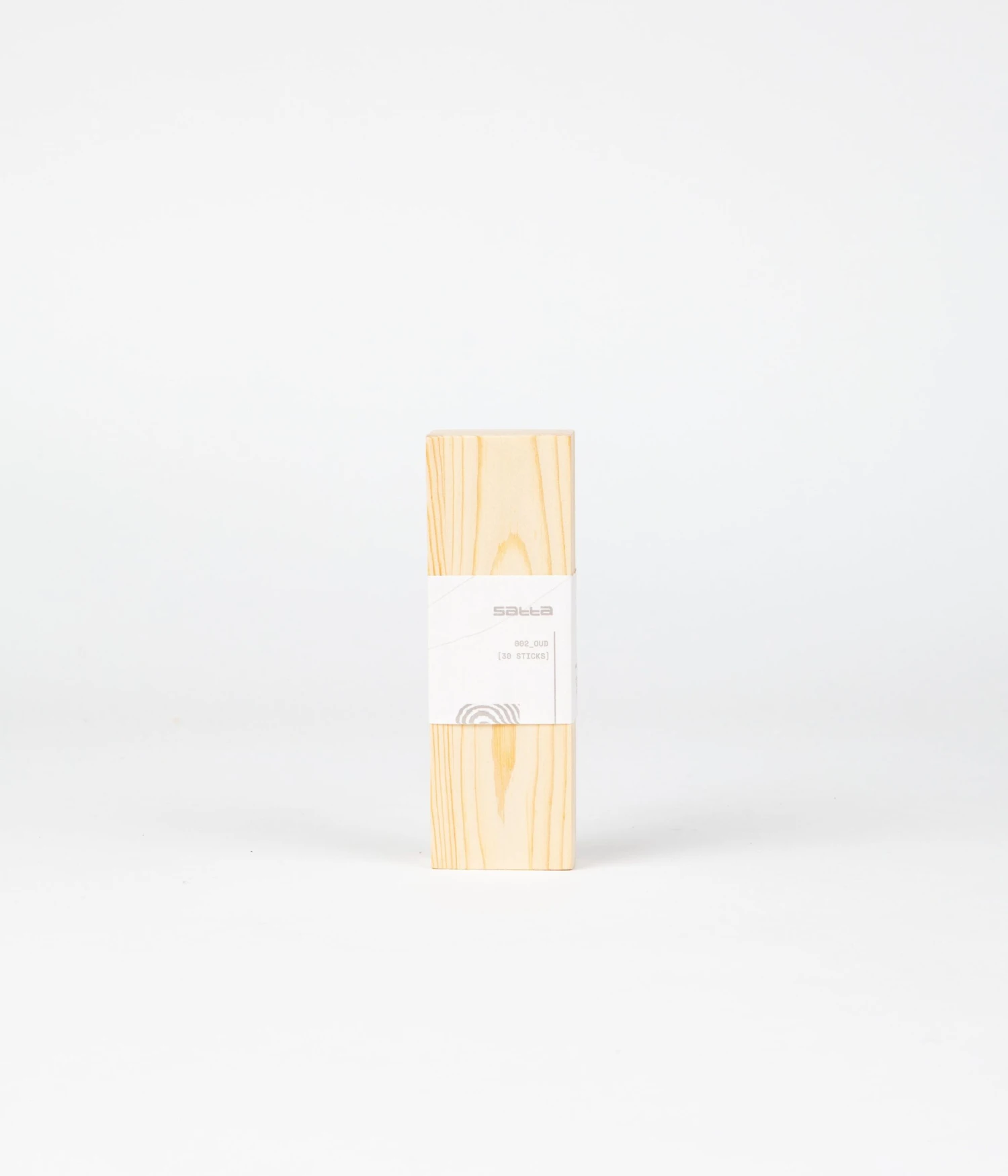 Satta 002_OUD Incense 30 Pack. Made from 100% natural ingredients and stored within a handcrafted pine box with Japanese washi paper, this 30 pack of Satta incense sticks features a light, woody and warm fragrance. Each stick measures 30cm in length with a natural oud scent.