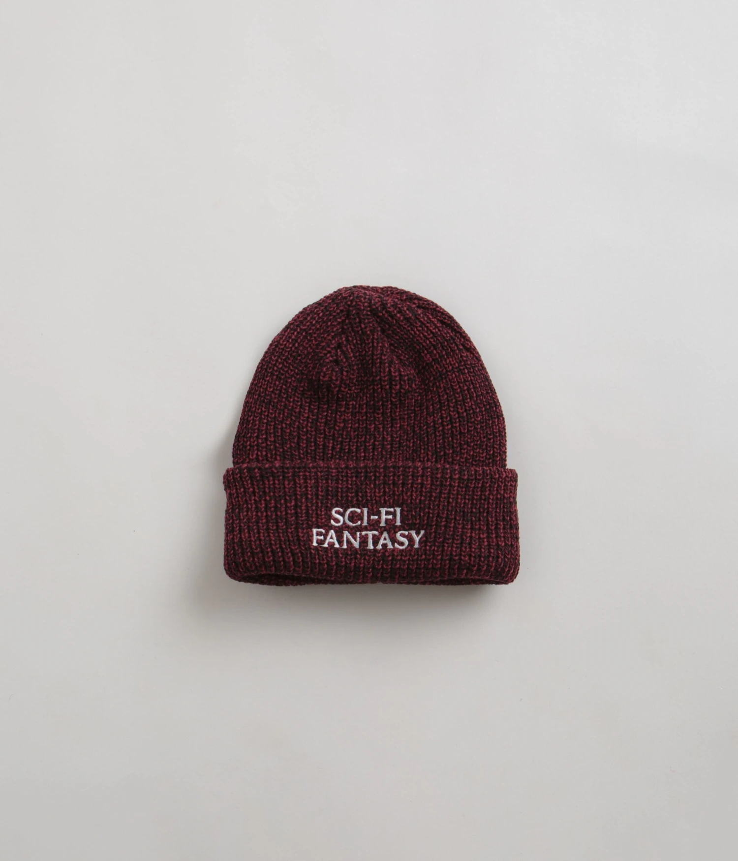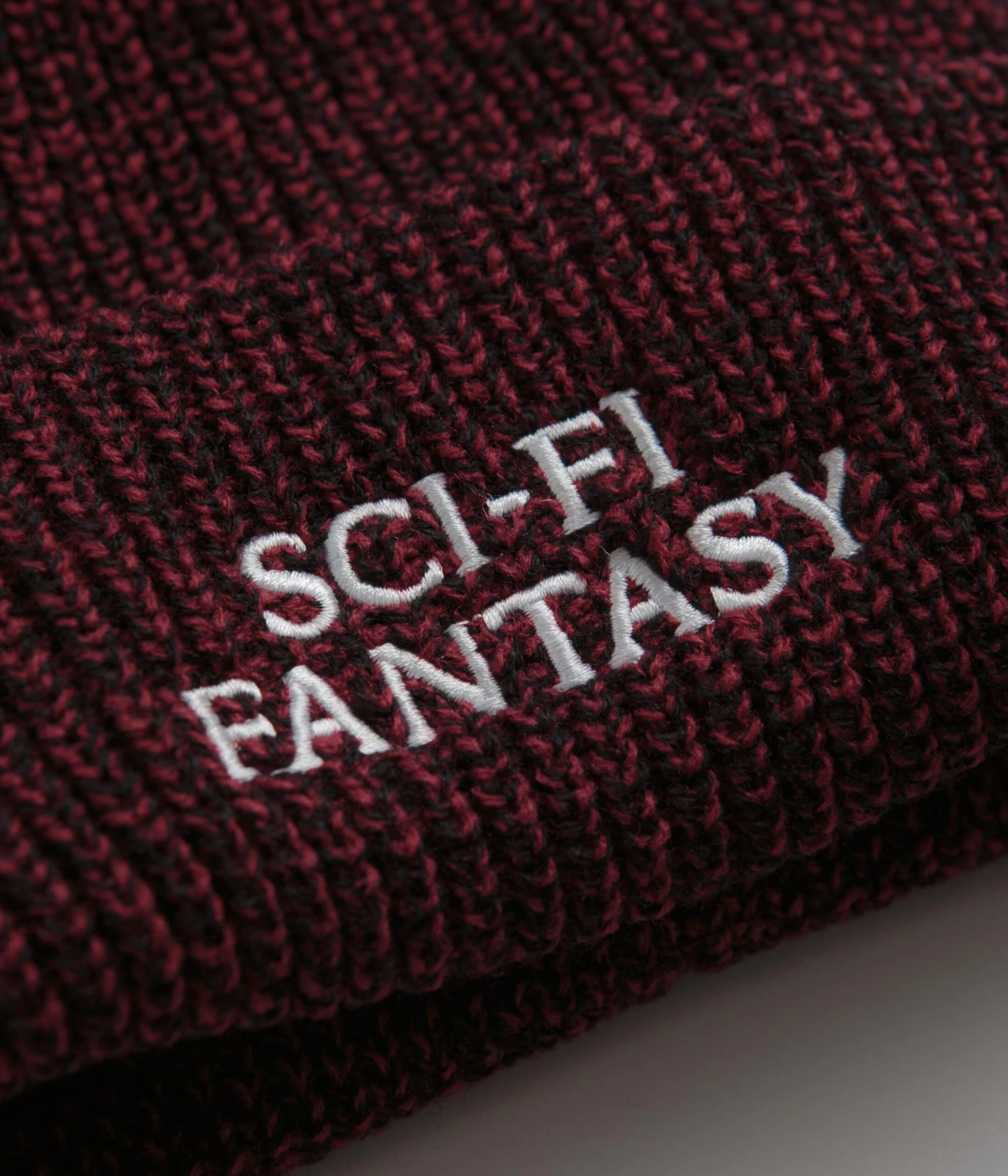 Sci-Fi Fantasy Mixed Yarn Logo Beanie in Red and Black. Single sized and made from mixed acrylic yarn, this Sci-Fi Fantasy beanie is designed with a stretchy rib knit face and an adjustable turn-up cuff. Finished in a shade of red and black with embroidered branding.