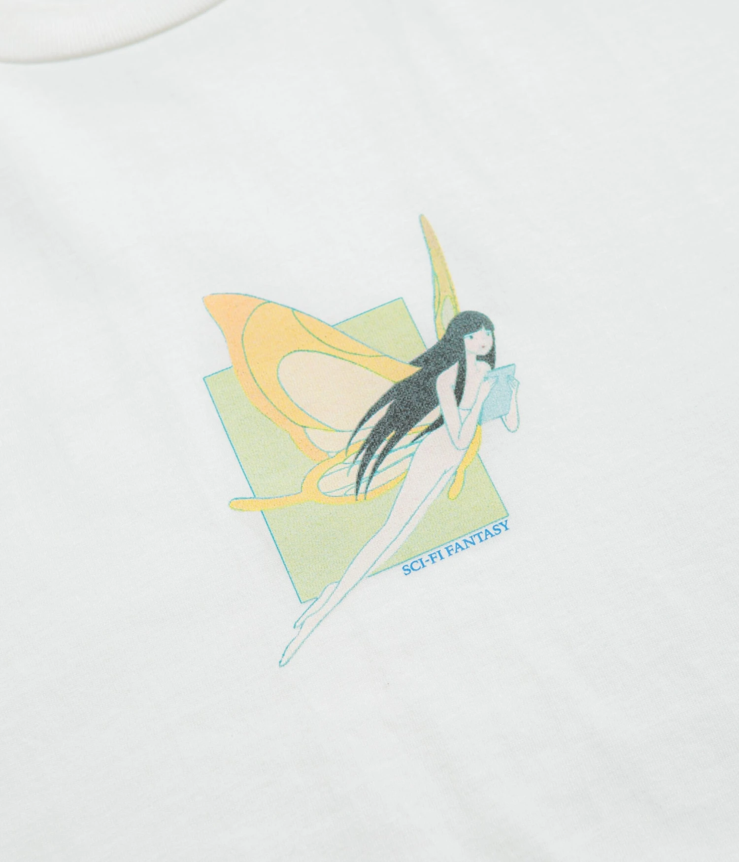 Sci-Fi Fantasy Moth Girl T-Shirt in White. Tailored to a regular fitting from 100% cotton, this new season Sci-Fi Fantasy t-shirt is designed with a classic crew collar and a straight cut hem. Finished in a shade of white with a screen printed centre chest graphic.