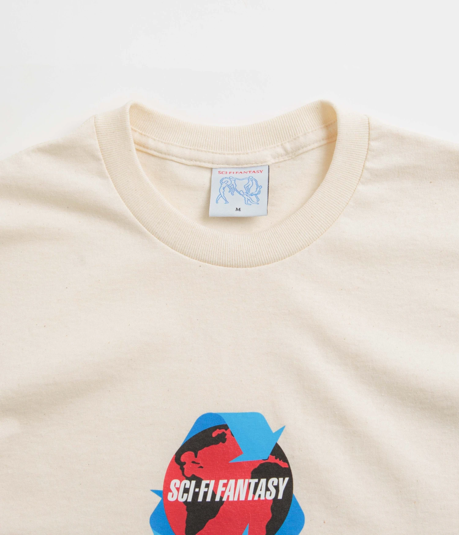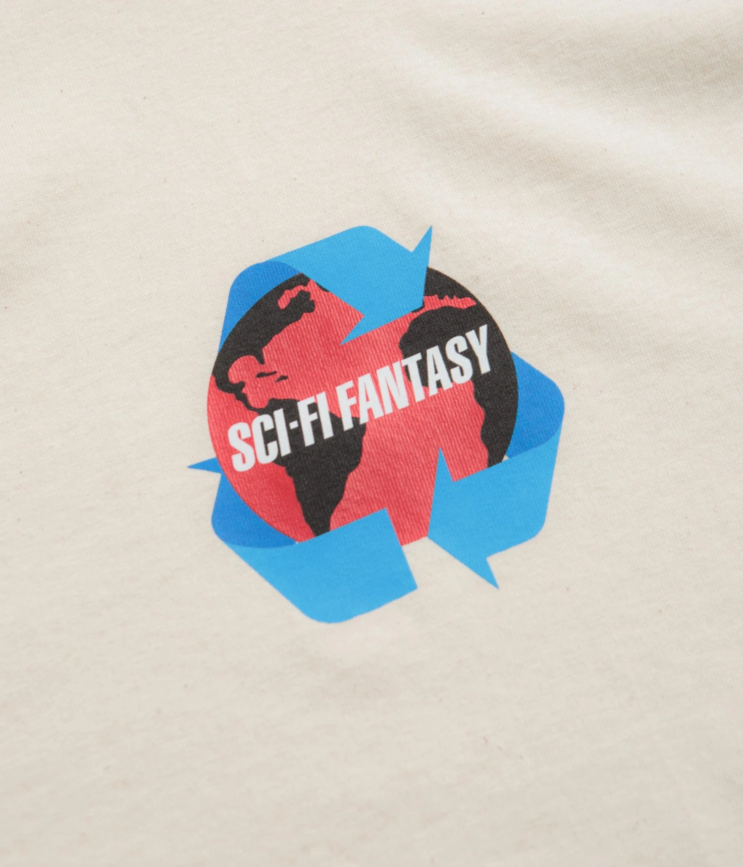 Sci-Fi Fantasy Recycle T-Shirt in Natural. Tailored to a regular fitting from 100% cotton, this new season Sci-Fi Fantasy t-shirt is designed with a flexible rib knit collar and a straight cut hem. Finished in a shade of beige khaki with a screen printed Sci-Fi Fantasy recycle graphic.
