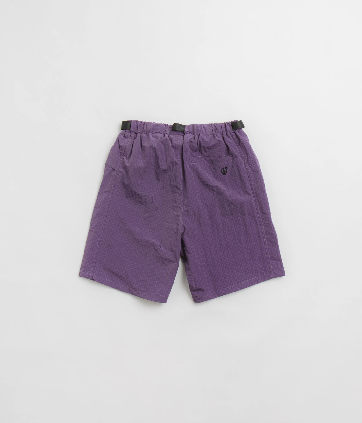 Sexhippies Rapids Shorts in Purple. Tailored to a regular fitting from nylon ripstop, these above-knee Sexhippies shorts are designed with a mesh lining and a woven elastic waist. Featuring an integrated webbing belt, an 8” inseam and an embroidered rear logo, these purple Sexhippies shorts are finished with two front pockets and with a single rear pocket.
