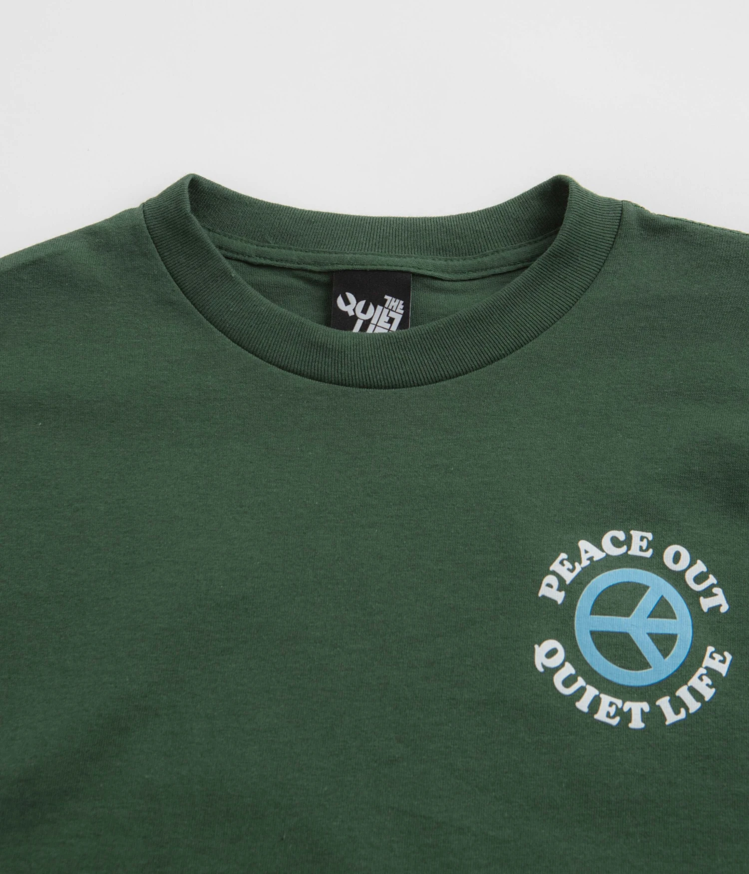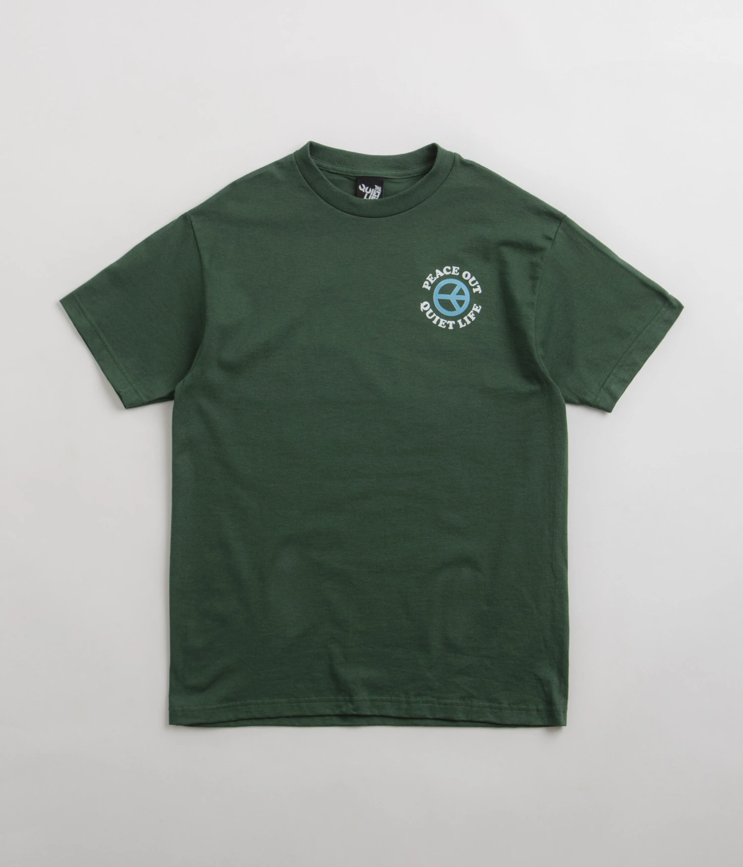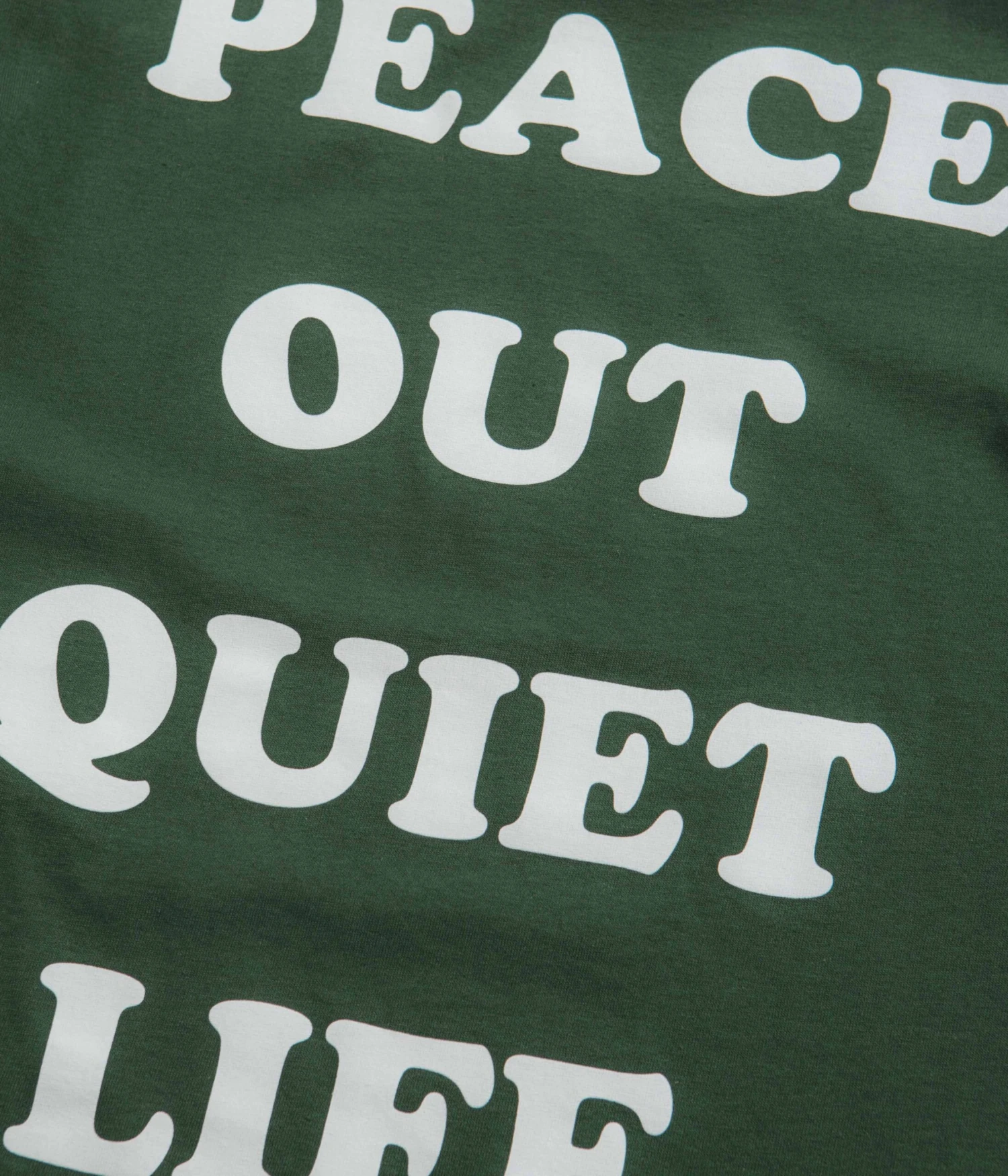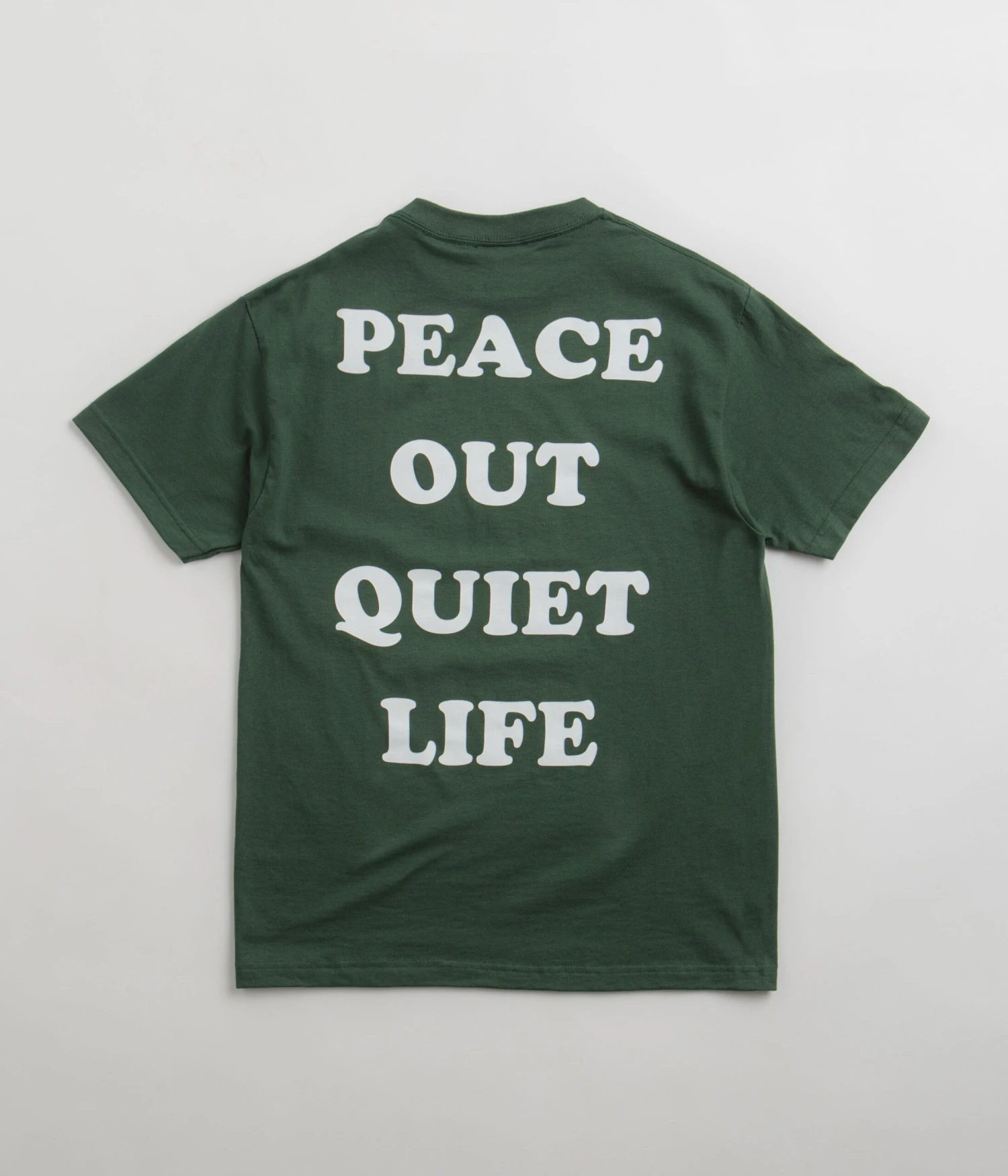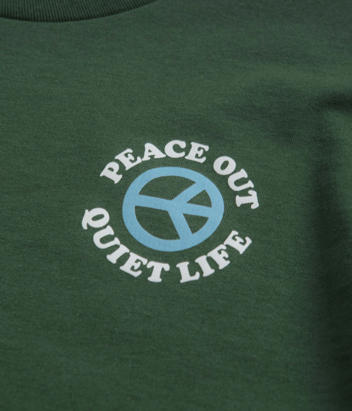 The Quiet Life Peace Out T-Shirt in Hunter Green. Part of the brand’s latest release, this regular fitting The Quiet Life t-shirt is made from 100% cotton. Featuring a flexible rib knit collar and a straight cut hem, this green The Quiet Life t-shirt is finished with printed Peace Out Quiet Life front and rear artwork.
