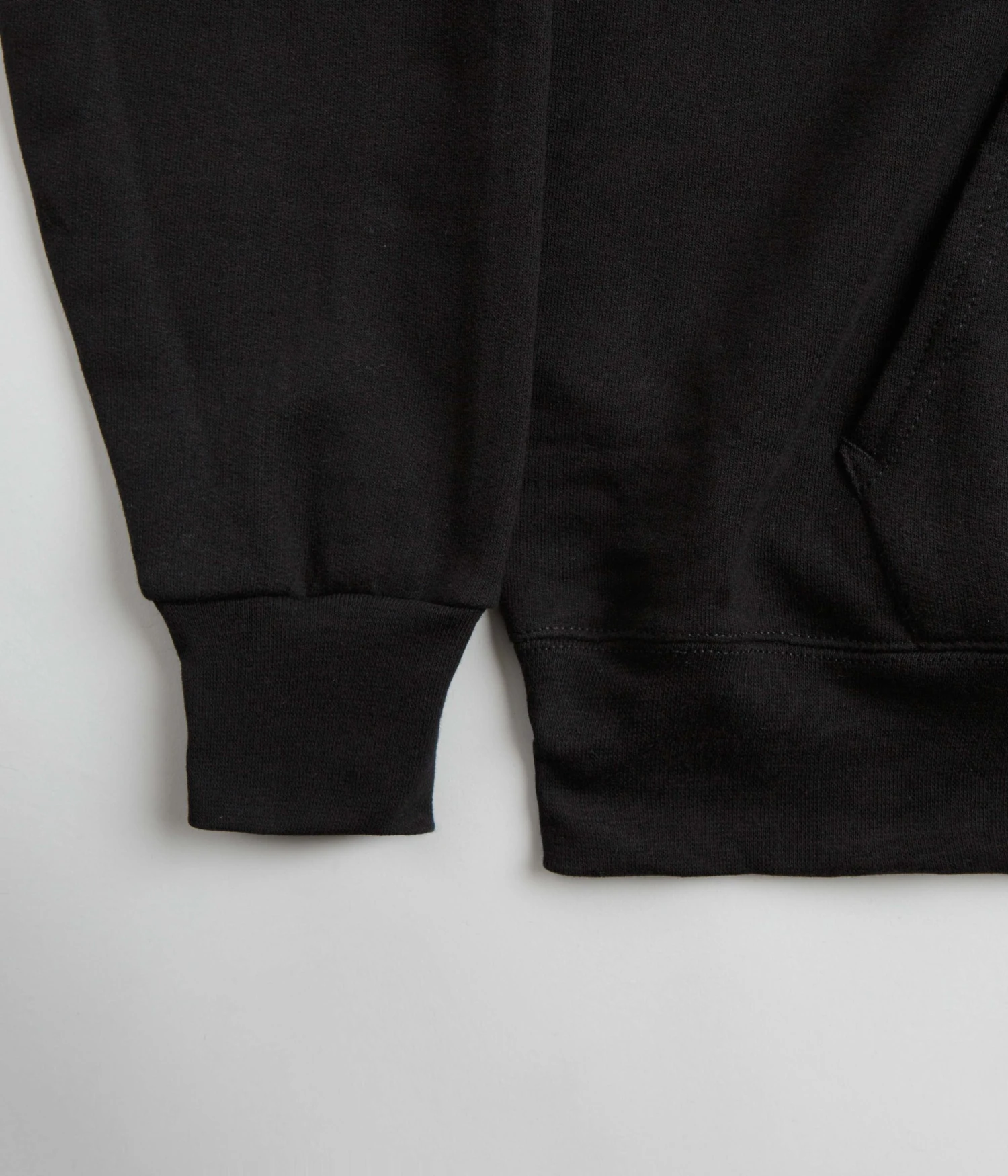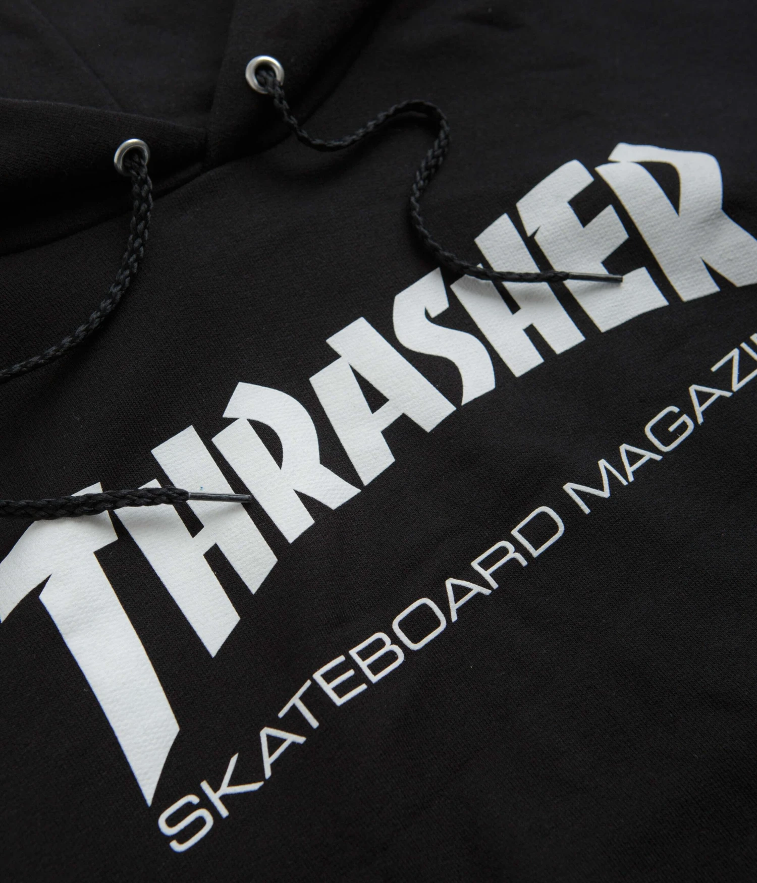Thrasher Skate Mag Hoodie in Black. Tailored to a regular fitting from a cotton-polyester blend, this colour block Thrasher hoodie is designed with a drawstring hood and ribbed cuffs. Finished in a shade of black with a woven elastic hem, a kangaroo front pocket and with a printed chest graphic.