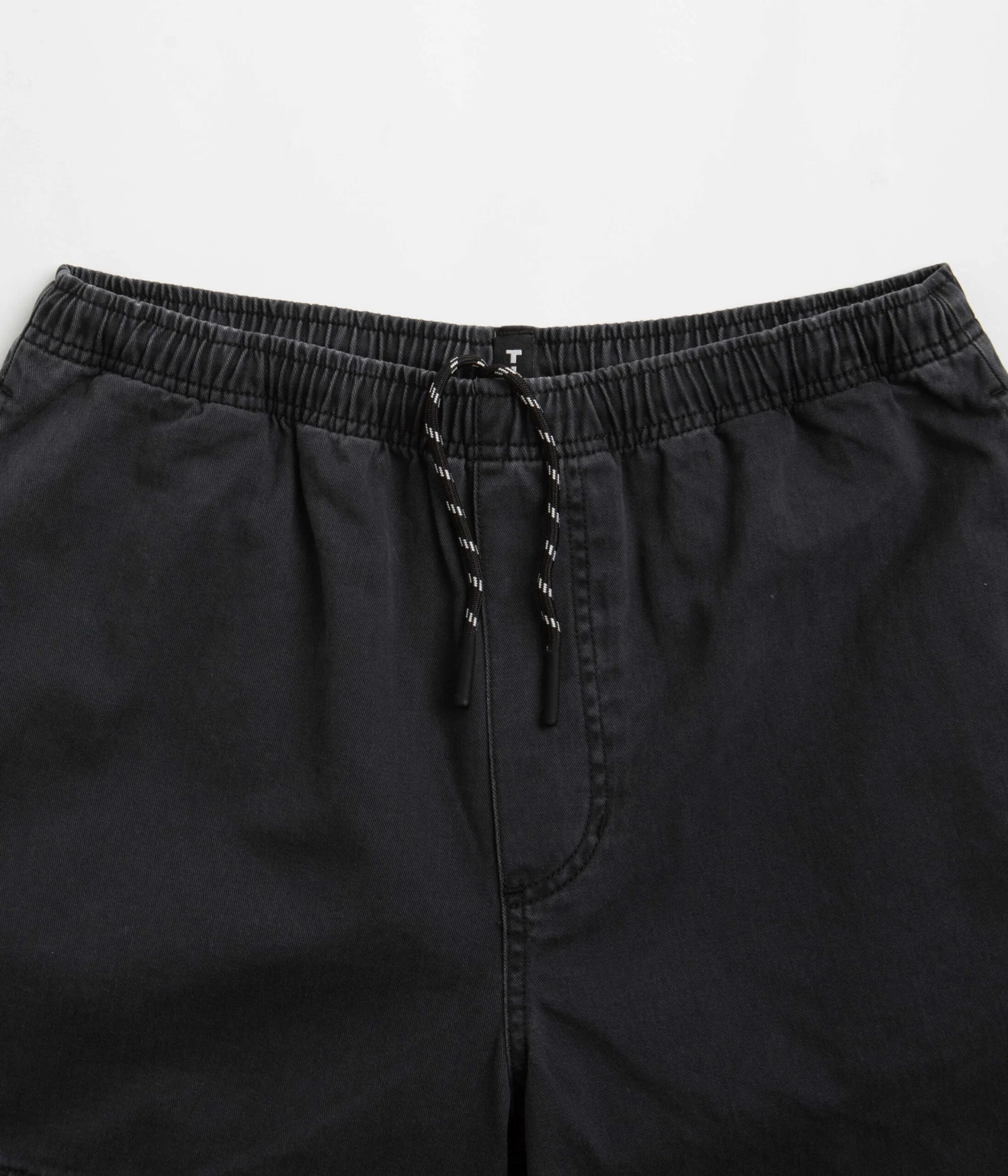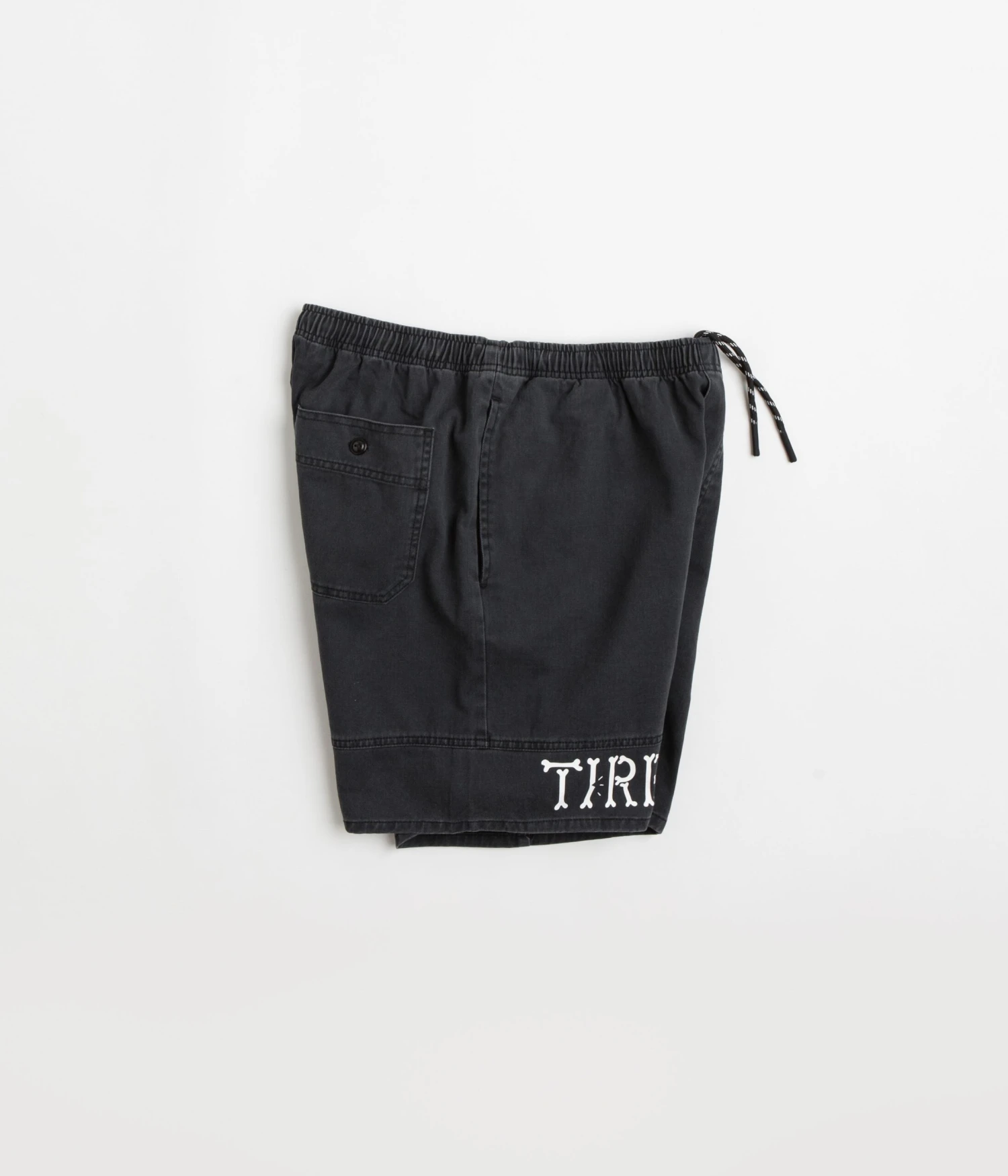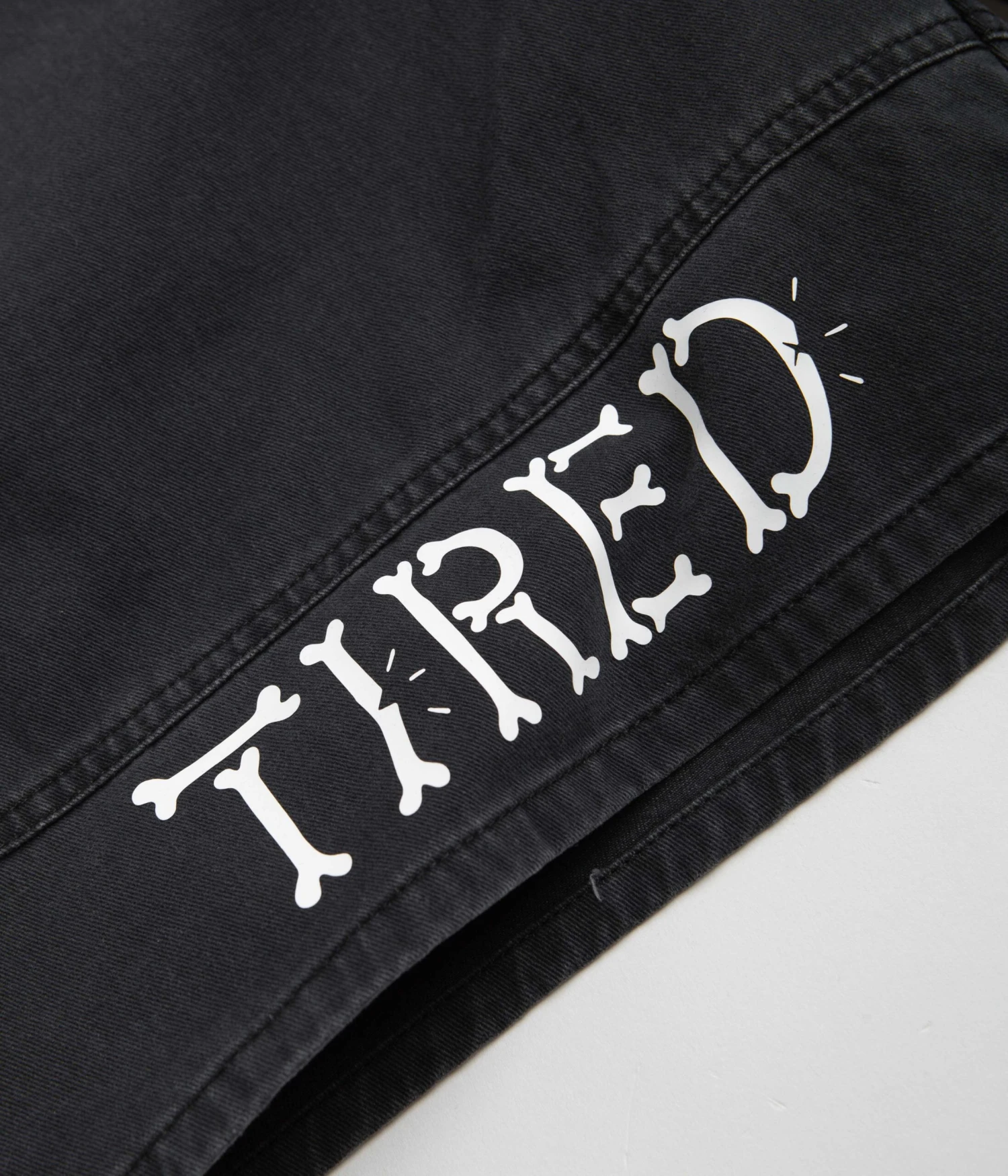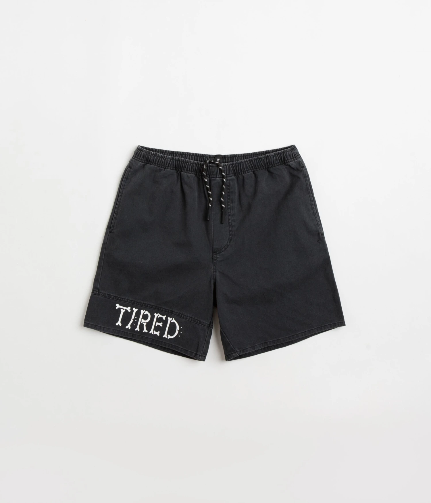 Tired Broken Bones Shorts in Washed Black. Tailored to a regular fitting with an above-knee cut, these Tired shorts are made from 100% cotton. Featuring a washed fabric finish and an elasticated waist, these black Tired shorts are finished with two side pockets, a single rear pocket and a Tired bones graphic displayed across the panelled right leg.