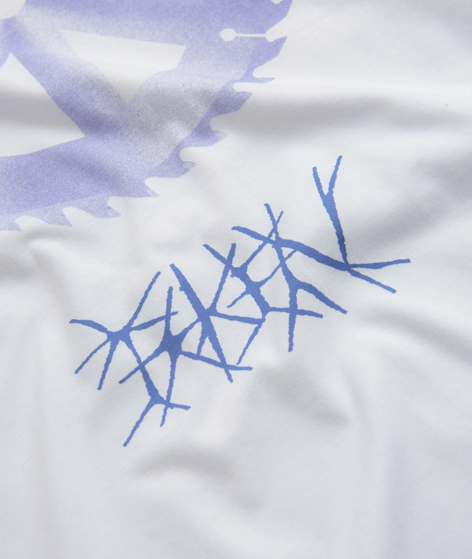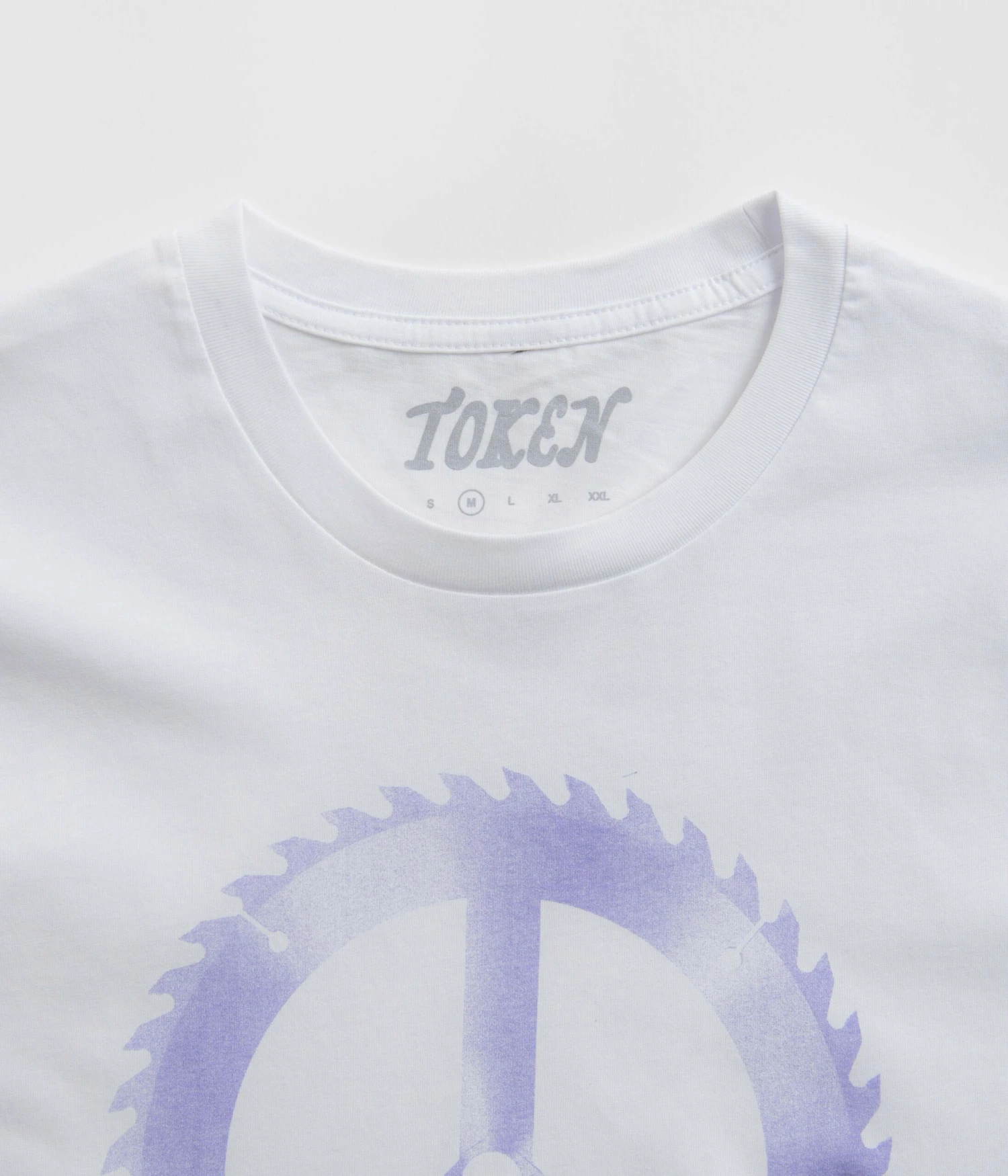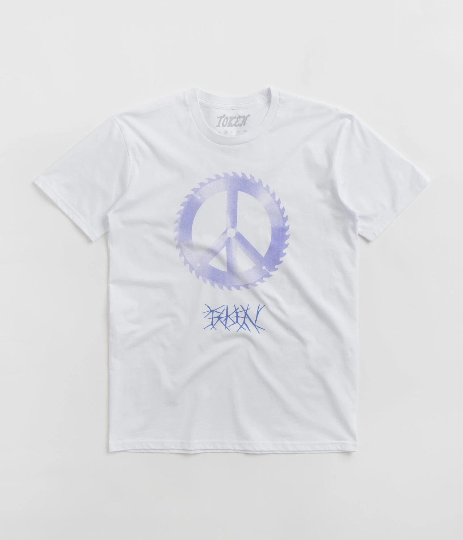 Token Saw Blade T-Shirt in White. Made from 100% cotton, this block tone Token t-shirt is tailored to a regular fitting with a rib knit collar and a reinforced hem. Finished in a shade of white with printed centre chest artwork.