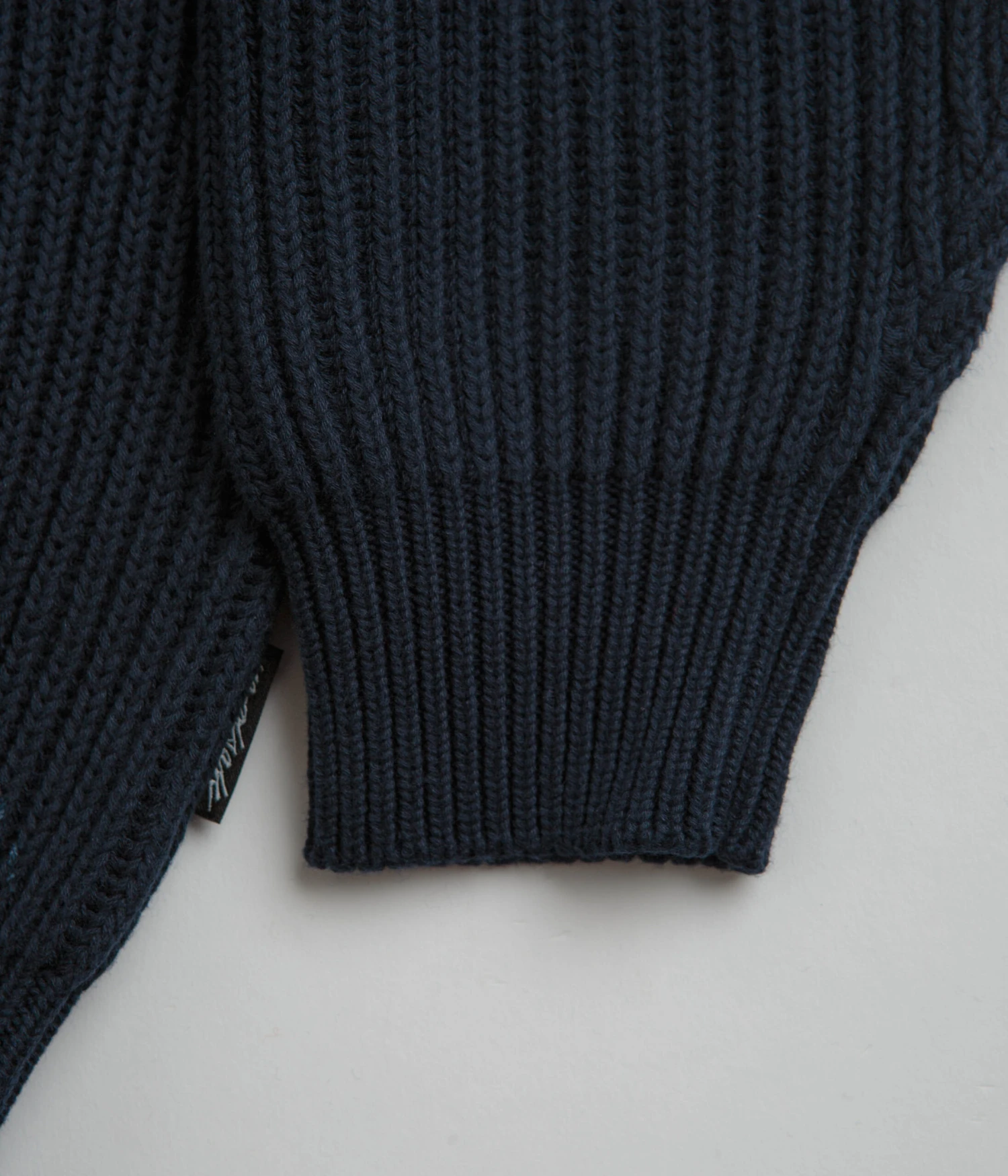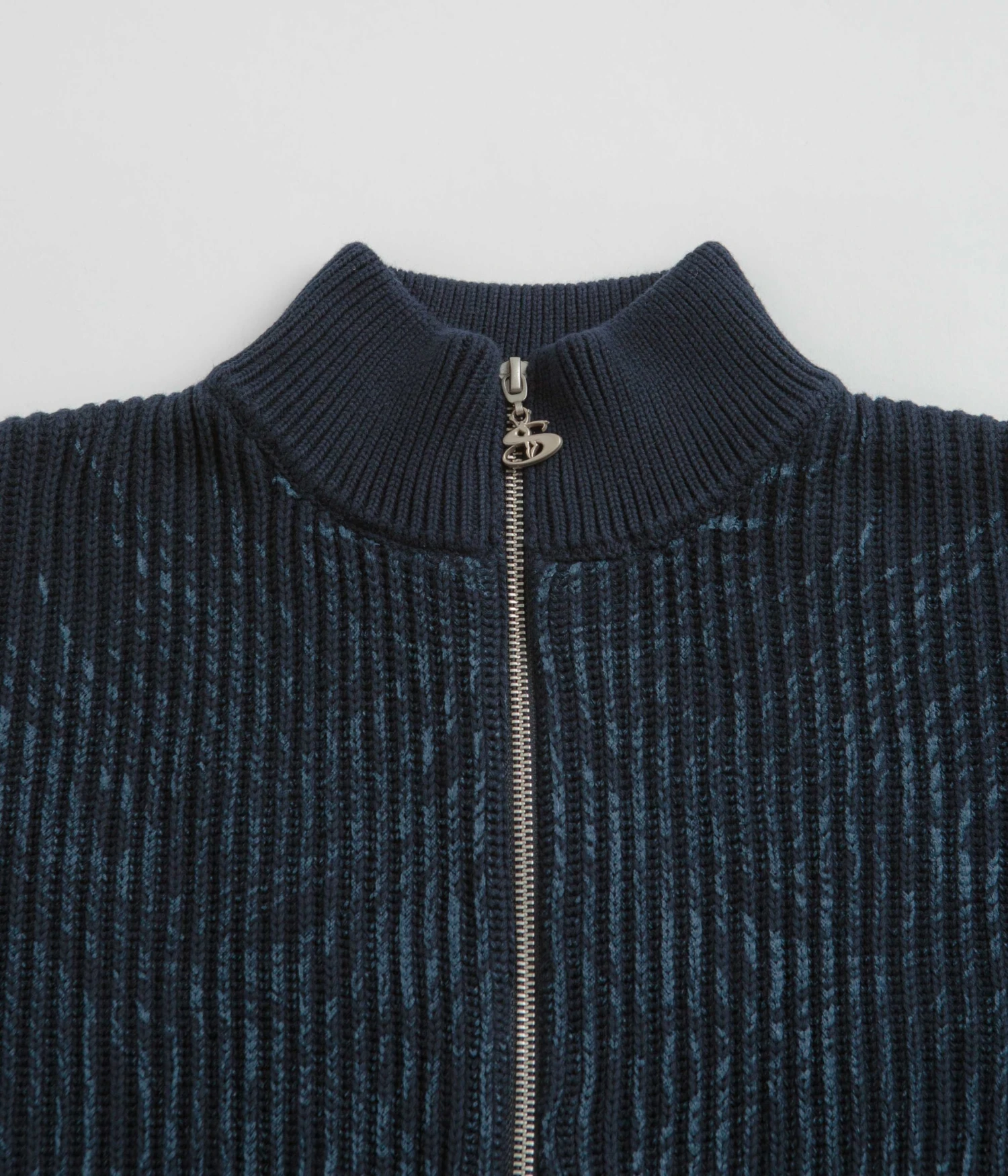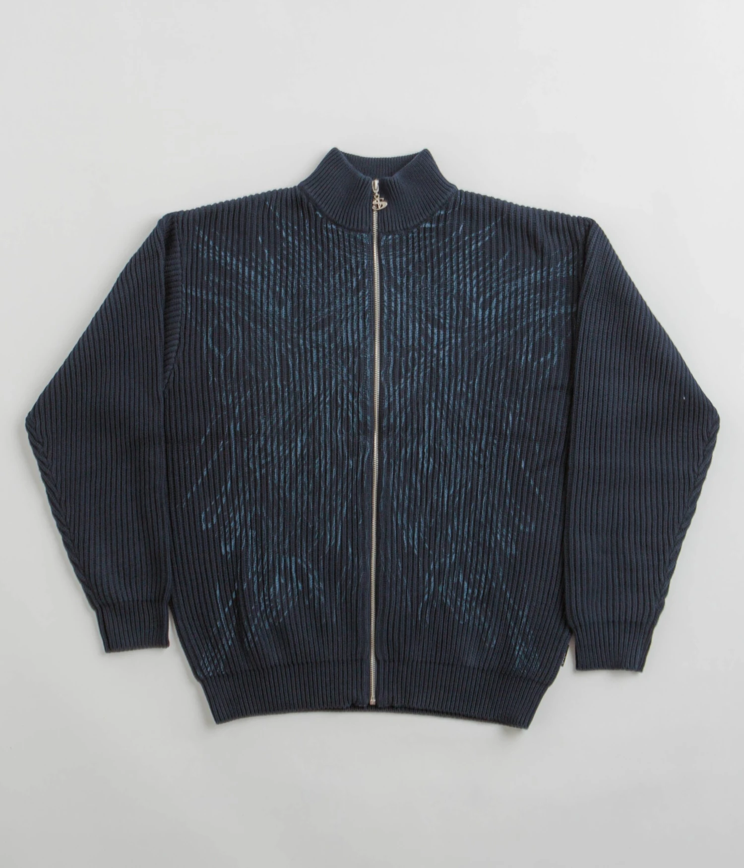 Yardsale Ripper Knit Zip Sweatshirt in Navy. Arriving as part of the brand’s latest release, this regular fitting Yardsale sweatshirt is made from 100% cotton. Featuring a high-neck collar and a full length zipper fastening, this navy Yardsale sweater is finished with a rib knit collar, a woven elastic hem, printed ripper artwork and a custom zip pull.
