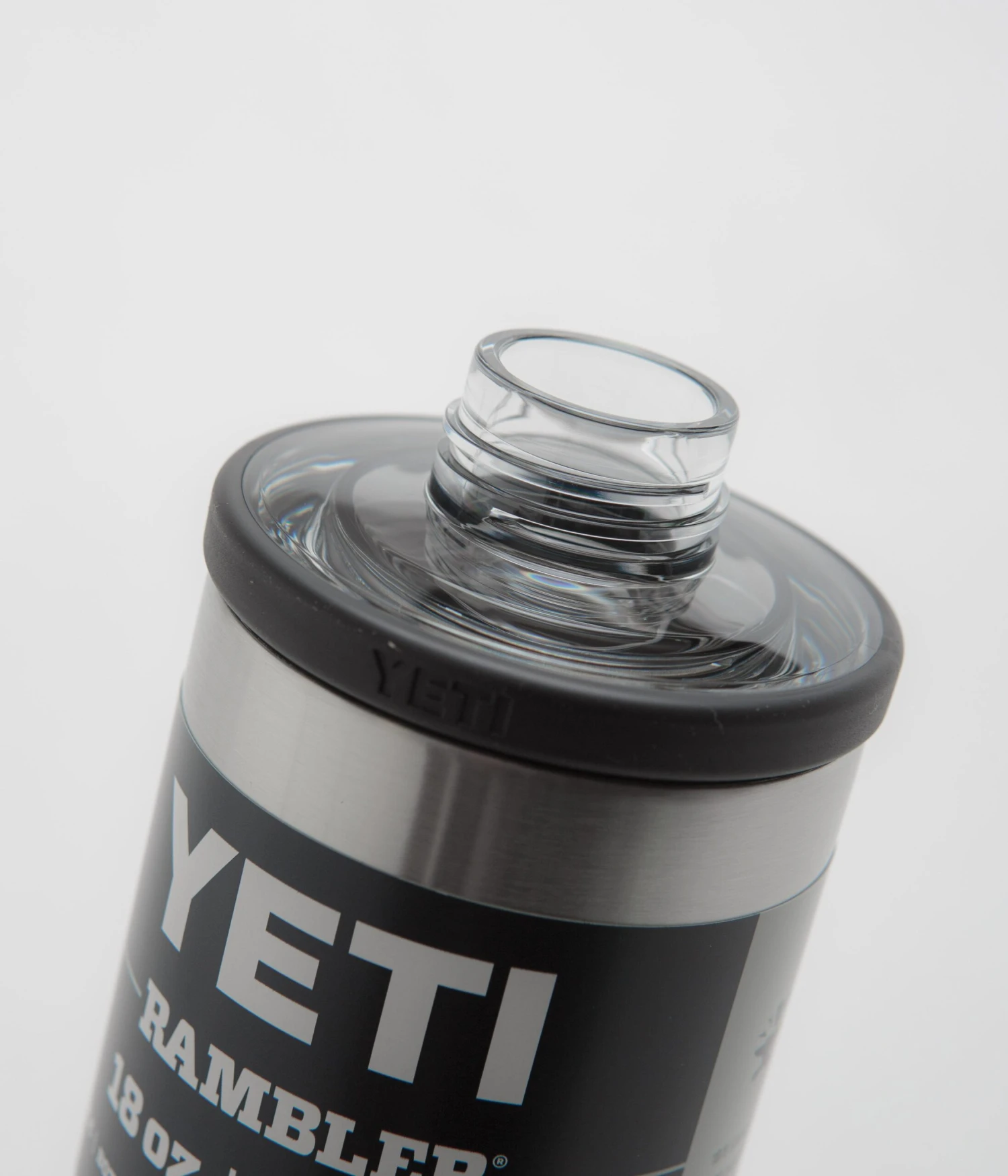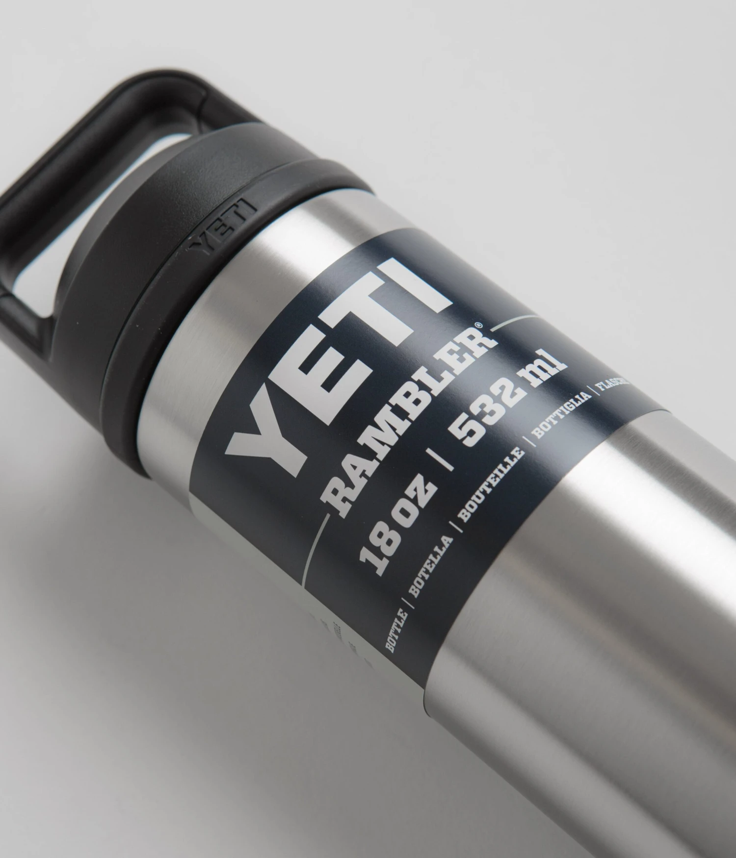 Yeti Chug Cap Rambler Bottle 18oz in Stainless Steel. Made from 18/8 stainless steel with double-wall vacuum insulation, this Yeti Rambler Bottle is designed with a removable Chug Cap topper. Dishwasher safe with a fluid capacity of up to 532ml, this steel Yeti bottle is ideal for travel, commuting and everyday use.