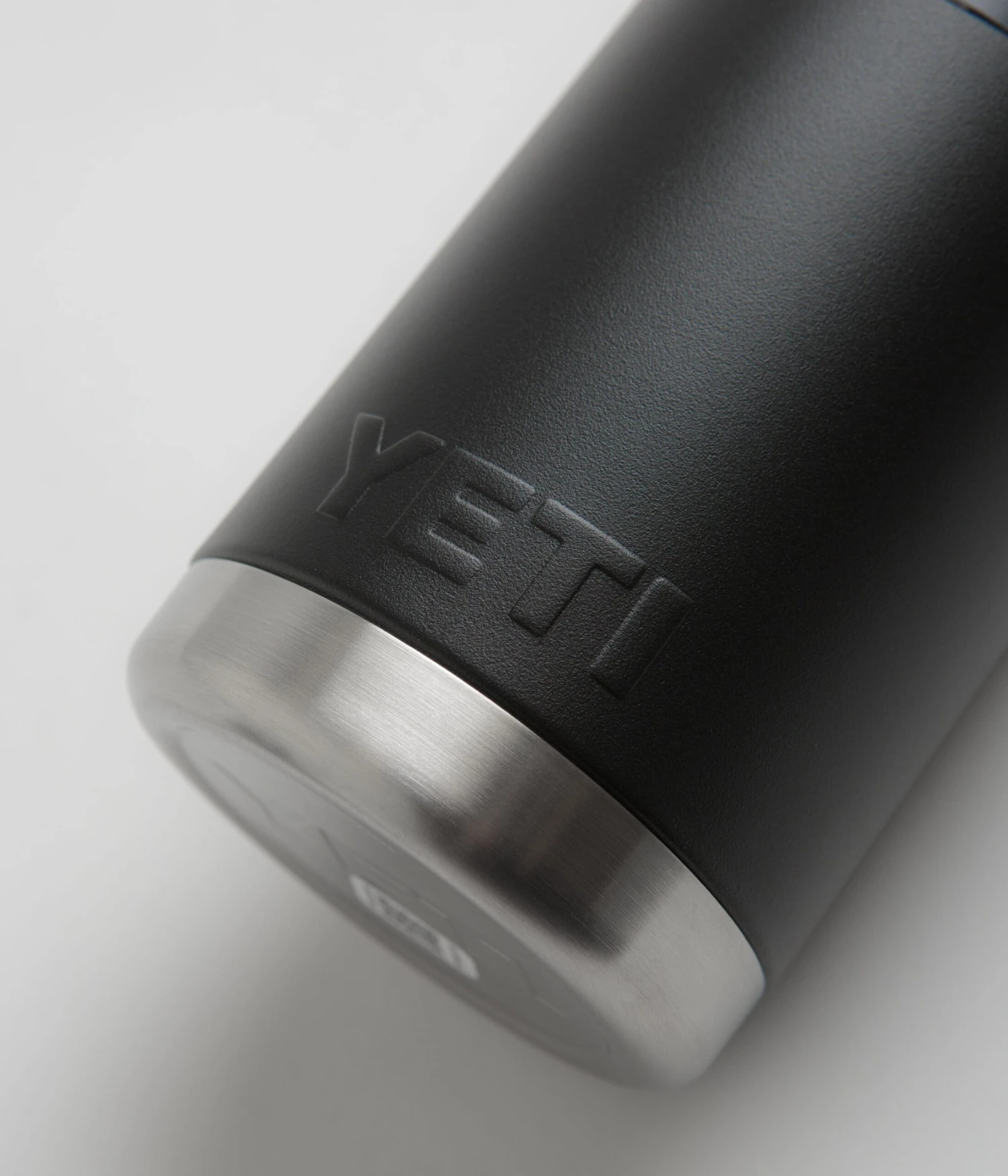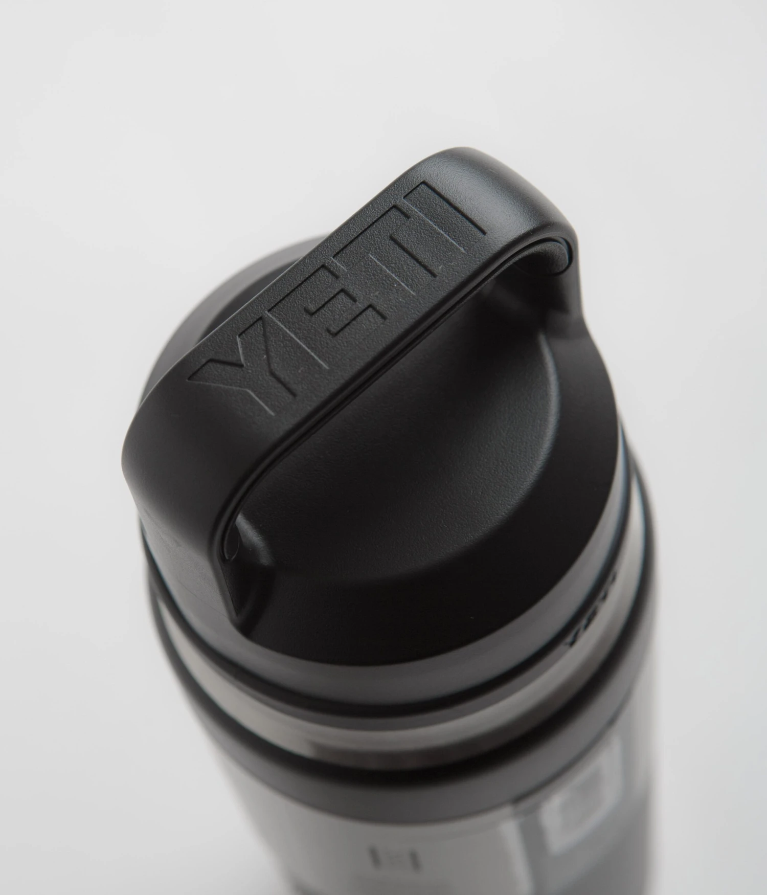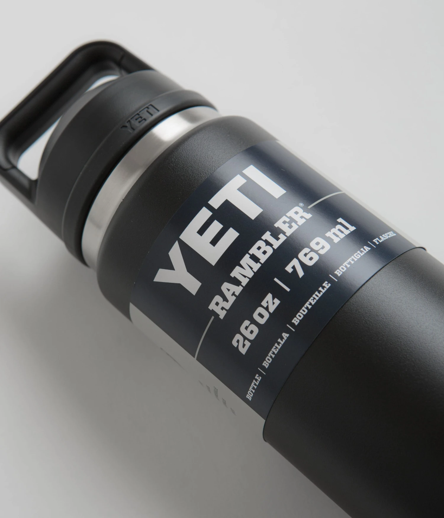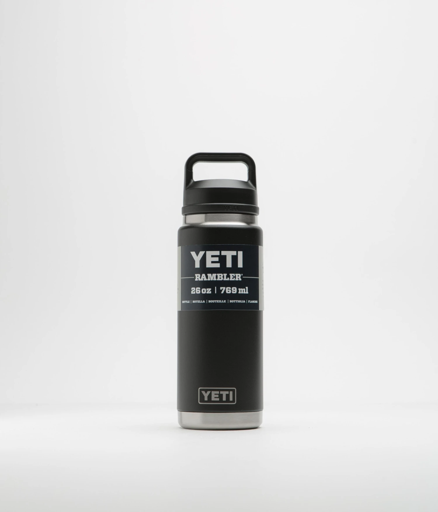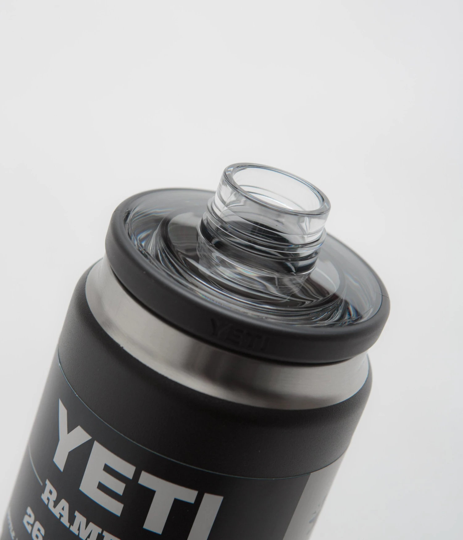 Yeti Chug Cap Rambler Bottle 26oz in Black. Designed with a fluid capacity of up to 760ml, this Yeti Rambler Bottle is made from 18/8 stainless steel with double-wall vacuum insulation. Featuring a removable Chug Cap topper and a dishwasher safe construction, this black Yeti bottle is ideal for everyday, travel and commuting use.
