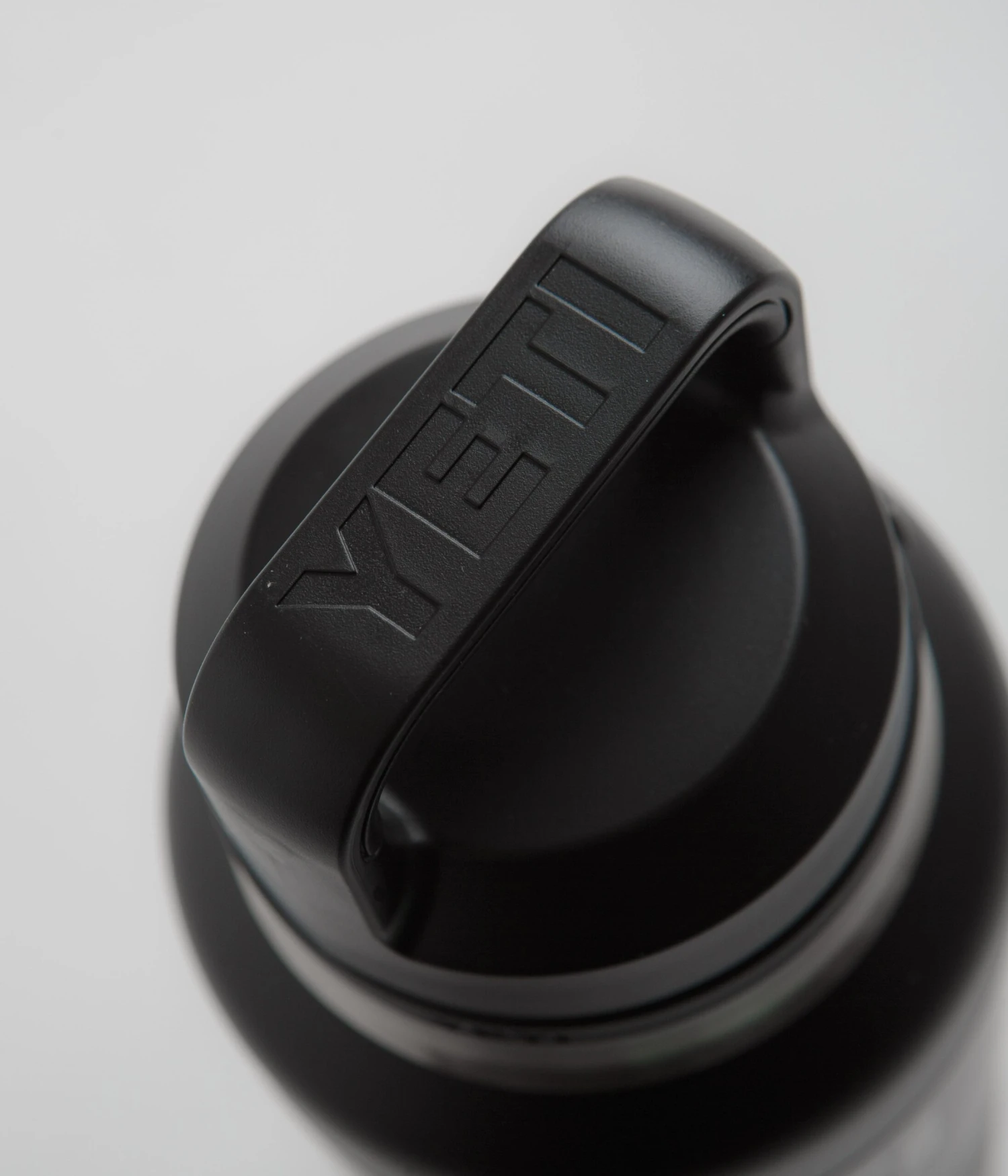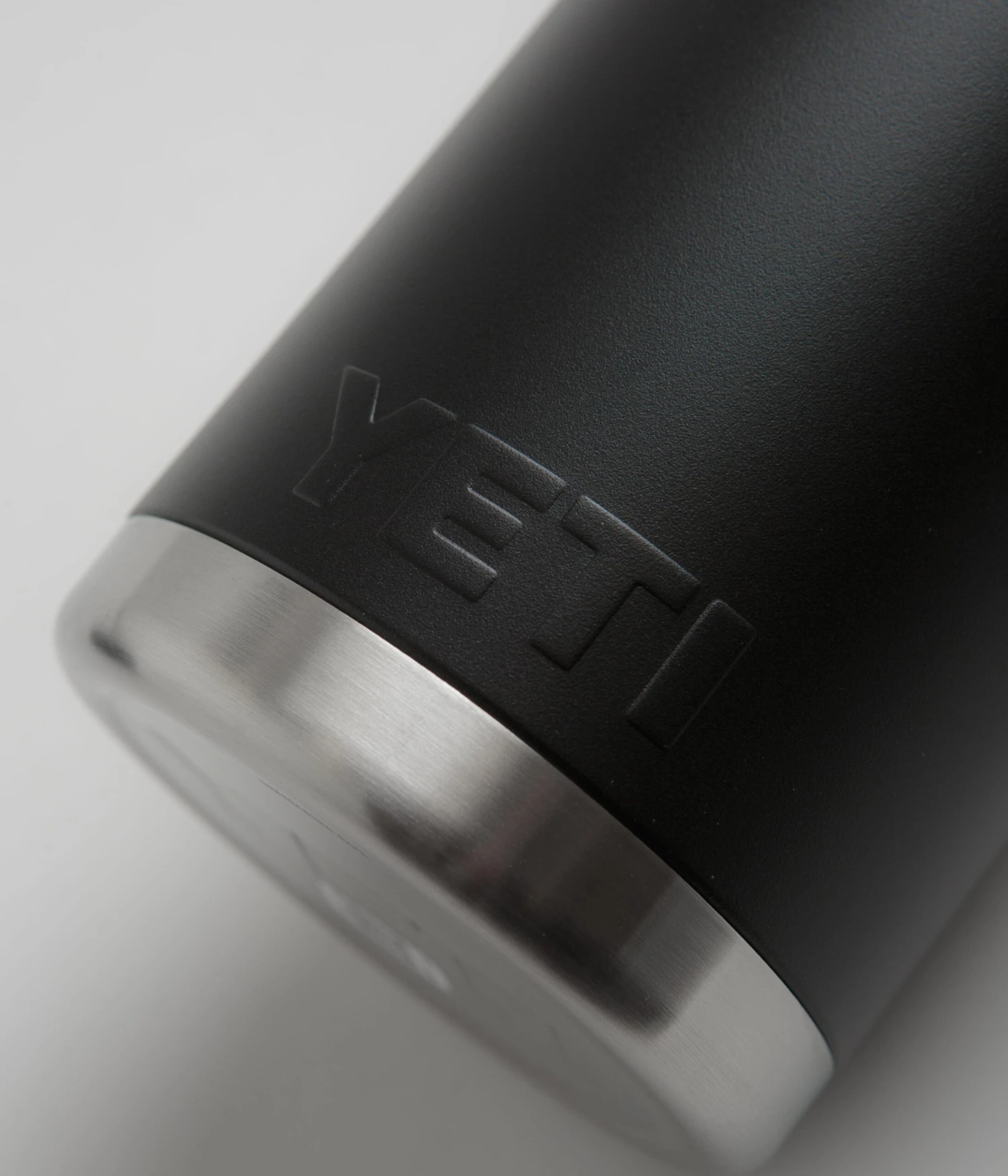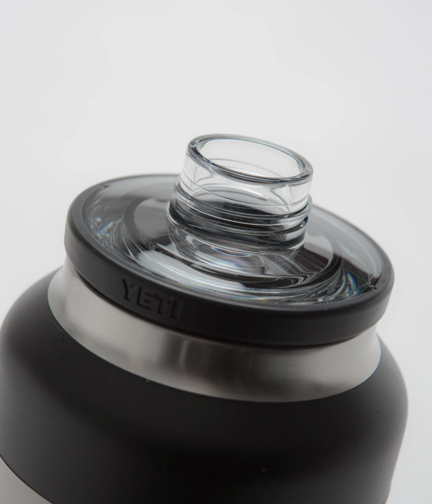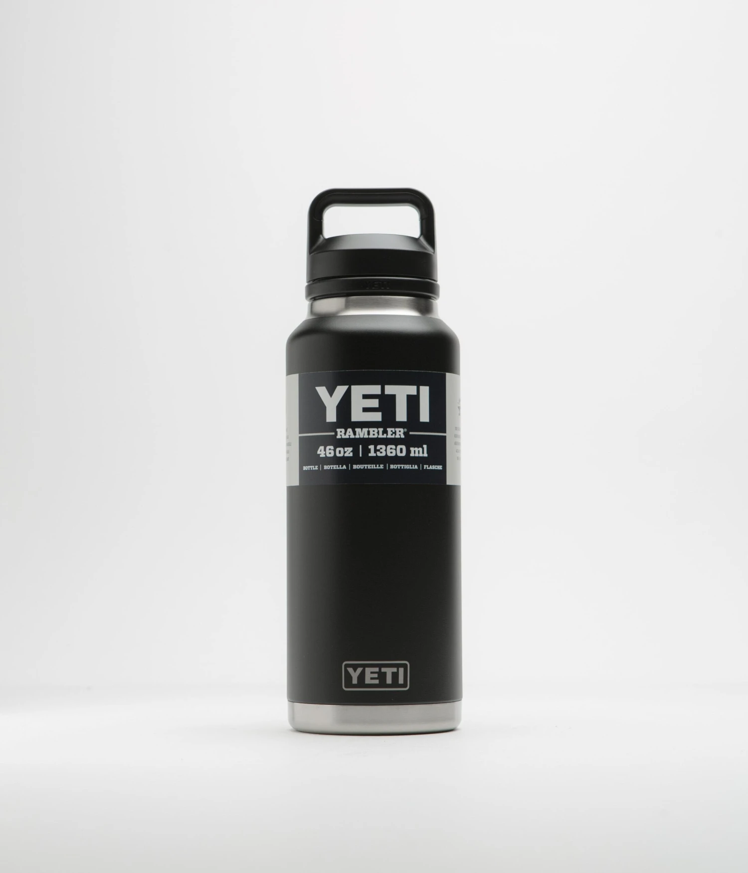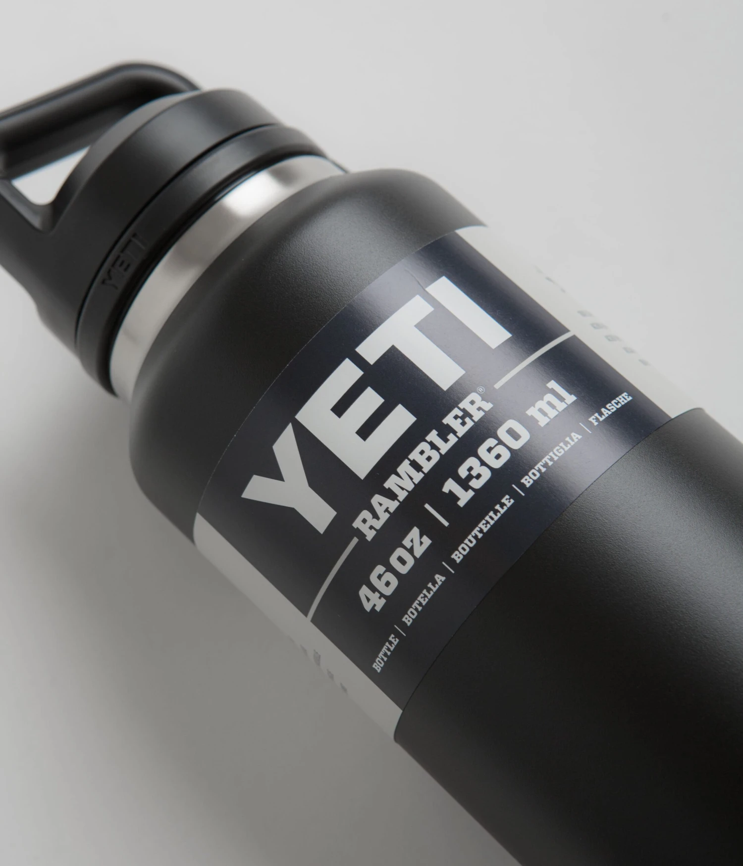 Yeti Chug Cap Rambler Bottle 46oz in Black. Dishwasher safe and made from 18/8 stainless steel, this Yeti Rambler Bottle is designed with double-wall vacuum insulation. Featuring a removable Chug Cap topper and a fluid capacity of up to 1.4 litres, this black Yeti bottle is ideal for everyday, travel and commuting use.