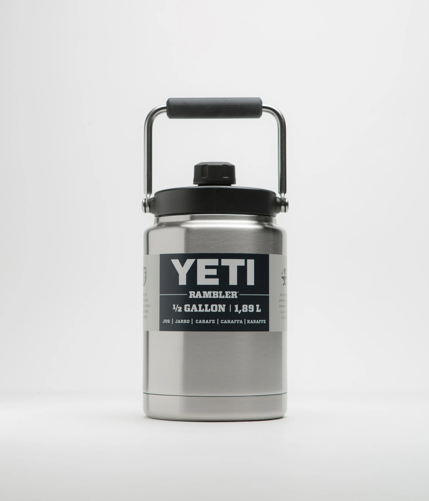 Yeti Rambler Jug 1/2 Gallon in Stainless Steel. Styled with a 1.9L capacity with FatLidâ„¢ insulation, this stainless steel Yeti Rambler jug is a heavy duty drinkware accessory built for everyday use. Featuring a durable haul handle, a MagCapâ„¢ dock and a MagCapâ„¢ topper, this steel Yeti jug is designed to keep fluids ice-cold or piping hot. Finished with classic Yeti badging embossed across the front.