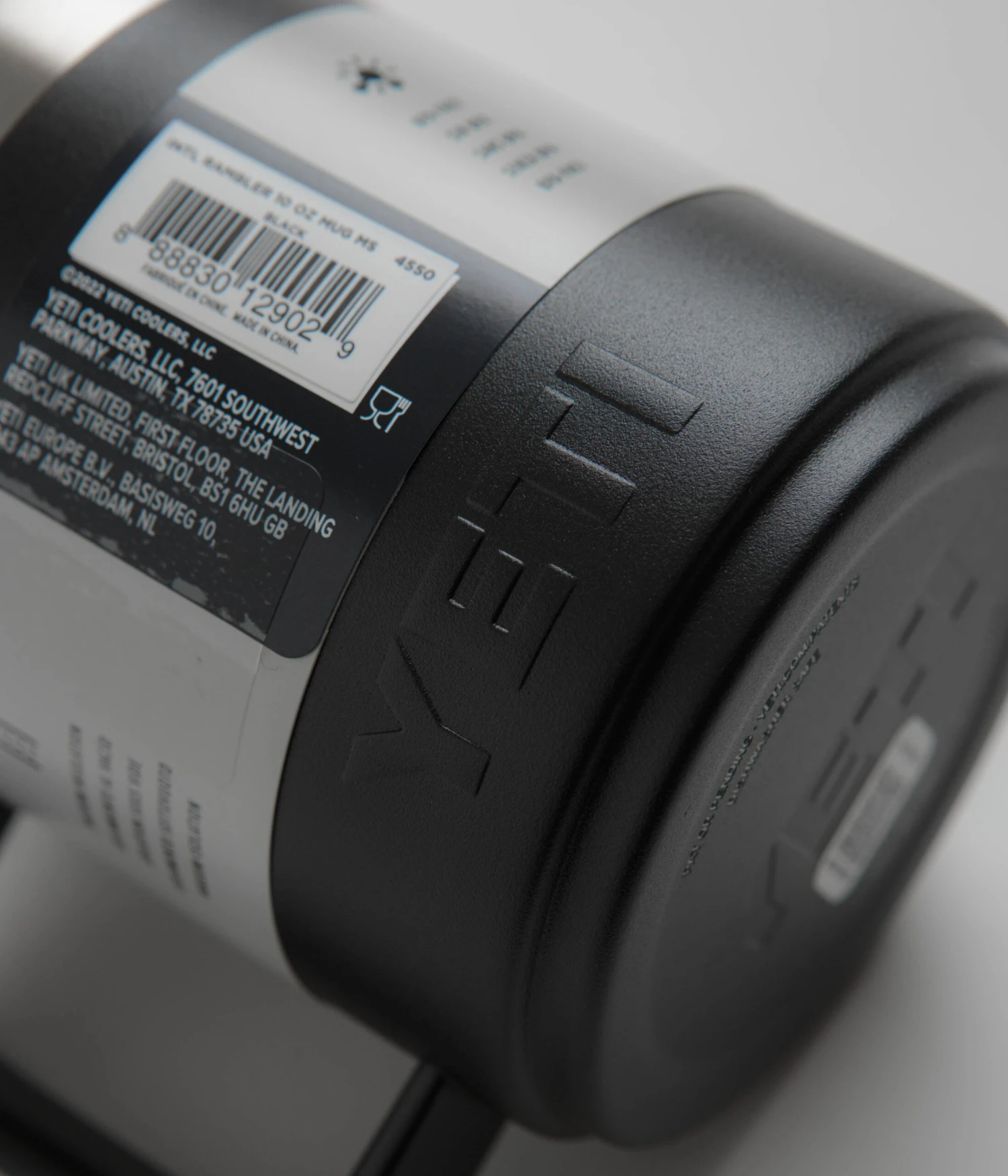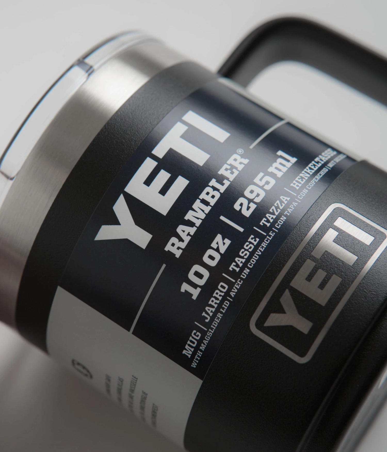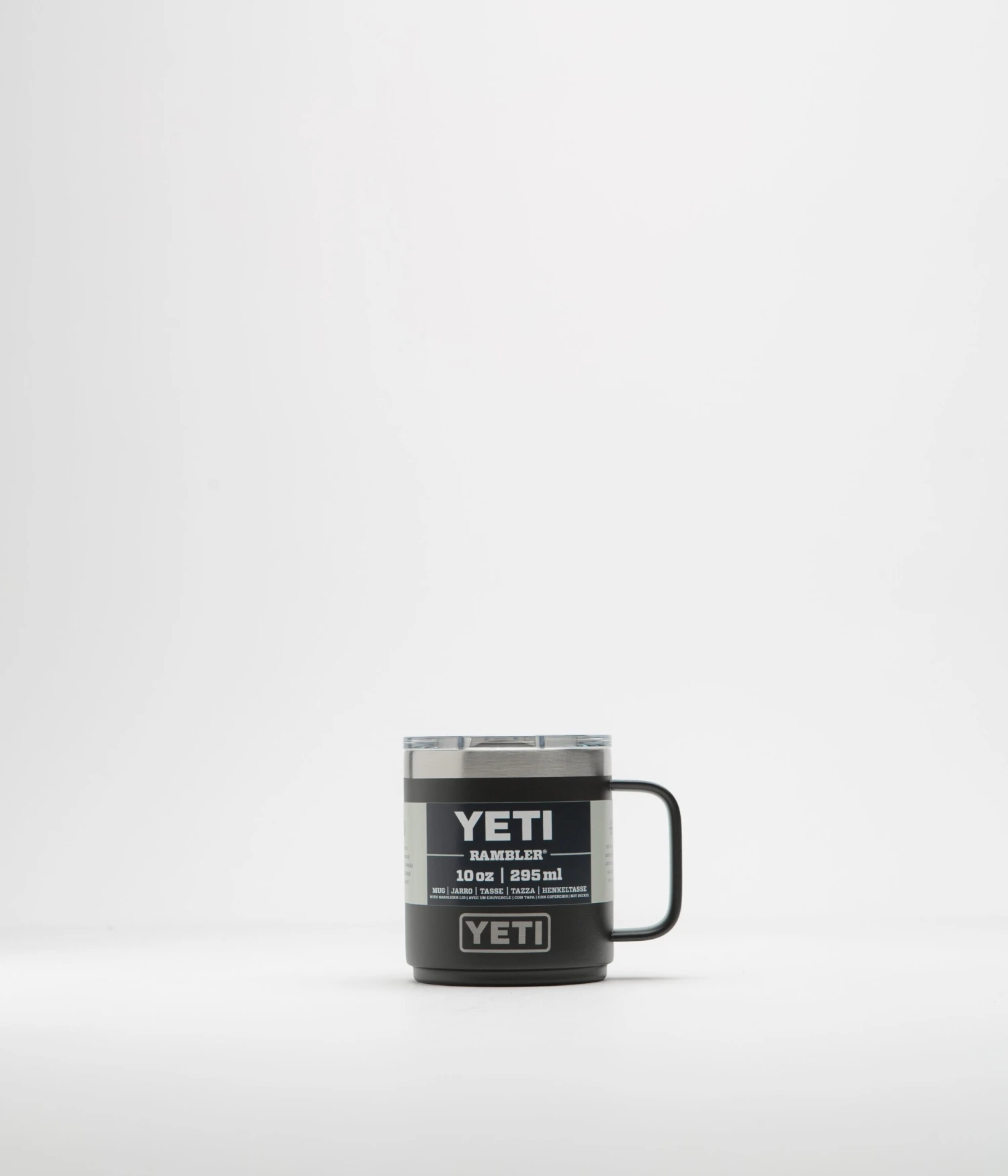 Yeti Rambler Mug 10oz in Black. Styled with top-to-bottom insulation with double-wall vacuum technology, this 296ml Yeti Rambler mug is ideal for use whilst travelling, camping or whilst commuting. Stackable and featuring a removable MagSliderâ„¢ lid and a durable side handle, this black Yeti mug is dishwasher safe and finished with classic Yeti badging.