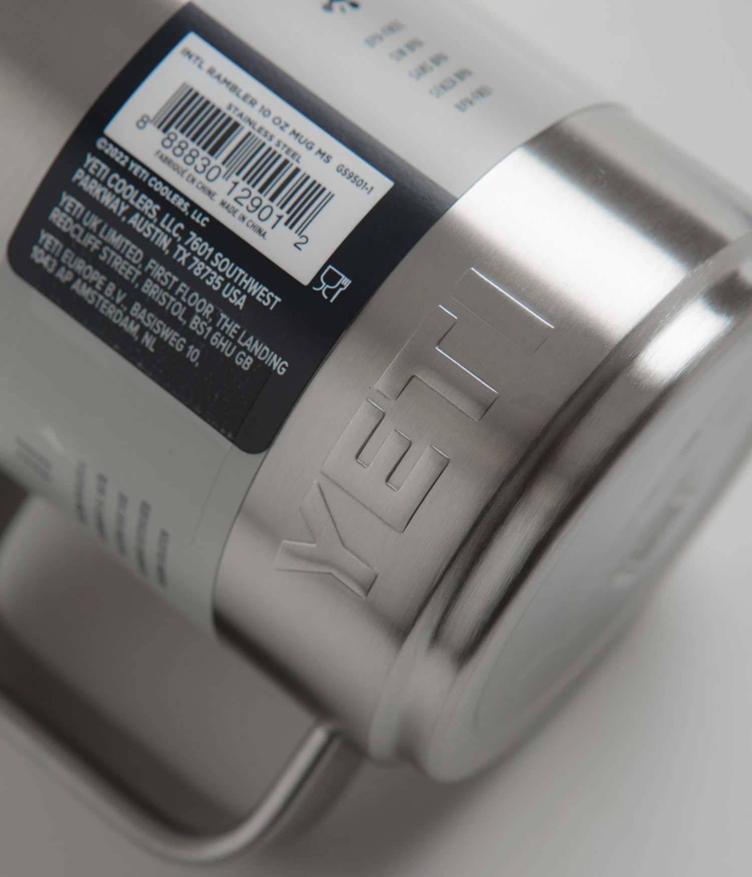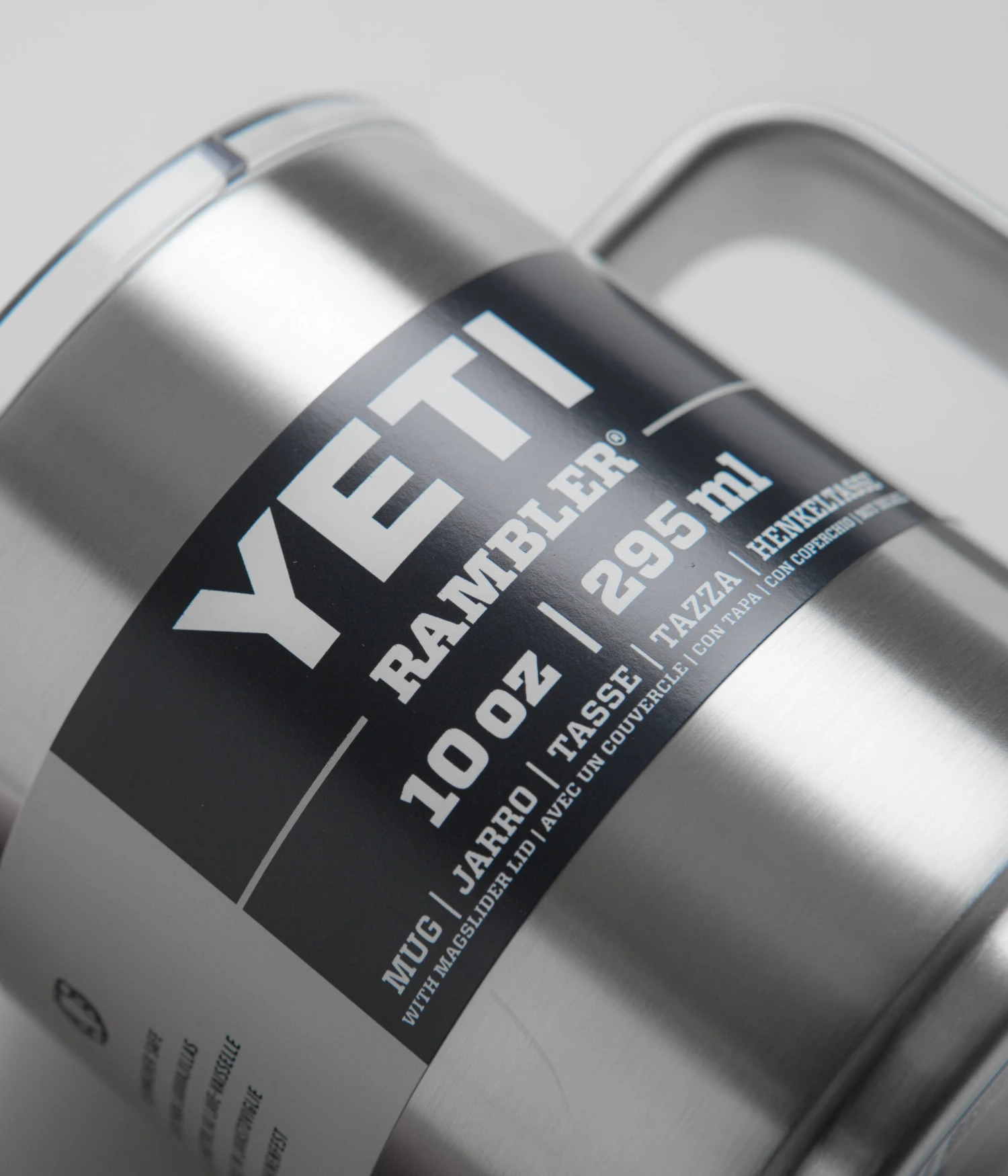 Yeti Rambler Mug 10oz in Stainless Steel. Made from 18/8 stainless steel with double-wall vacuum insulation technology, this 296ml Yeti Rambler mug is ideal for everyday use and for use whilst travelling. Featuring a stackable construction, a durable side handle and a removable MagSliderâ„¢ lid, this steel Yeti mug is dishwasher safe and is finished with embossed Yeti branding.